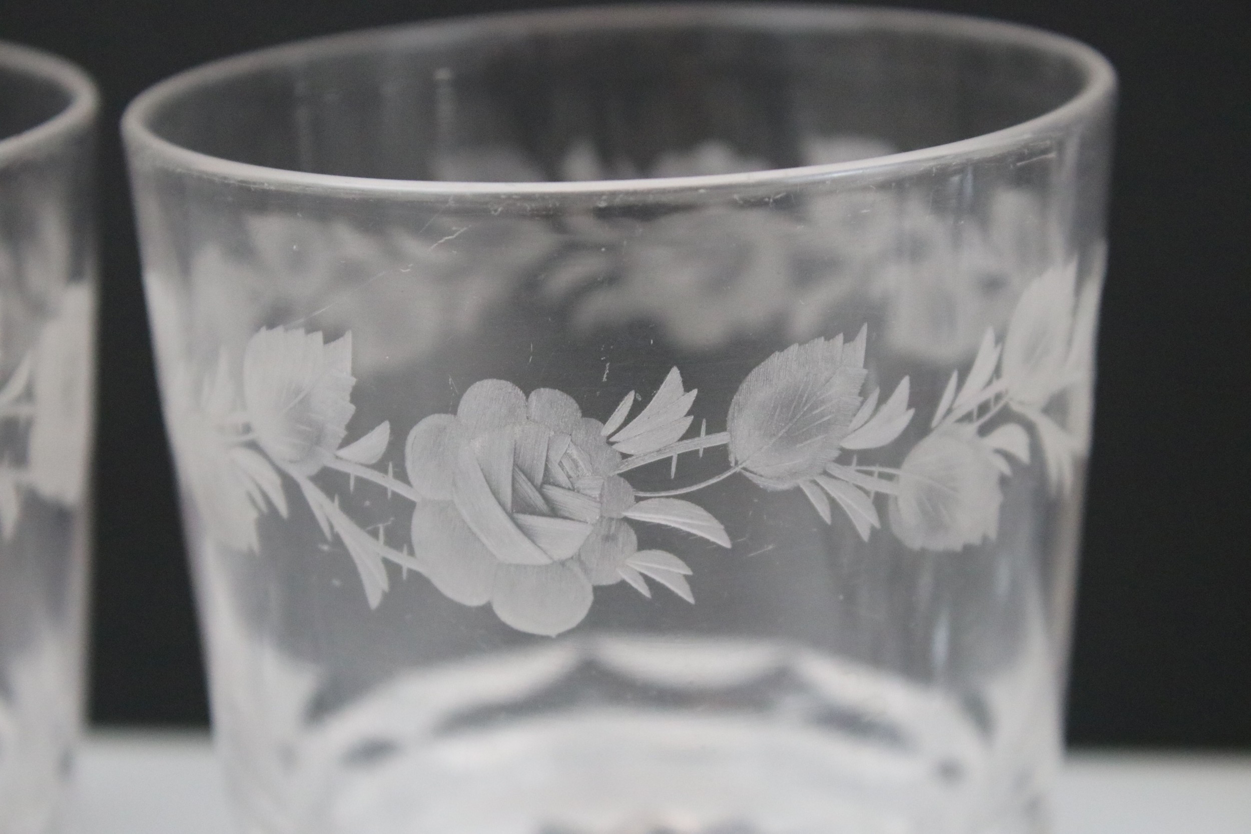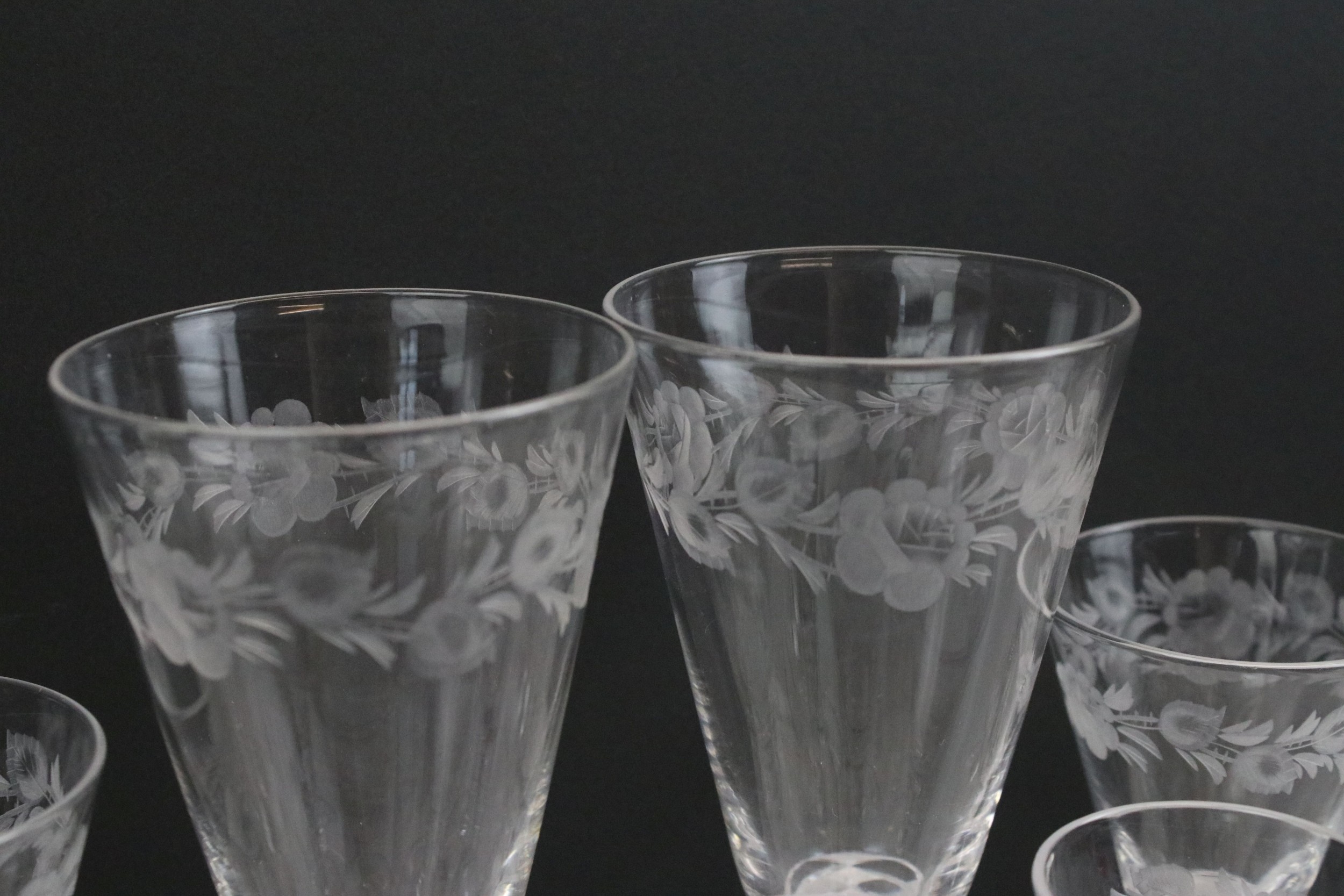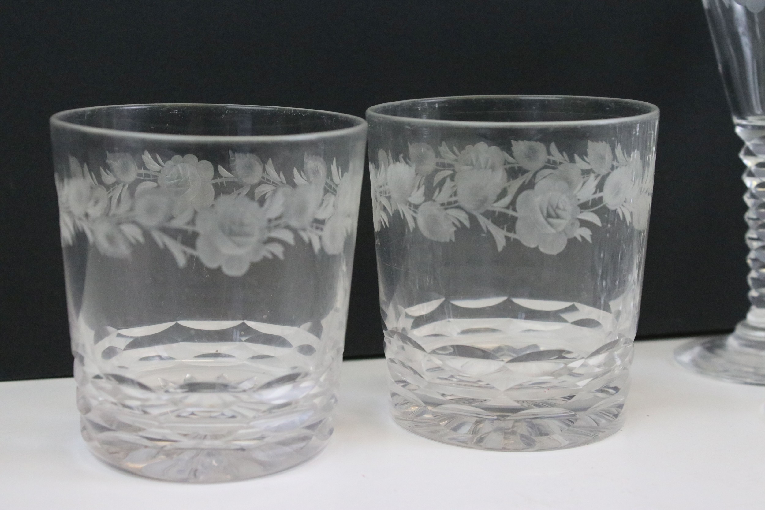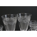 Set of Stuart crystal glasses, to comprise four tumblers, wine and liqueur glasses, each decorated with an etched floral pattern (15)