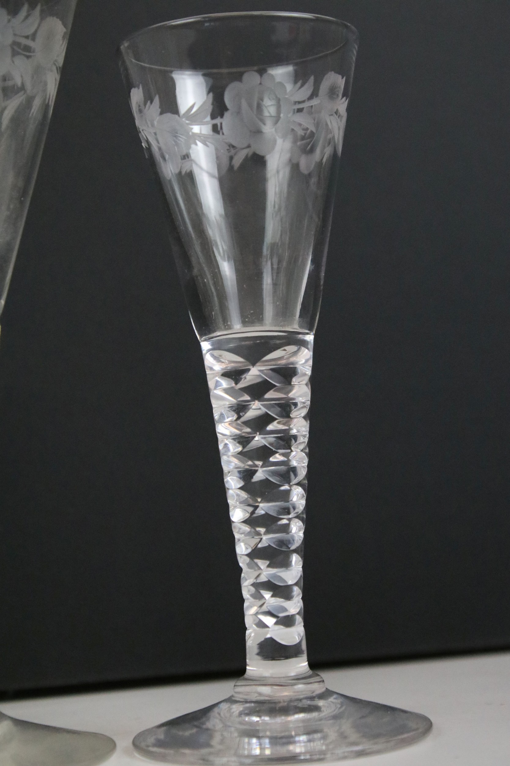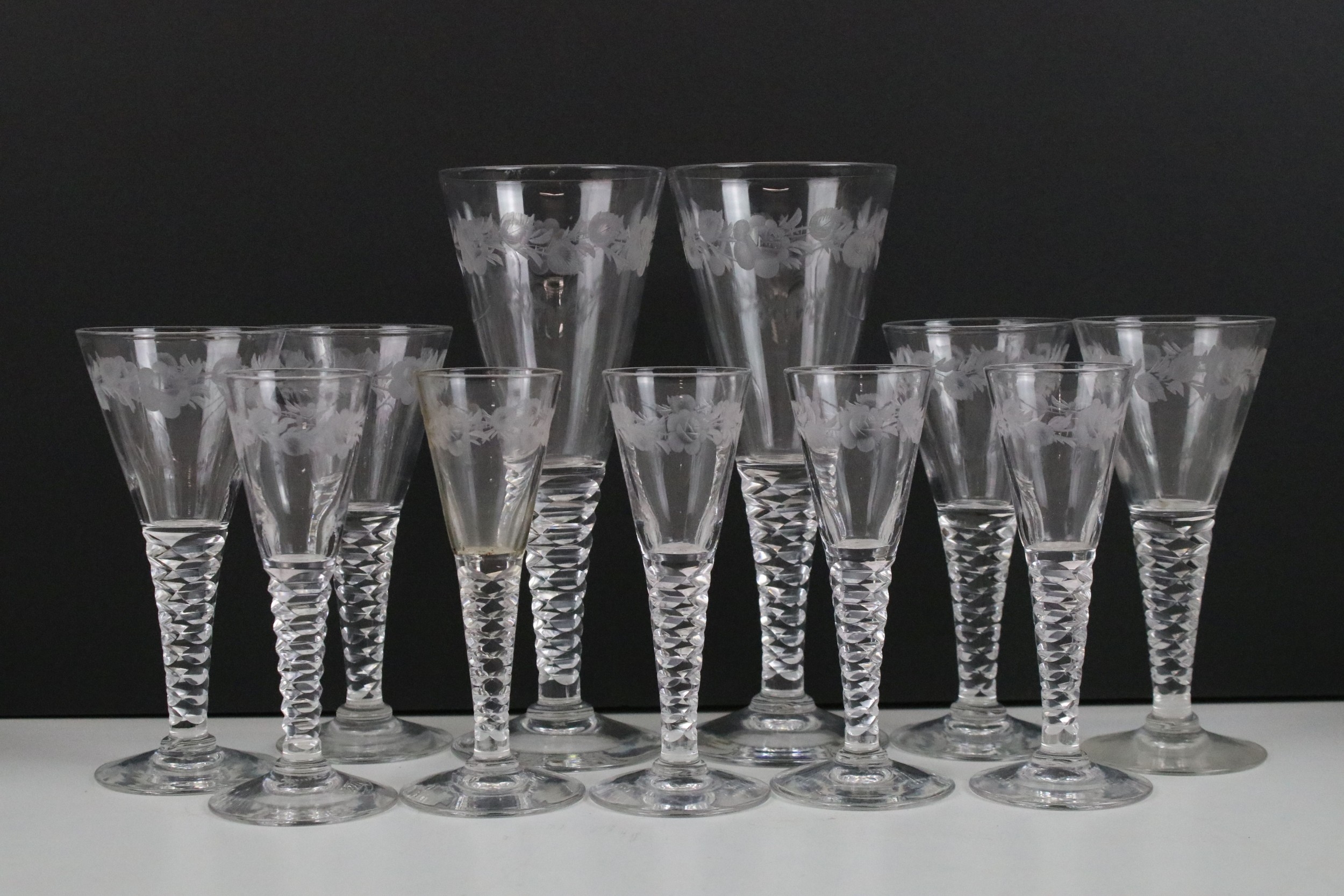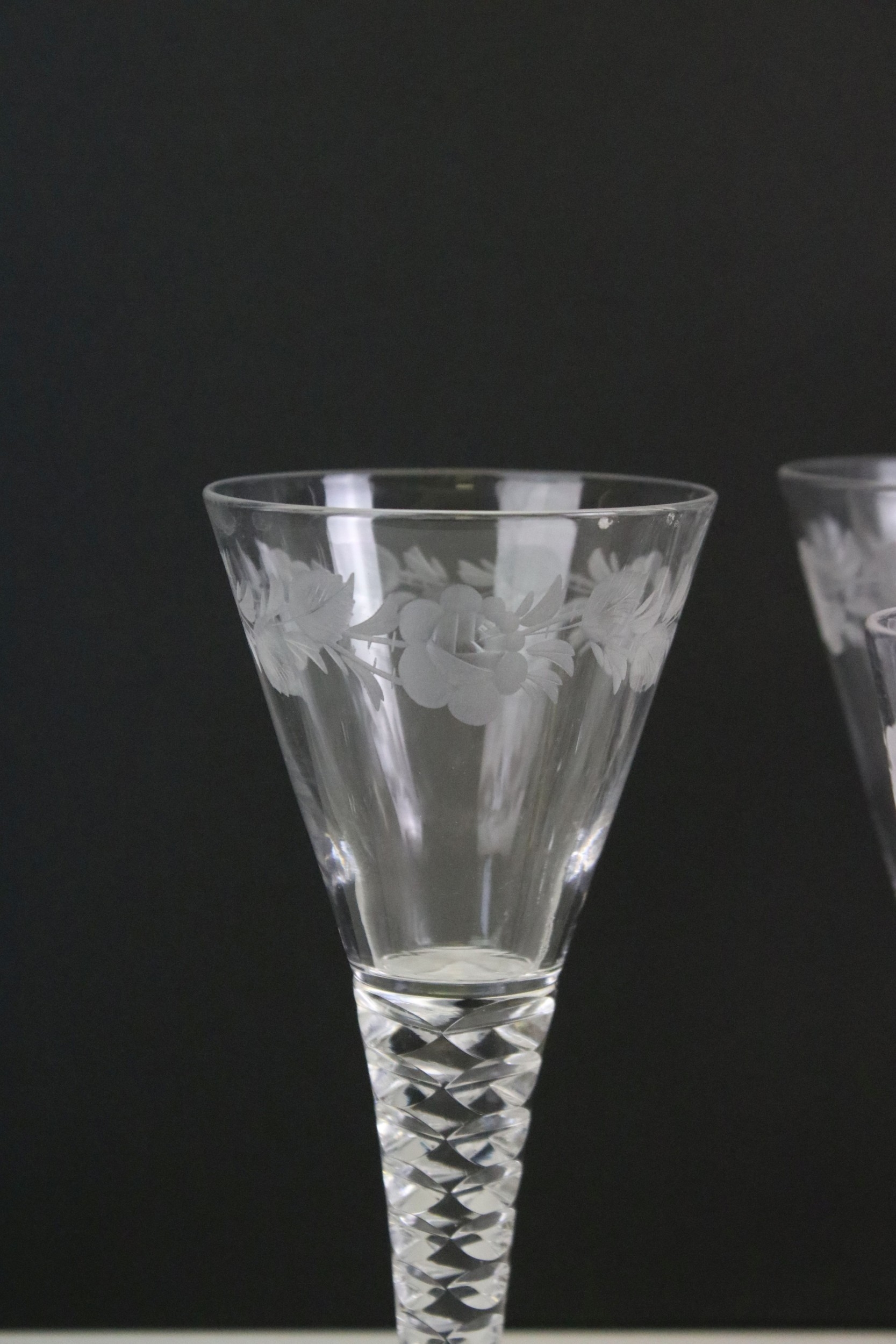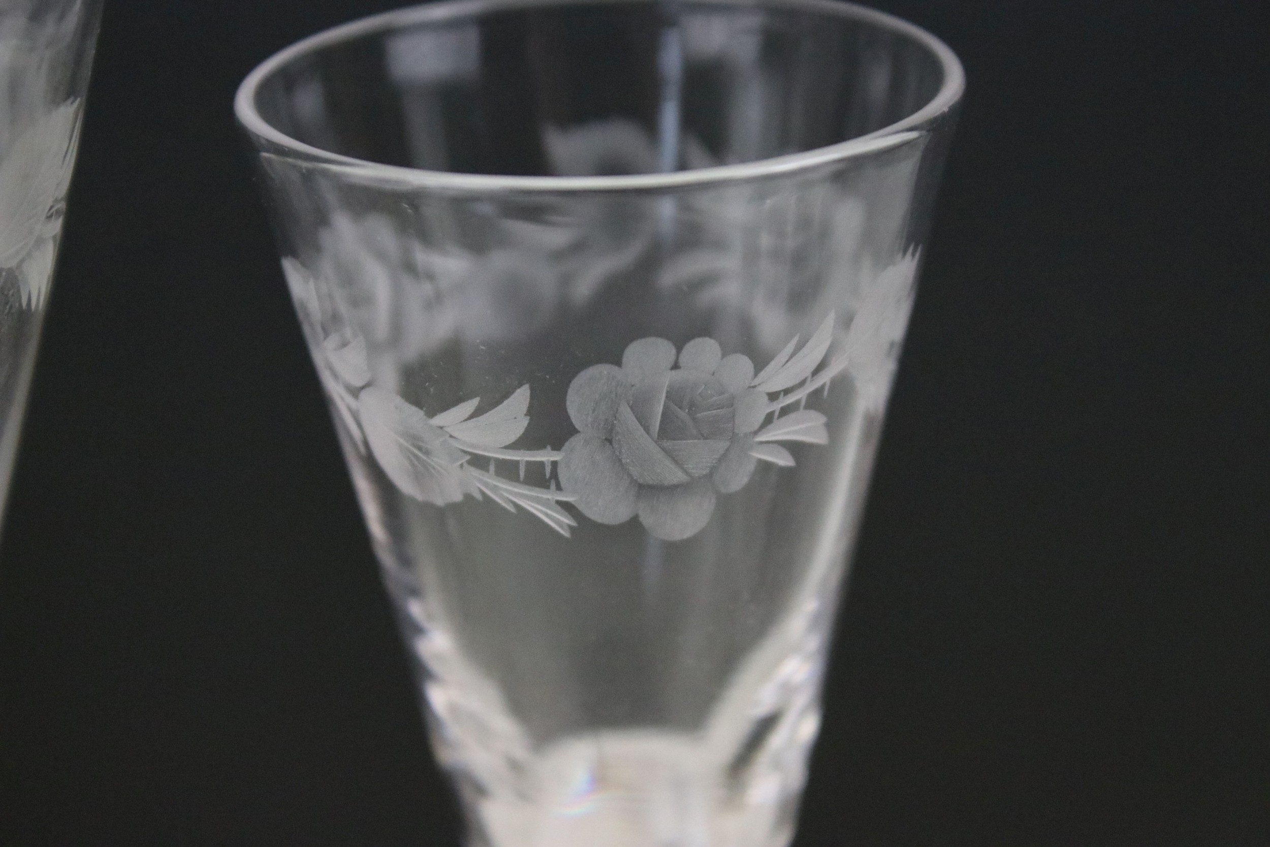 Set of Stuart crystal glasses, to comprise four tumblers, wine and liqueur glasses, each decorated with an etched floral pattern (15)