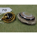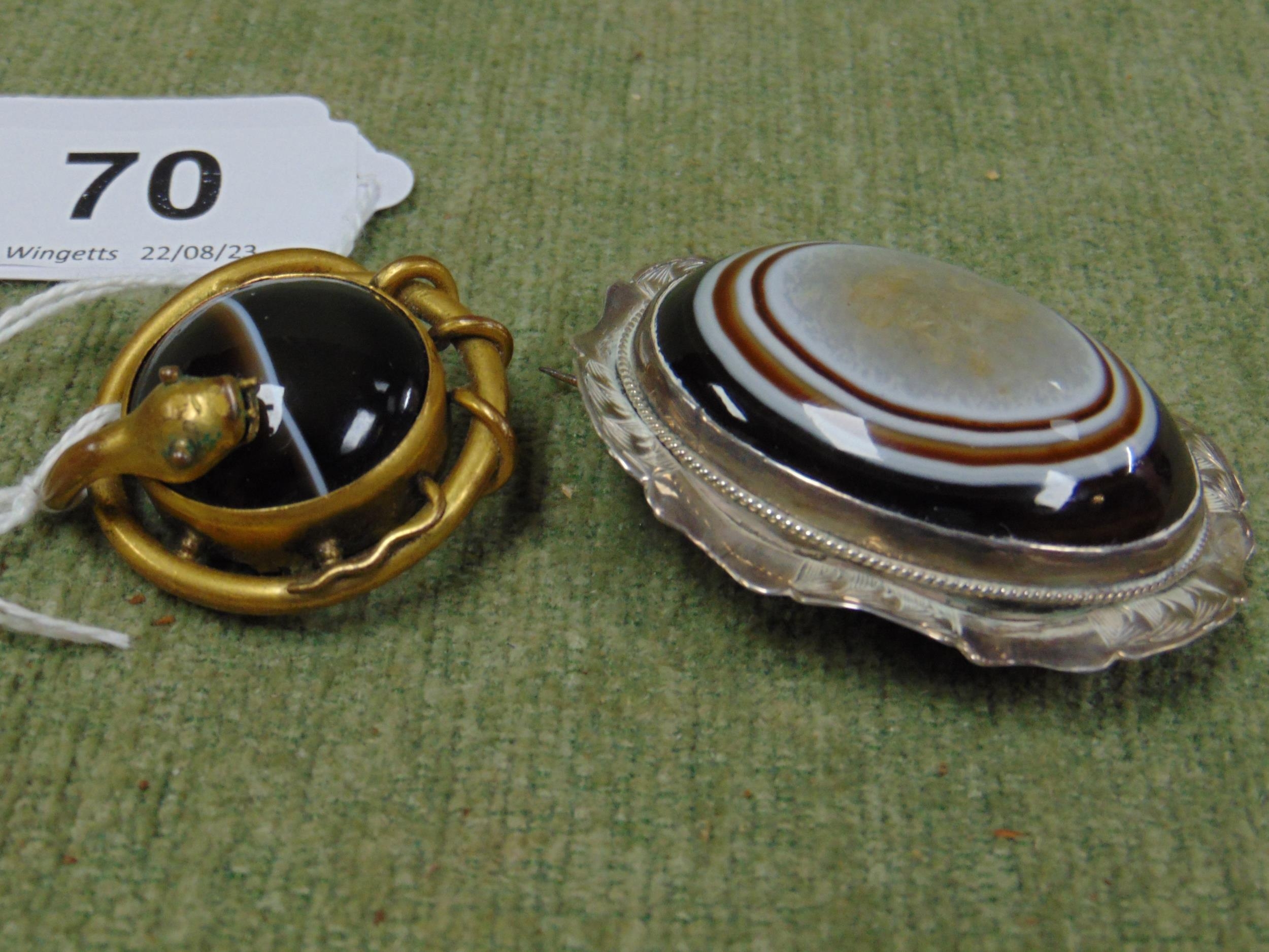 Banded Agate brooch, contained in a plated frame, together with a tiger's eye brooch, contained in a serpent form frame. (2)
