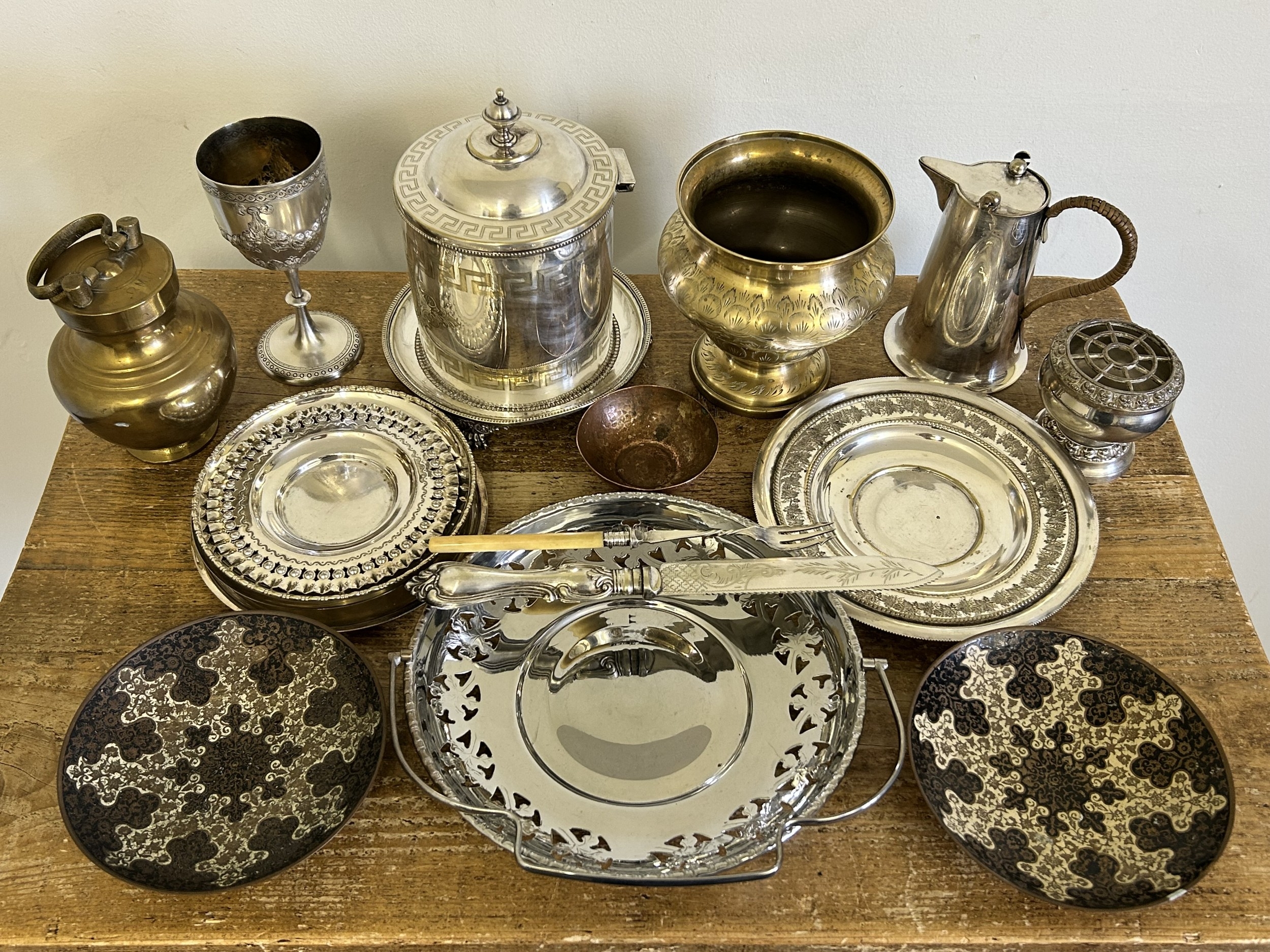 A selection of mixed vintage metalwares including a biscuit barrel, goblet etc