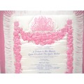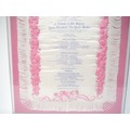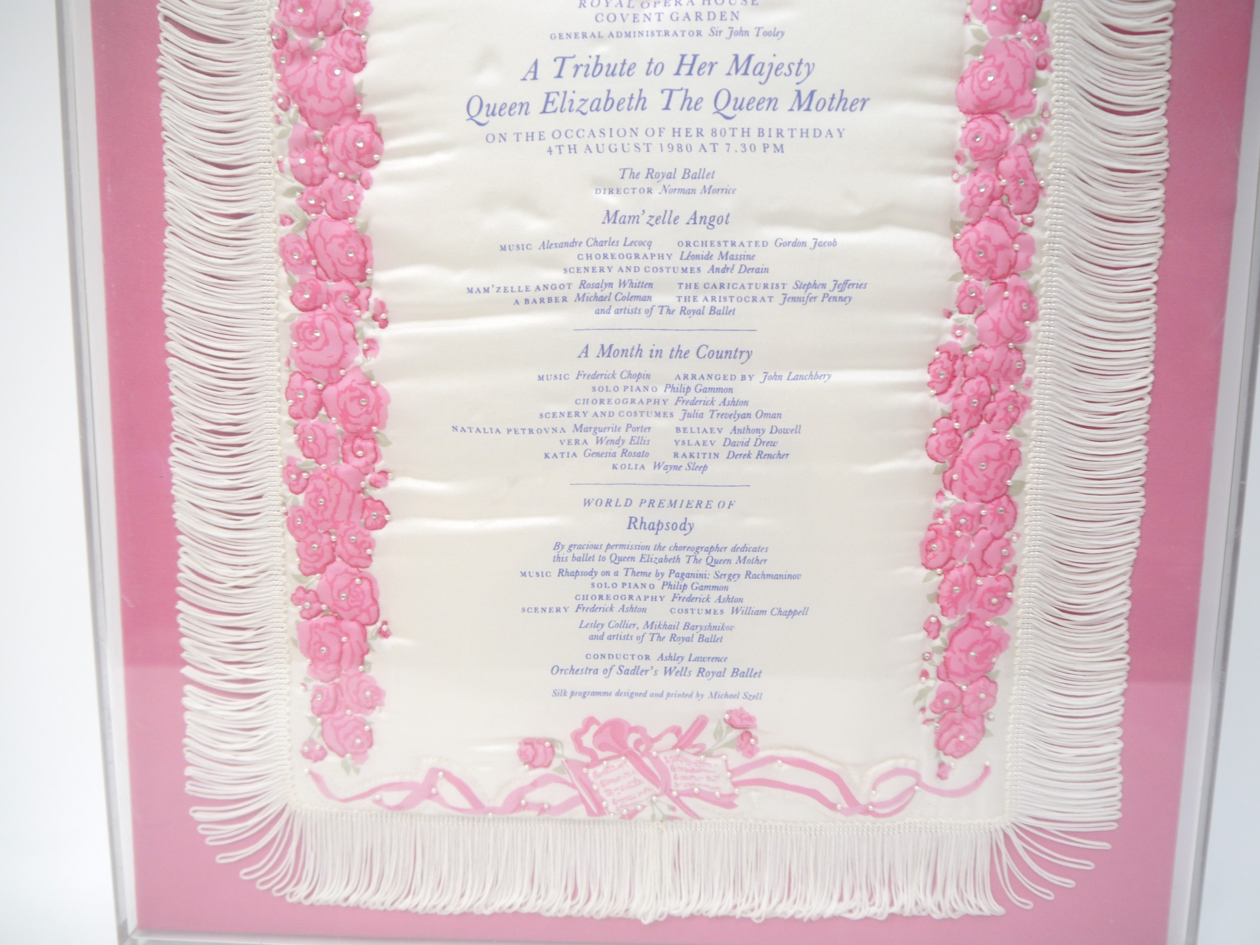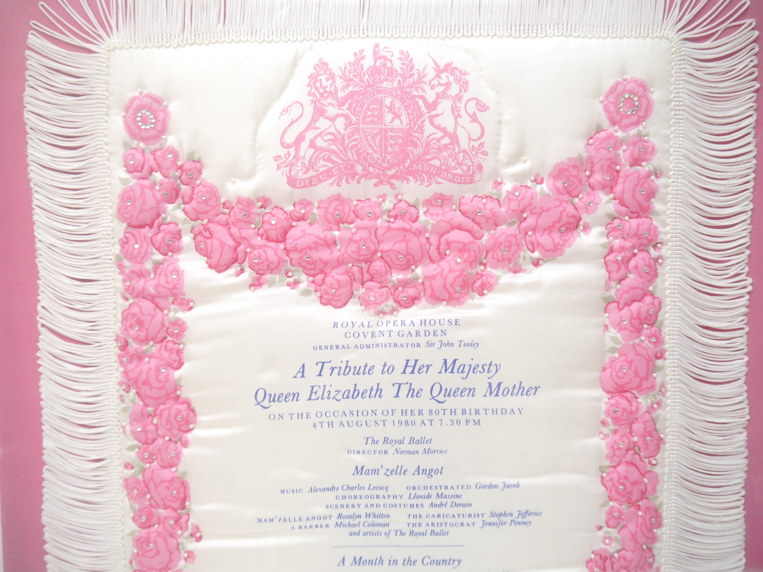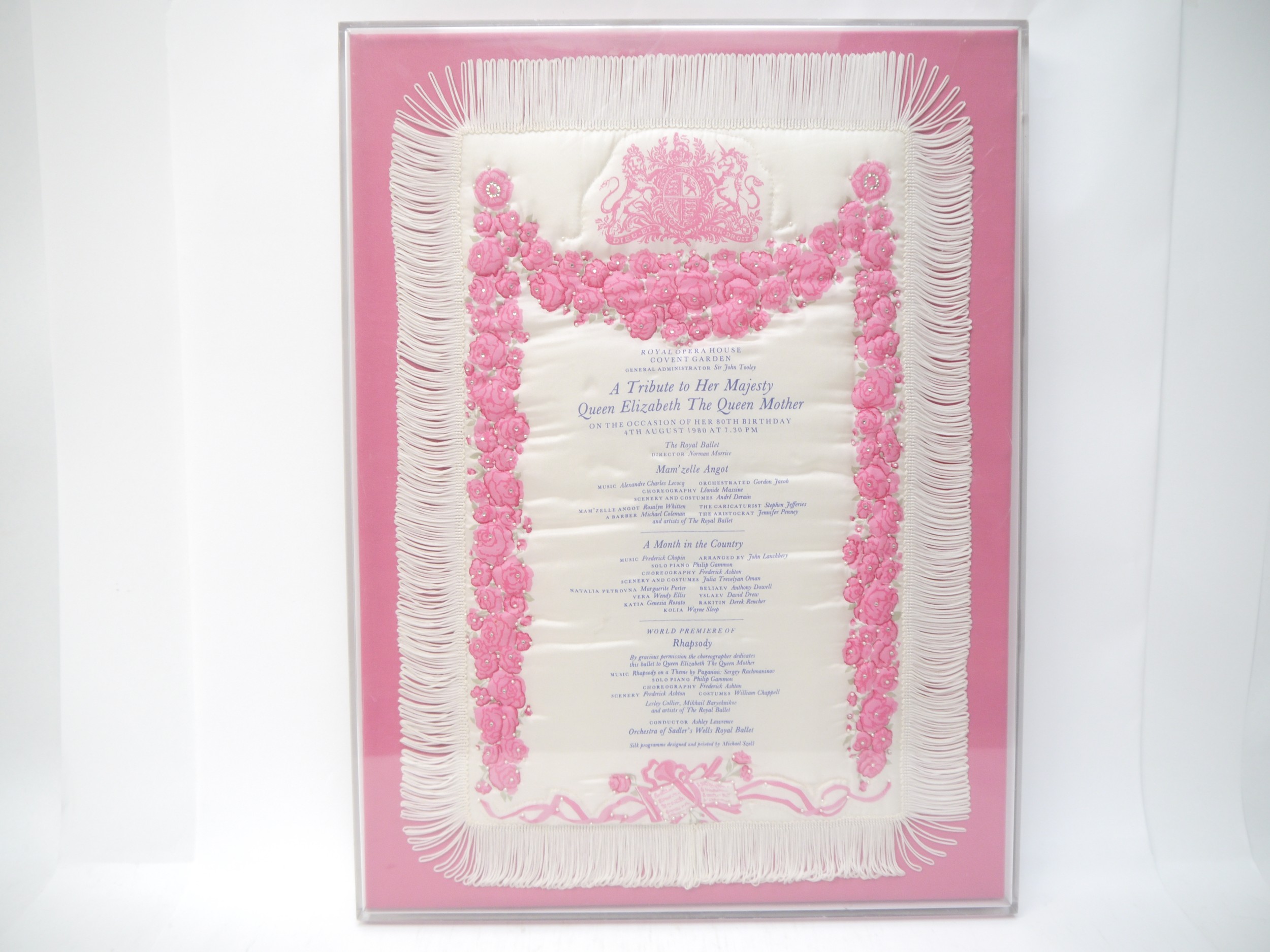 (Queen Elizabeth The Queen Mother) A commemorative silk souvenir programme, Royal Opera House, Covent Garden, 'A Tribute to Her Majesty Queen Elizabeth The Queen Mother On the Occasion of Her 80th Birthday 4th August 1980...The Royal Ballet...Mam'zelle Angot...A Month in the Country...World Premiere of Rhapsody', large commemorative silk programme, pink floral decorated on cream ground, Royal Coat of Arms, embellished with paste style decoration, fringed edging, approx. size 58 x 40cm, mounted on pink textile covered board, housed loose in perspex display, the whole approx. 62 x 47cm (E) £15-20