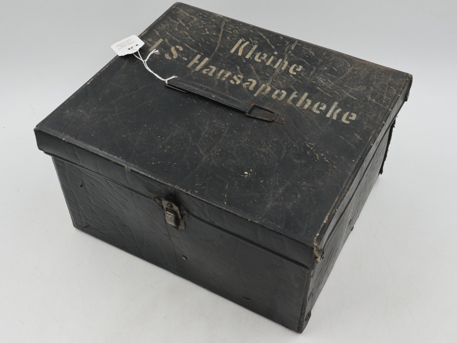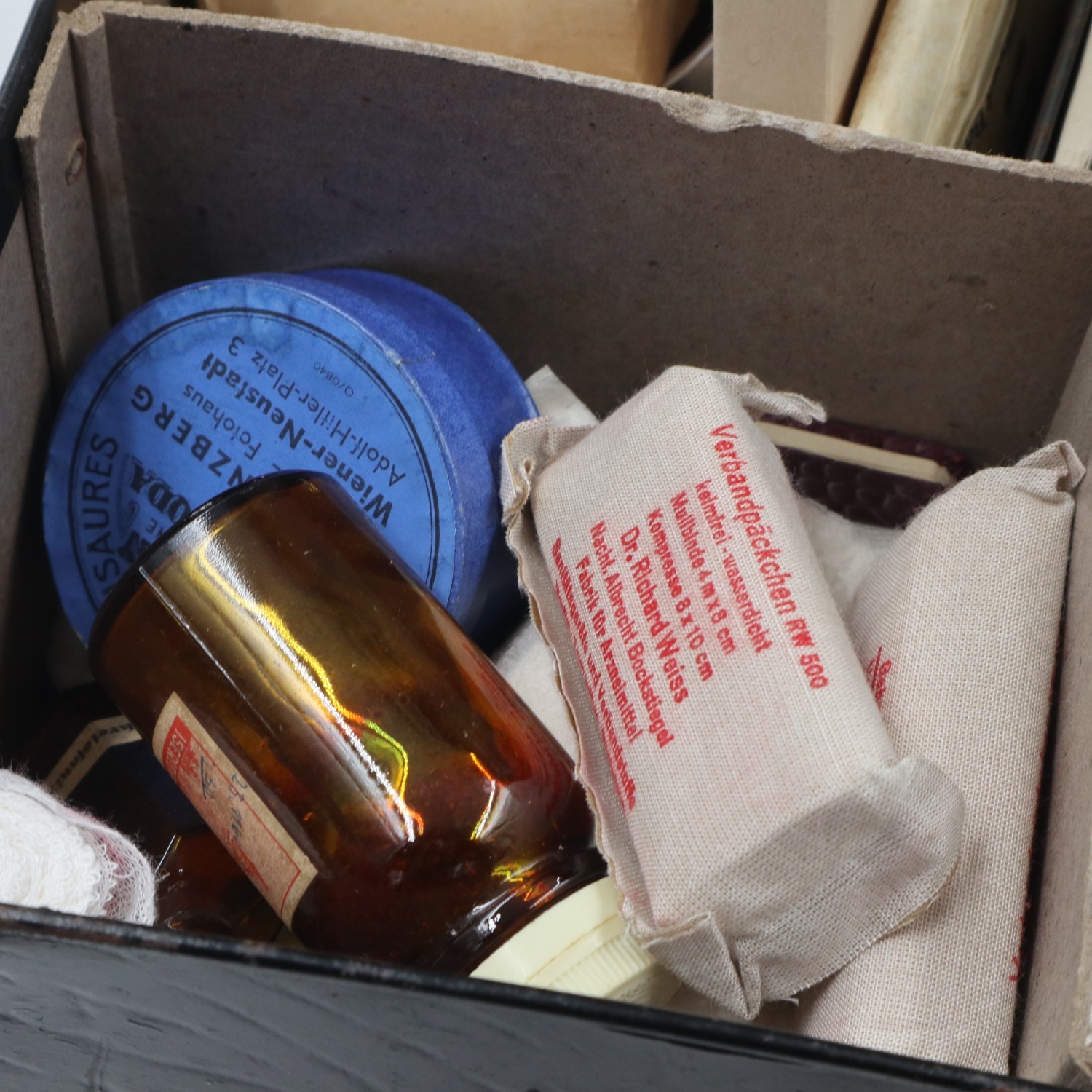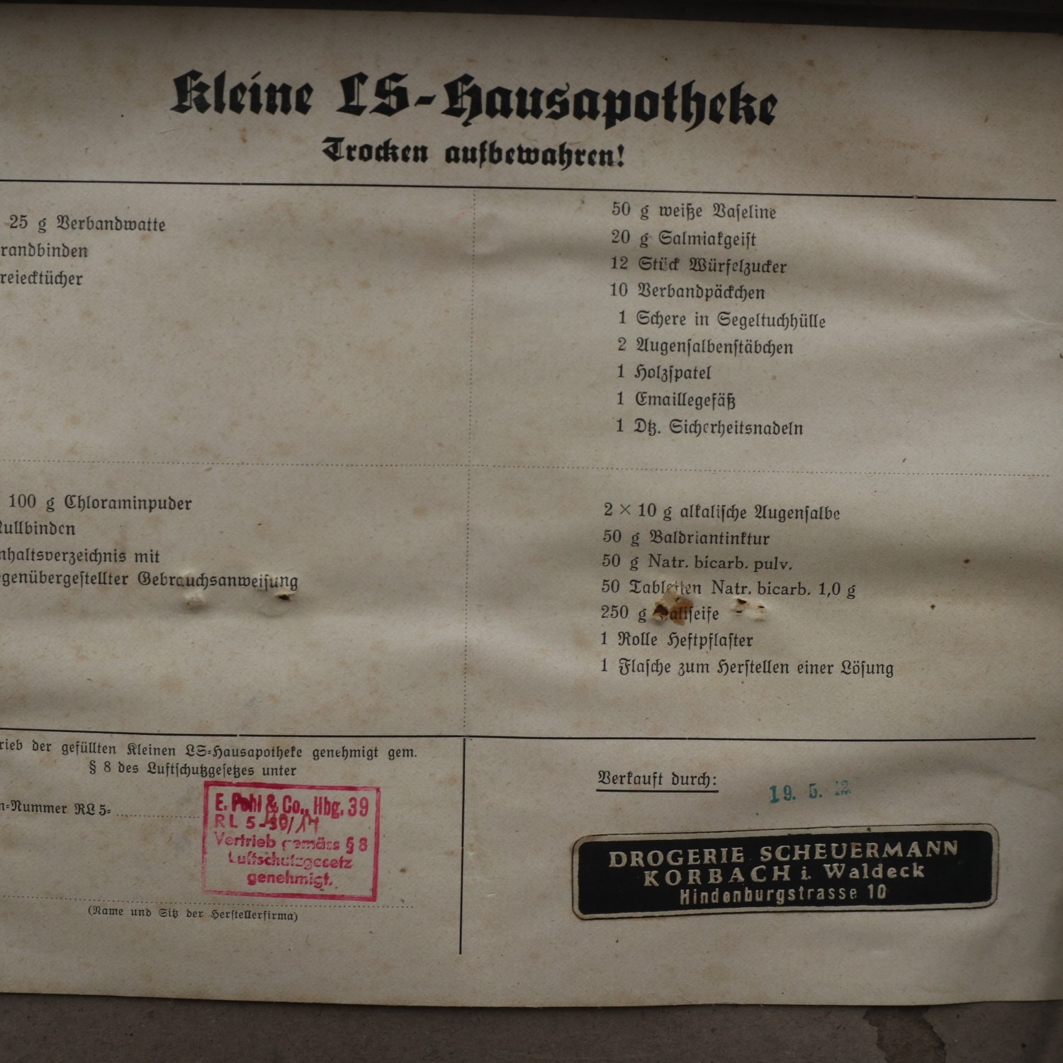 WWII German Air Raid First Aid Box and contents. These were available to purchase from the Local Luftshutz (Air Raid Police). UK P&P Group 2 (£20+VAT for the first lot and £4+VAT for subsequent lots)