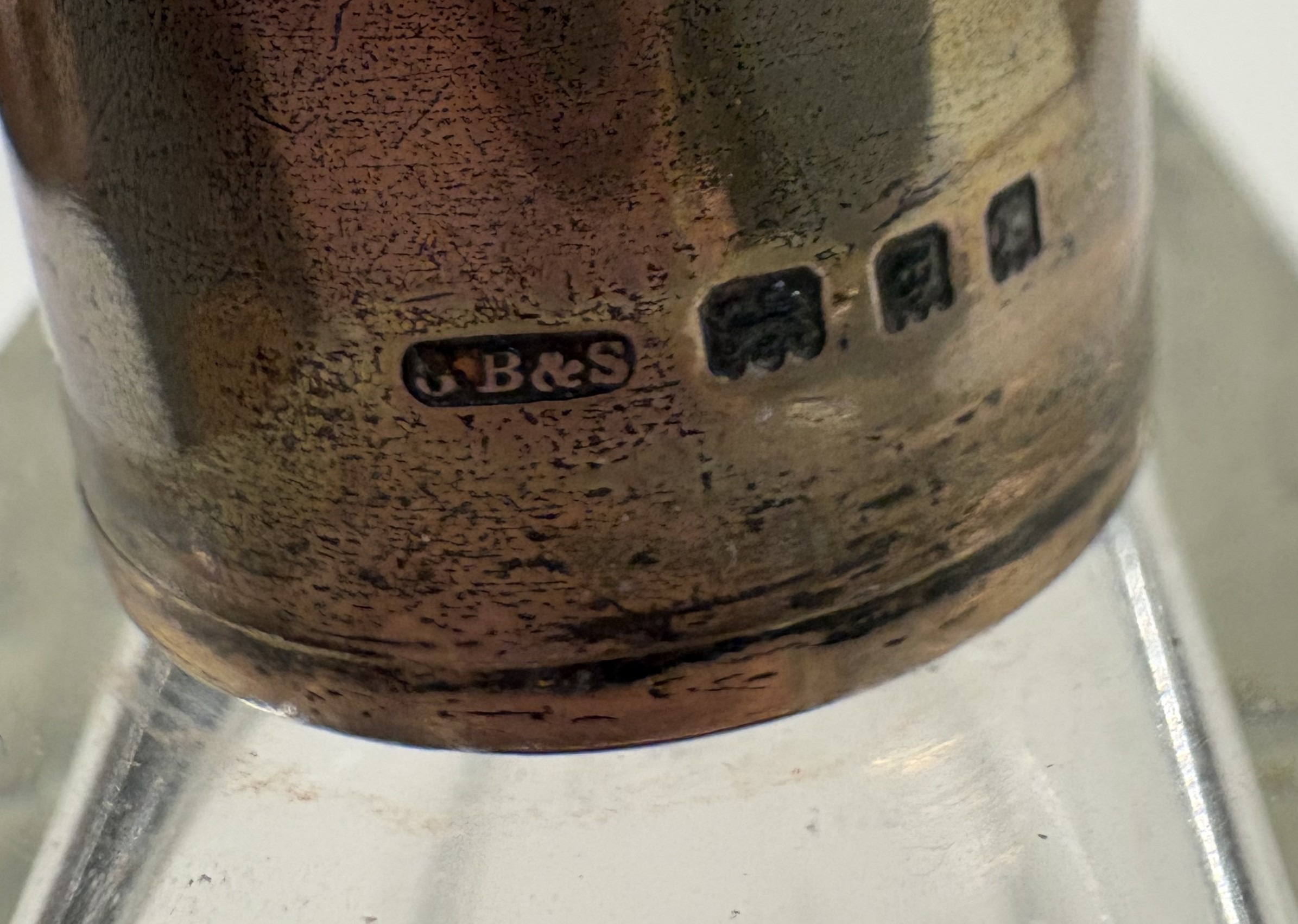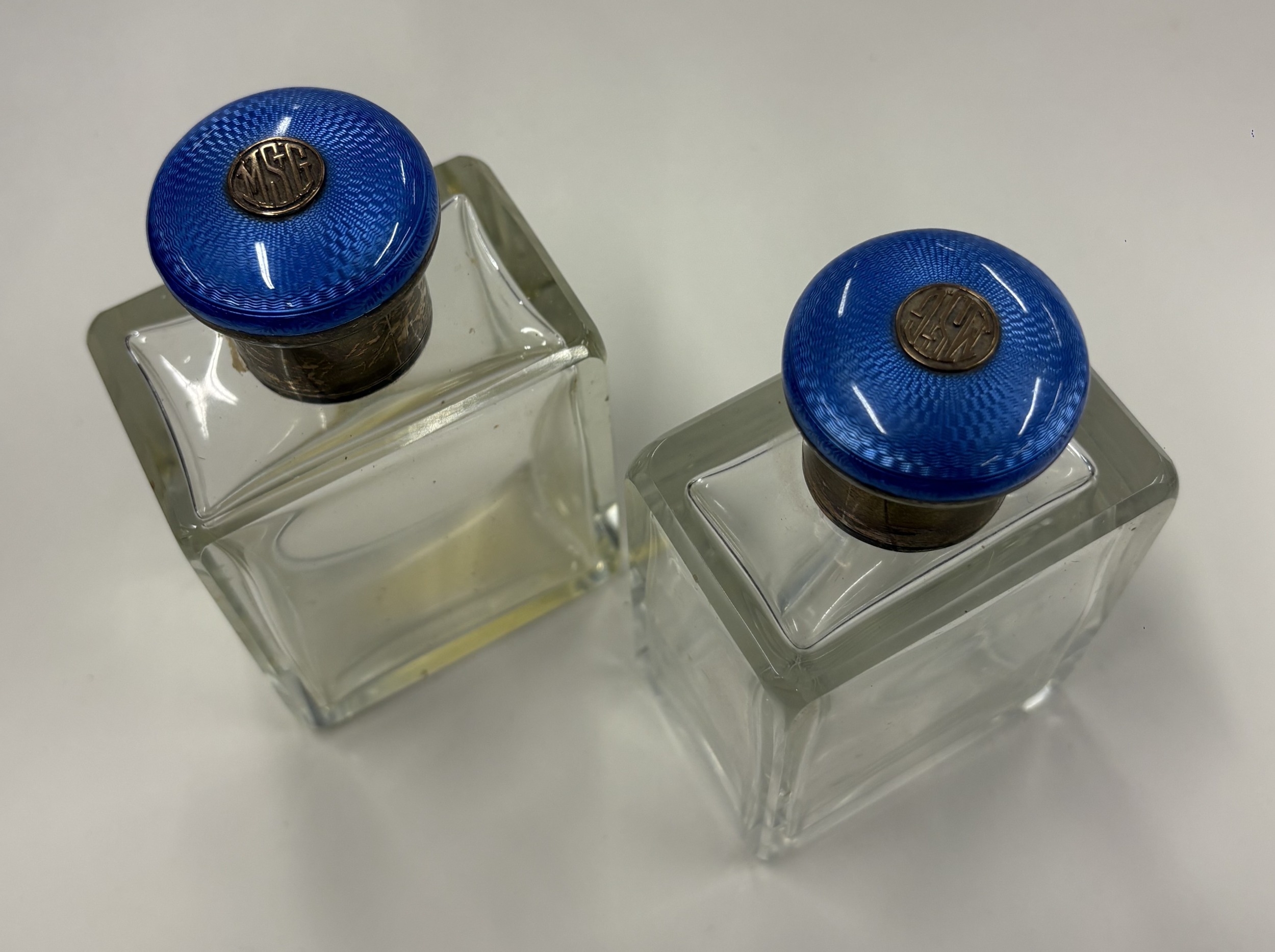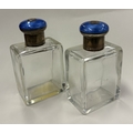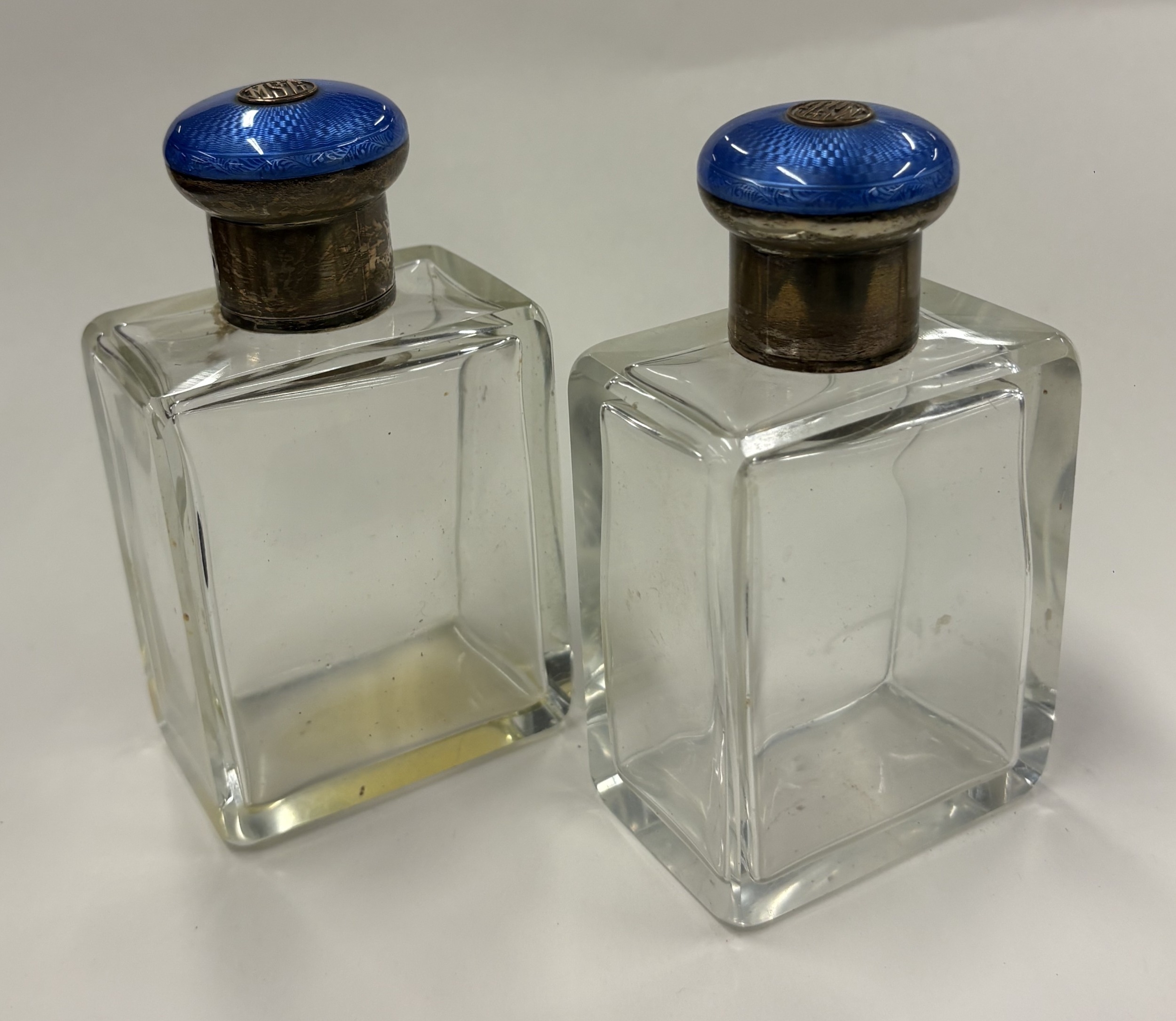 A pair of silver-lidded and blue enamelled glass scent bottles. By George Betjemann & Sons Ltd, retailed by Asprey. Est. £40 - £60.
