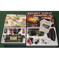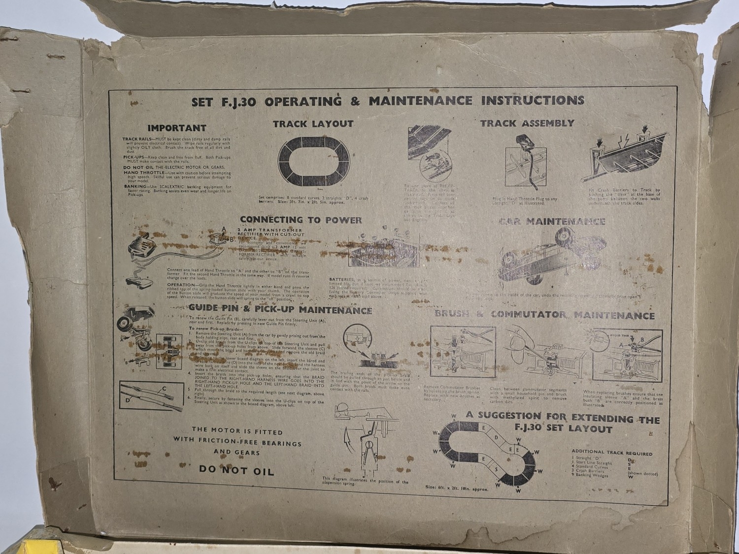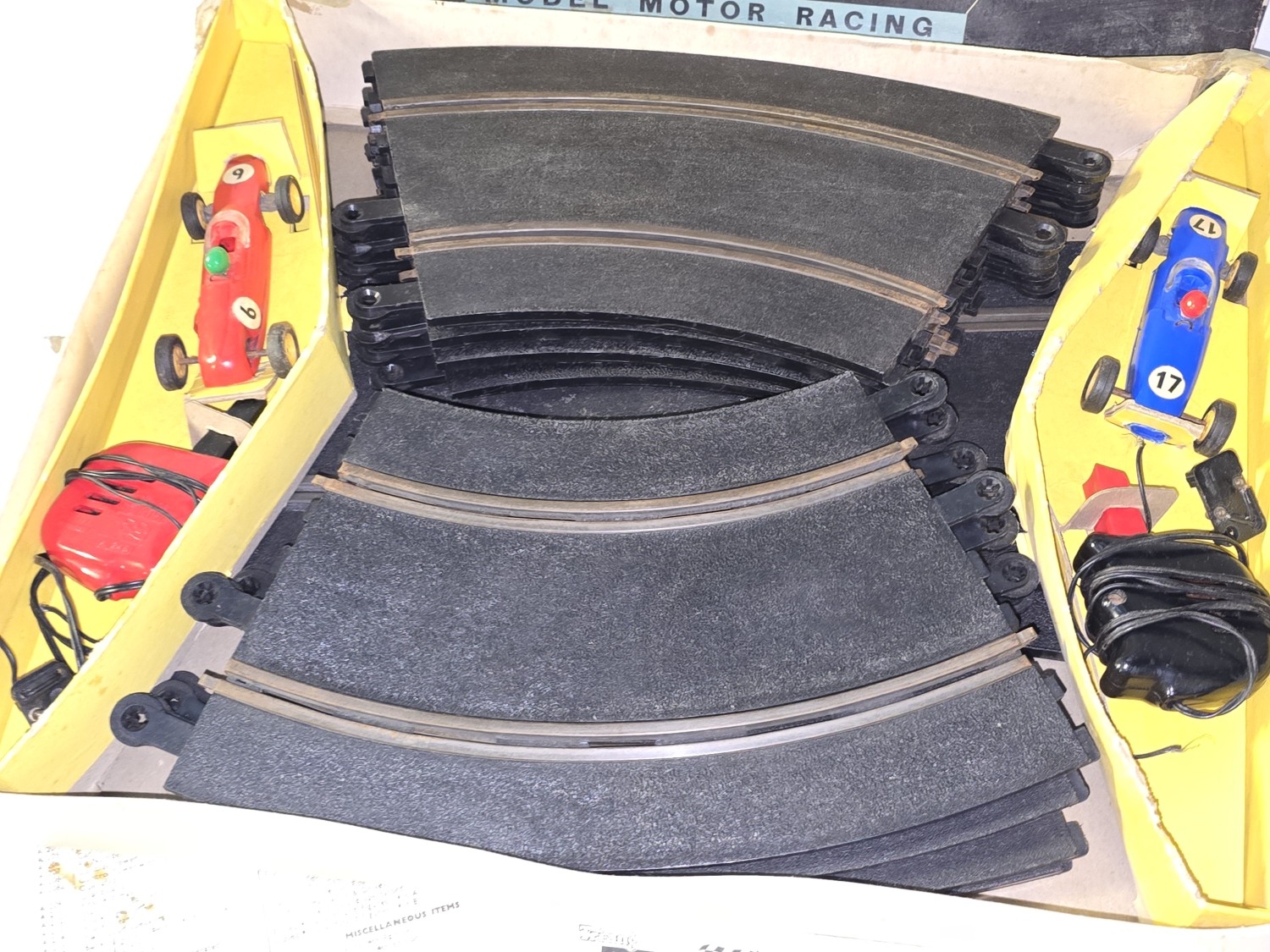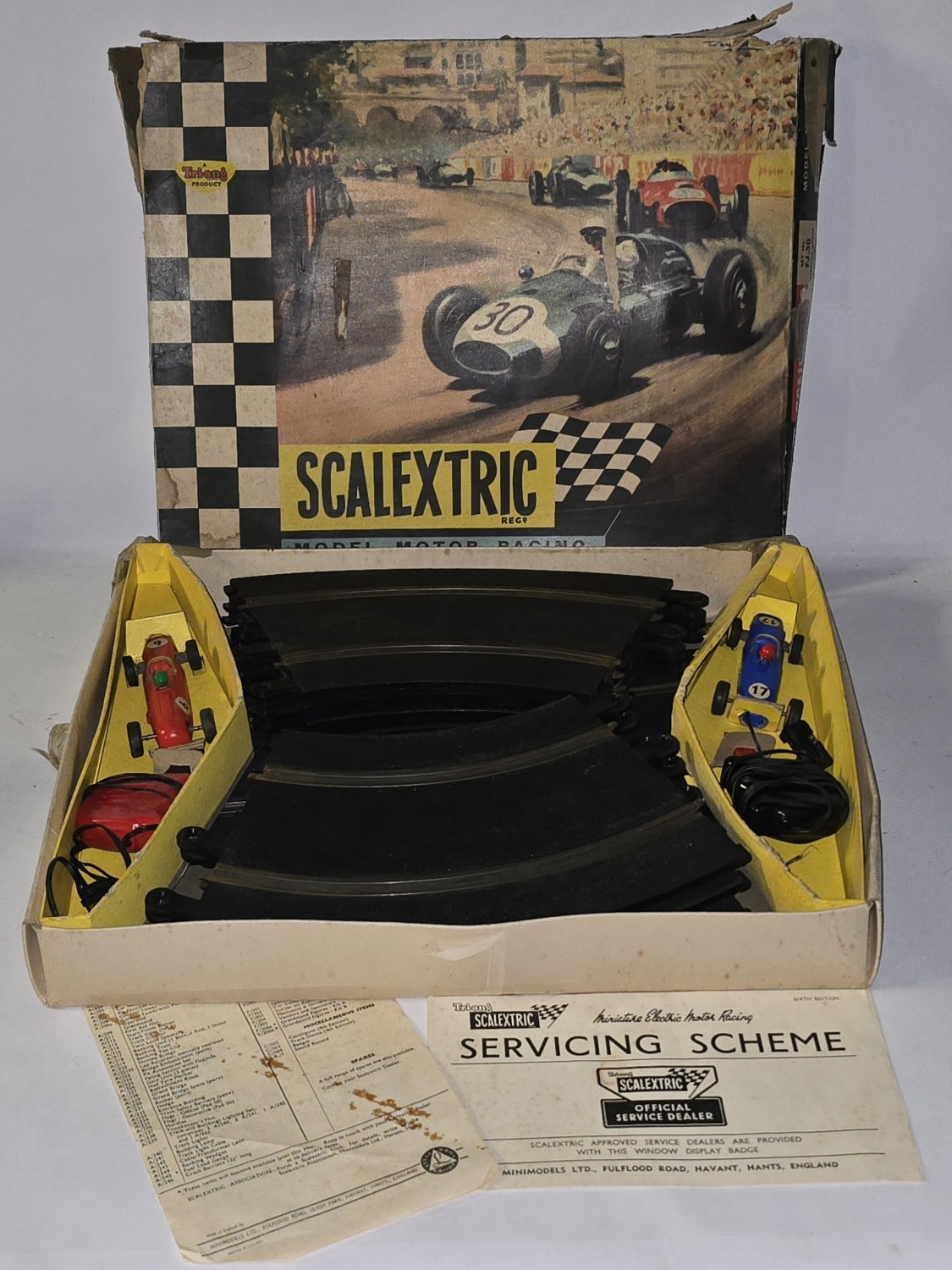 Triang Scalextric vintage 1963 FJ30 slot car racing set. Appears 90% complete with the exception of crash barriers. Sold as not tested. Original box now in poor condition.