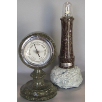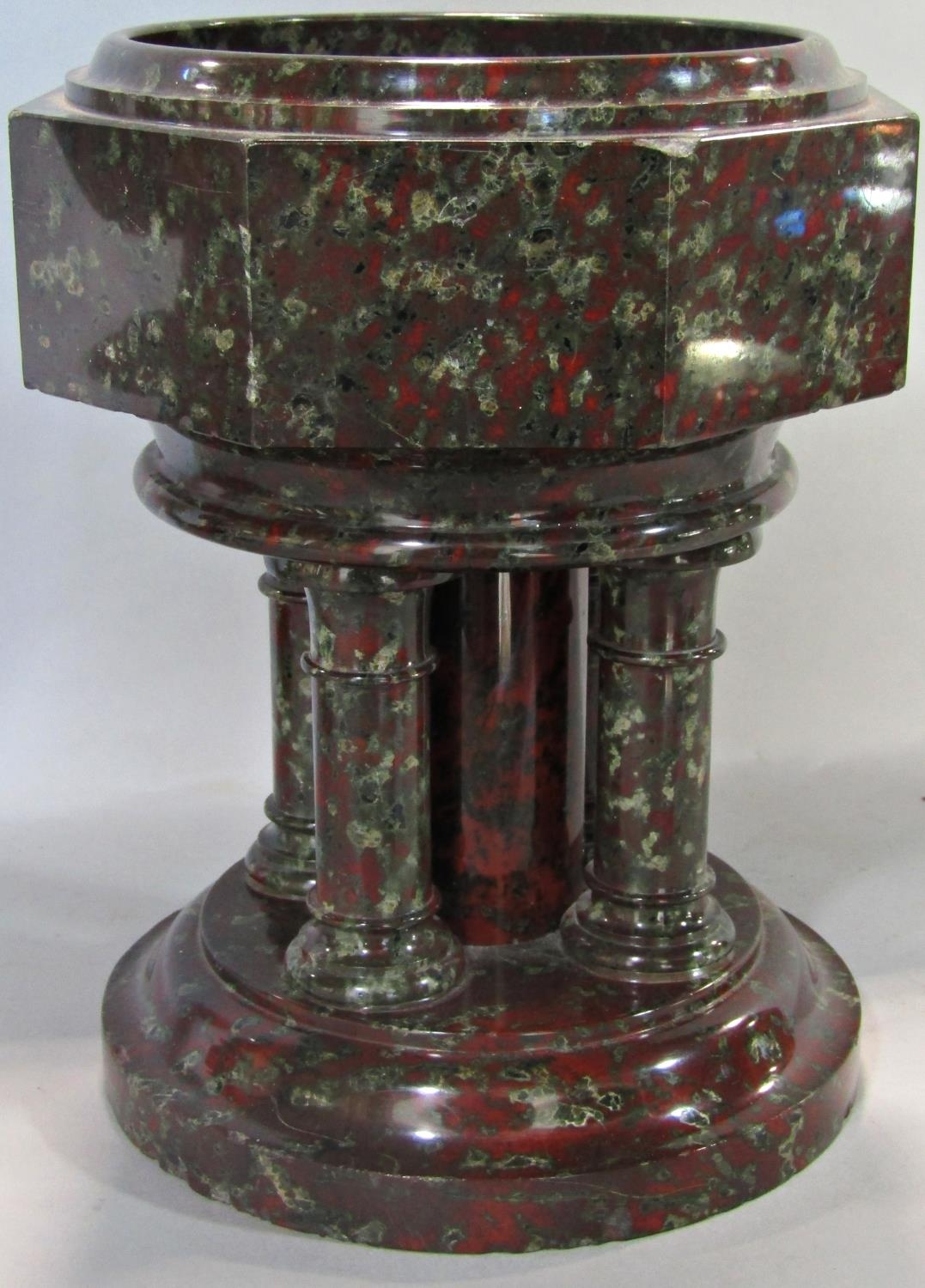 A good quality red Serpentine stone font raised on column supports, together with a further Serpentine stone framed aneroid barometer, 31cm high