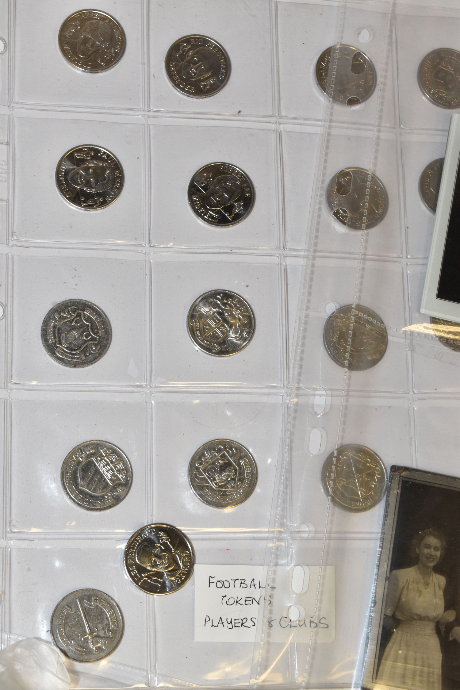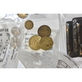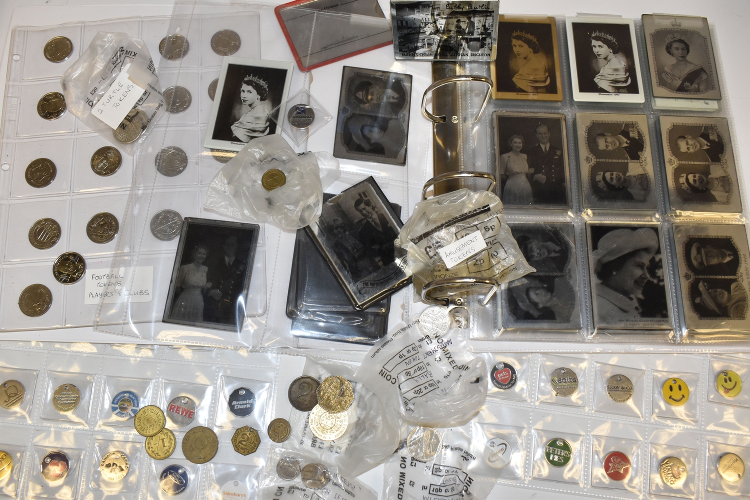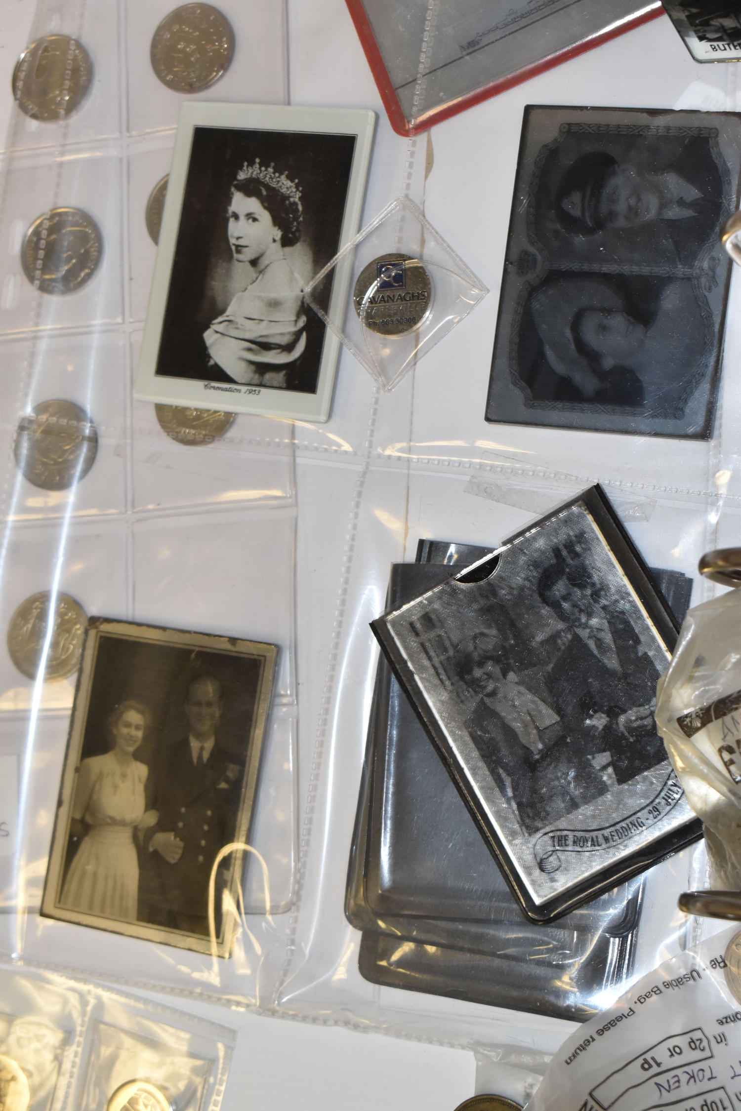 A BOX OF SUNDRIES to include a folder of approximately Novolor collectible printed mirrors featuring assorted BOAC travel destinations, Butlins, assorted ships, and royal commemoratives, football tokens, a collection of assorted tokens from shops, amusements arcades etc (1 box) (s.d)