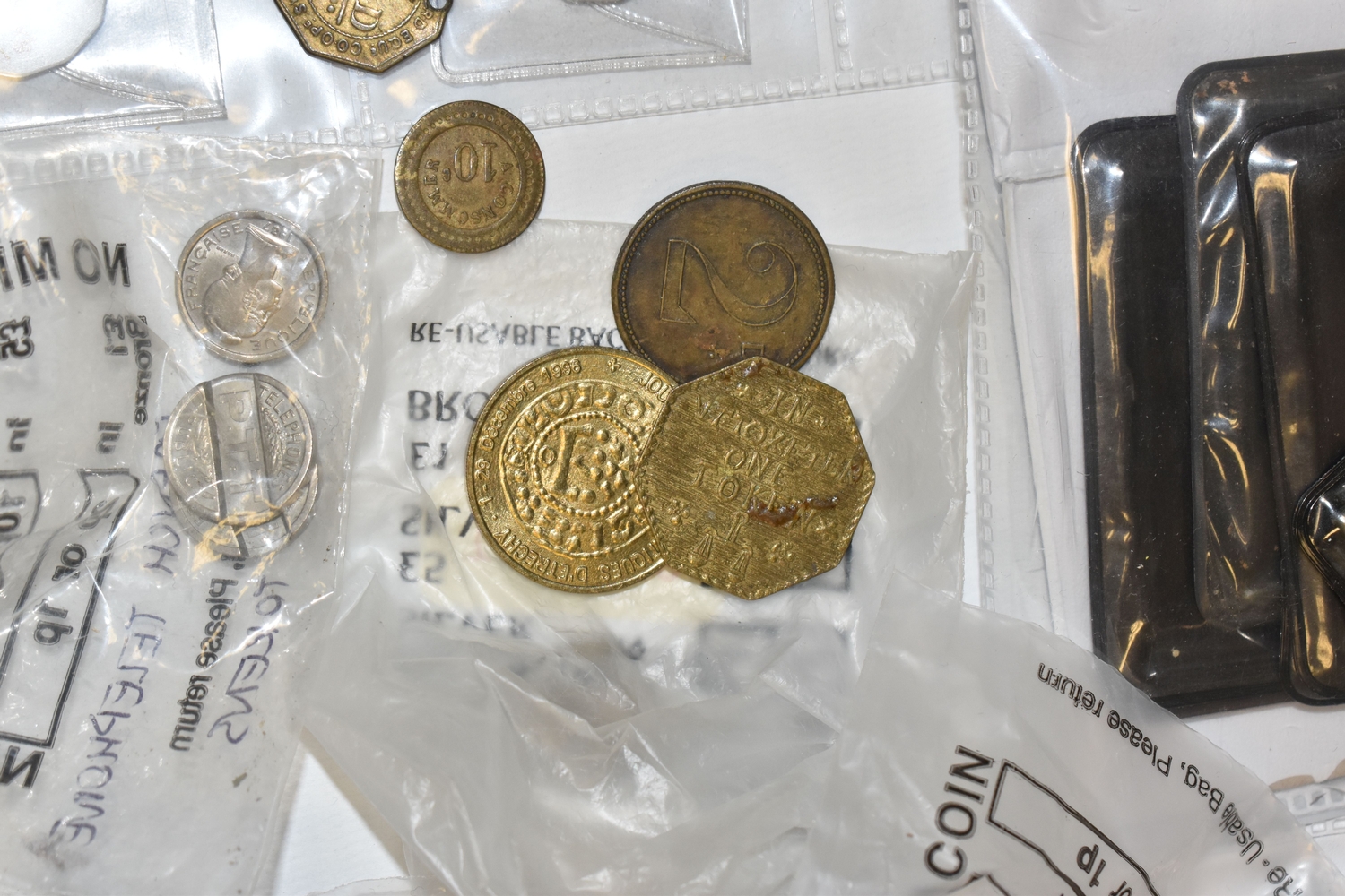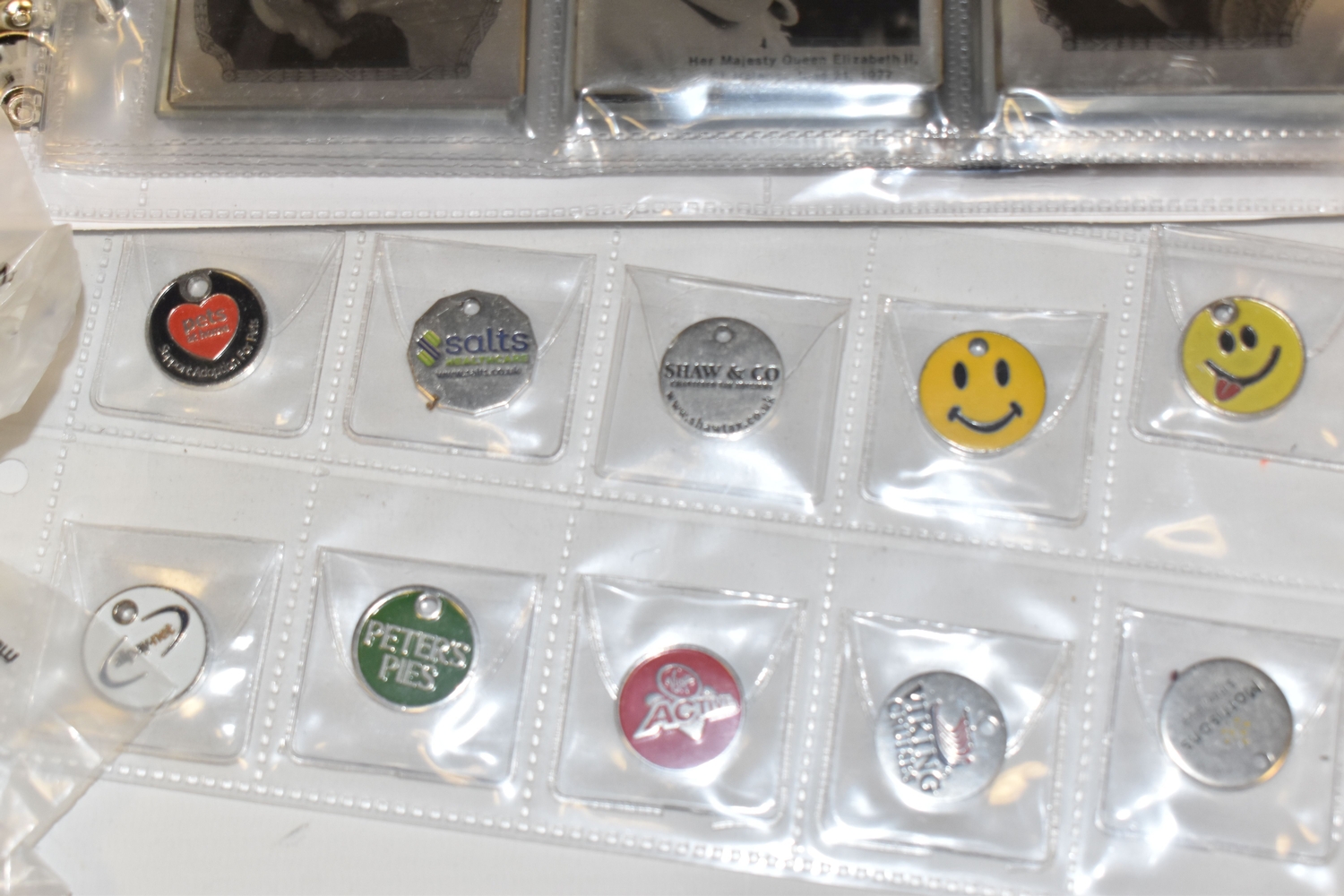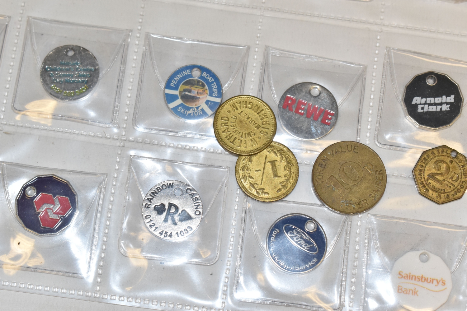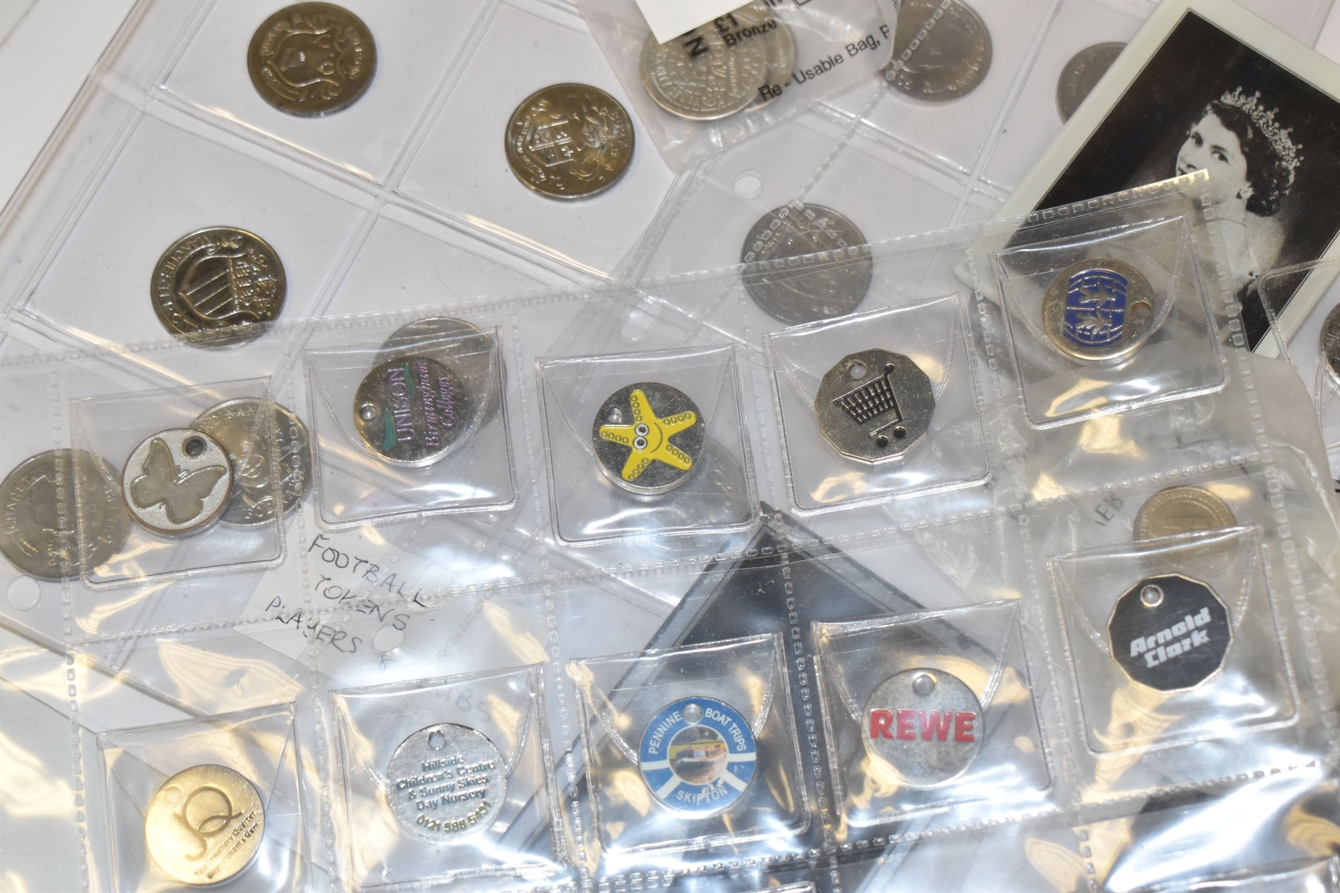 A BOX OF SUNDRIES to include a folder of approximately Novolor collectible printed mirrors featuring assorted BOAC travel destinations, Butlins, assorted ships, and royal commemoratives, football tokens, a collection of assorted tokens from shops, amusements arcades etc (1 box) (s.d)