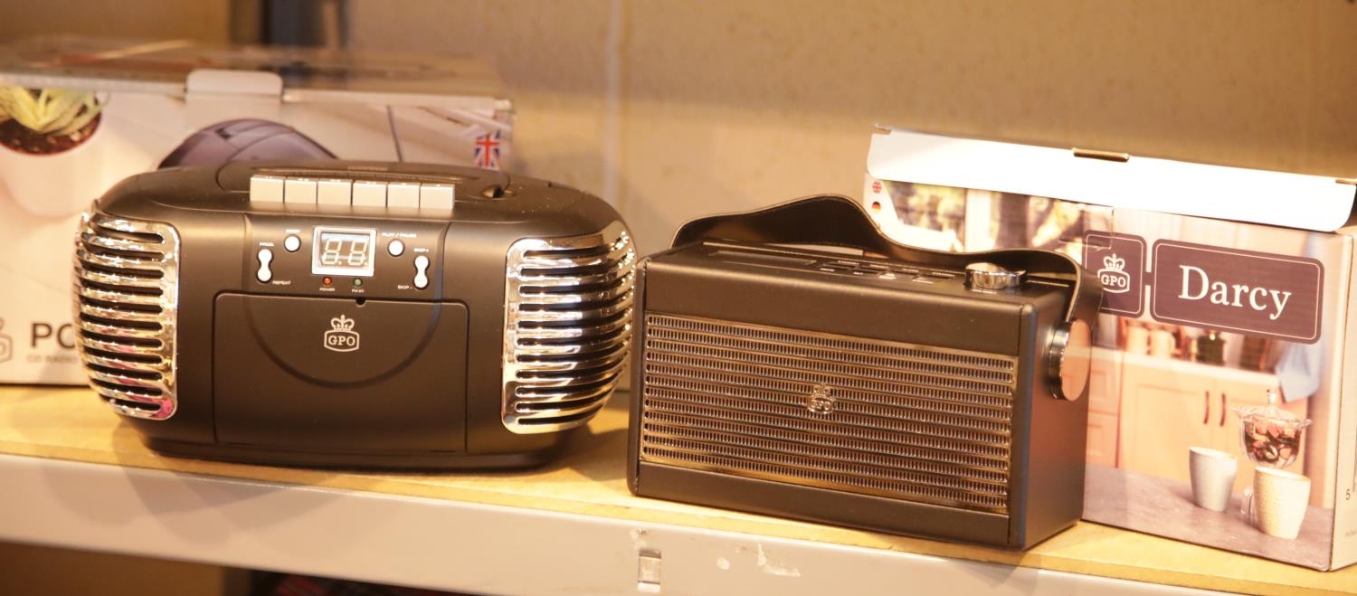 Black GPO PCD299 retro portable boombox CD, radio and cassette player; black GPO Darcy portable analogue radio/alarm clock. P&P Group 3 (£25+VAT for the first lot and £5+VAT for subsequent lots)
