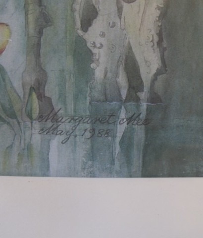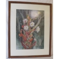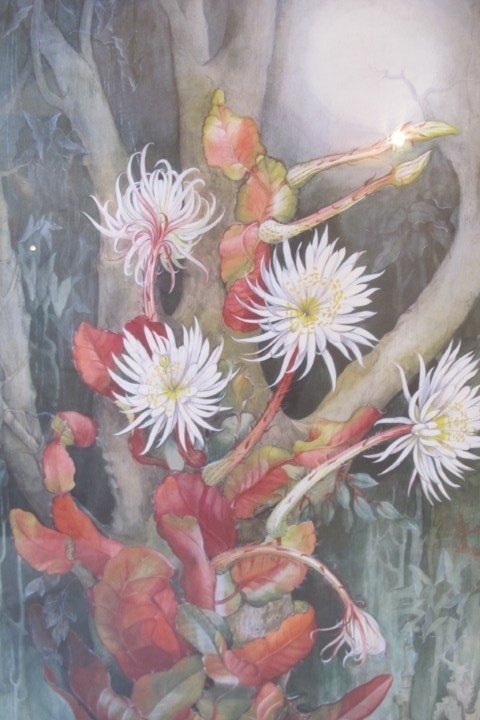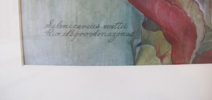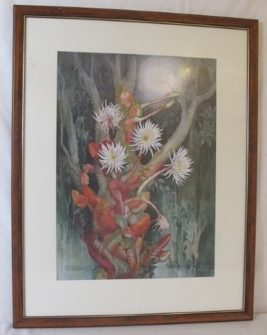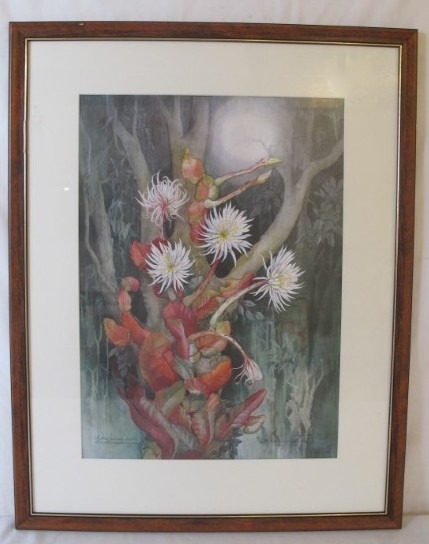 Maragret Mee (Botanical Artist). Framed and glazed print of the painting Selenicereus Wittii also known as The Amazon Moonflower. 53 x 37.5cms (approx).