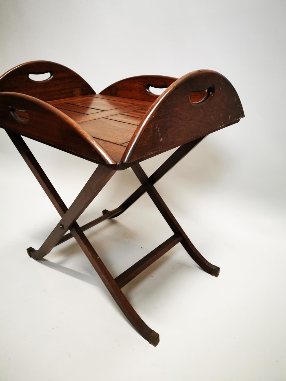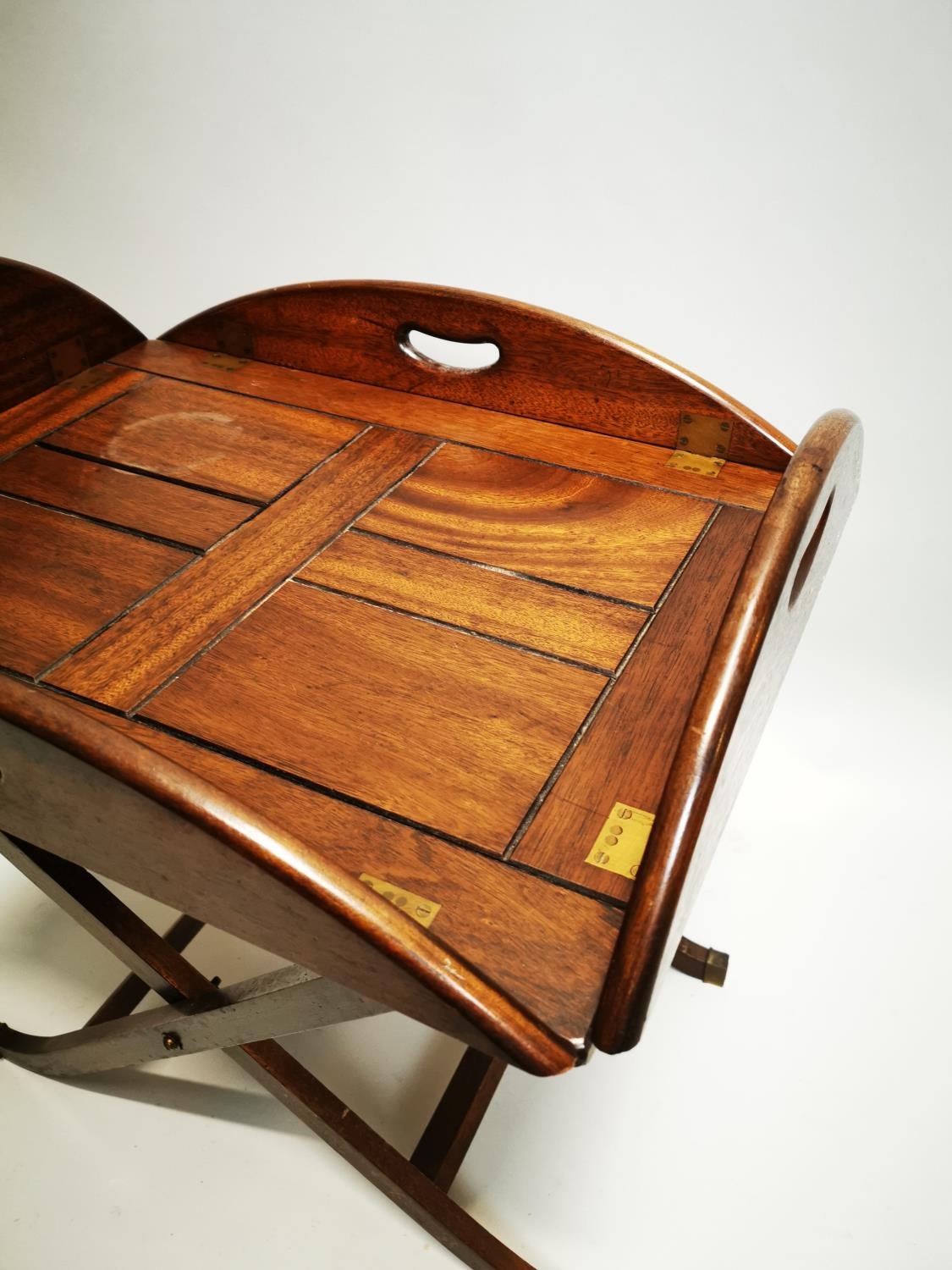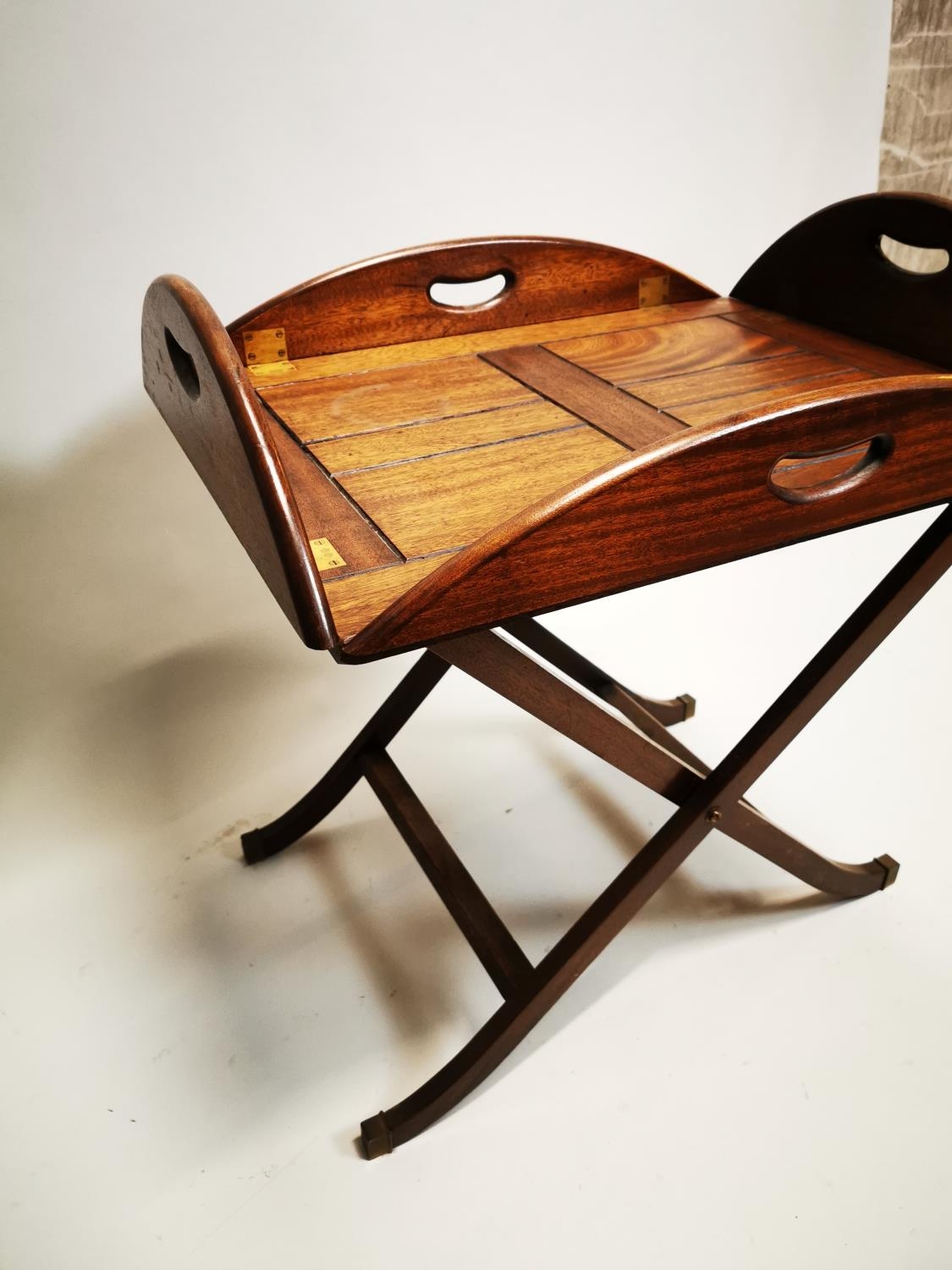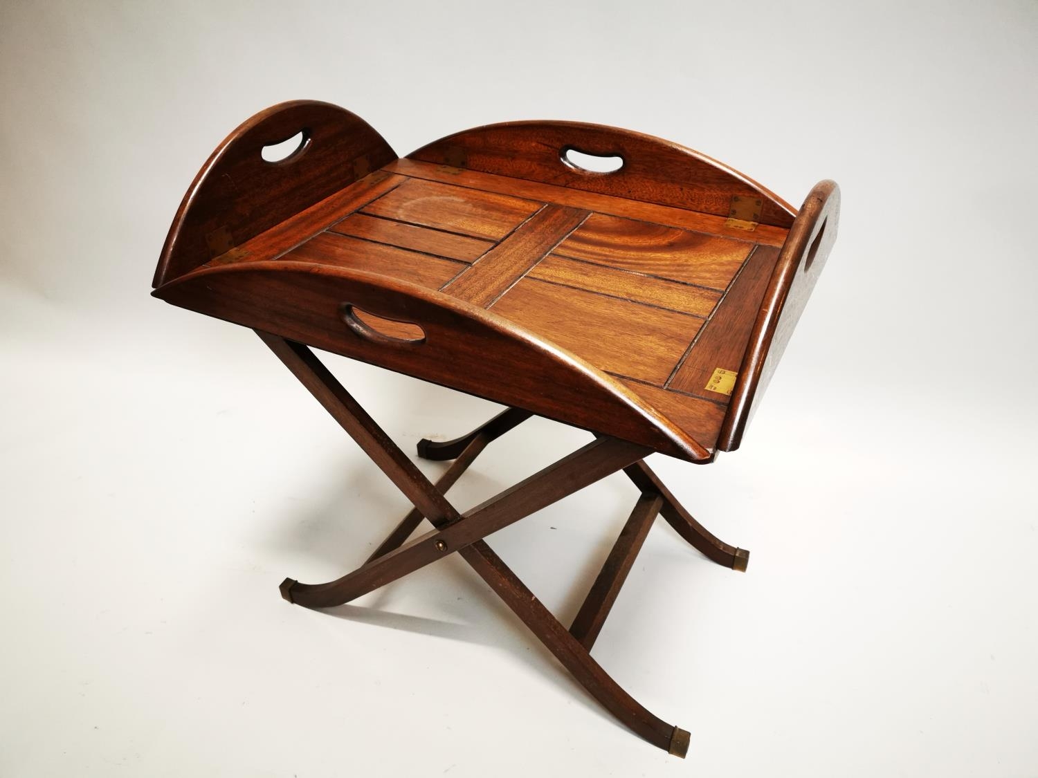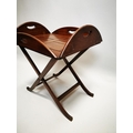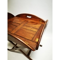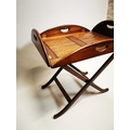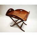 Mahogany coffee table in the form of a butlers tray on stand {57 cm H x 88 cm W x 64 cm D}.