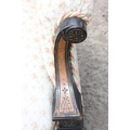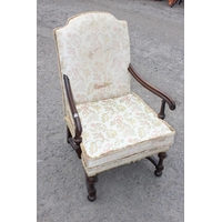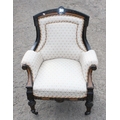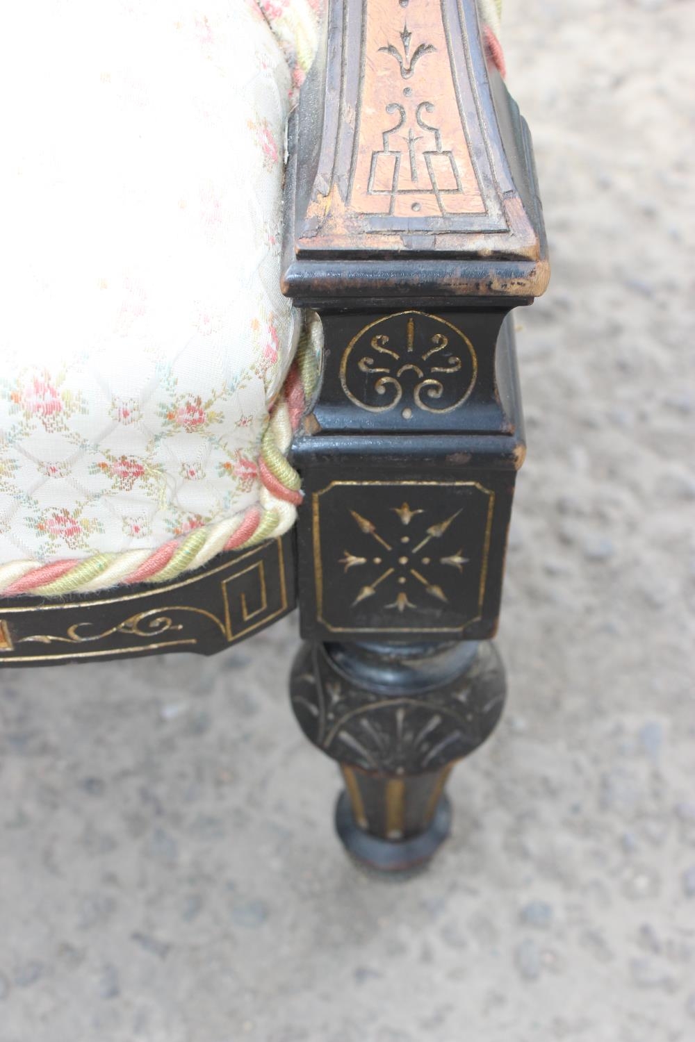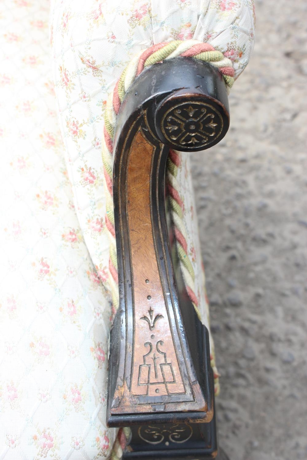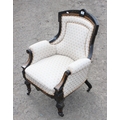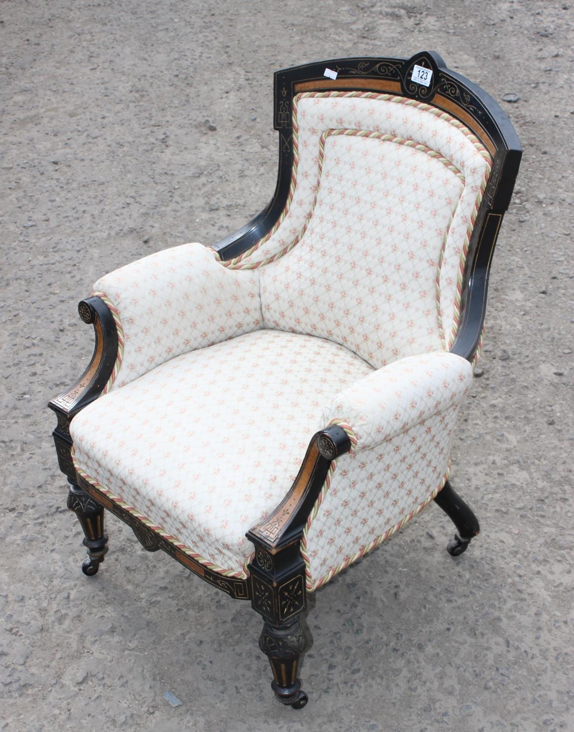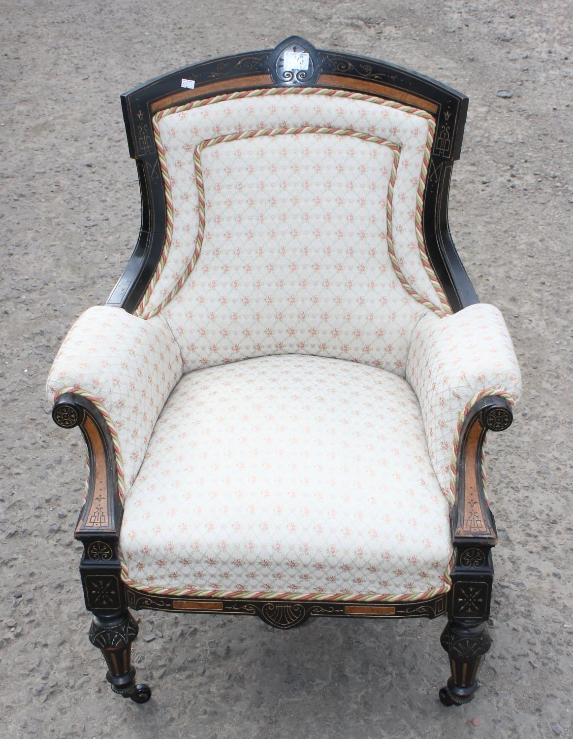 Antique ebonised armchair, likely French 19th century, with Amboyna inlay