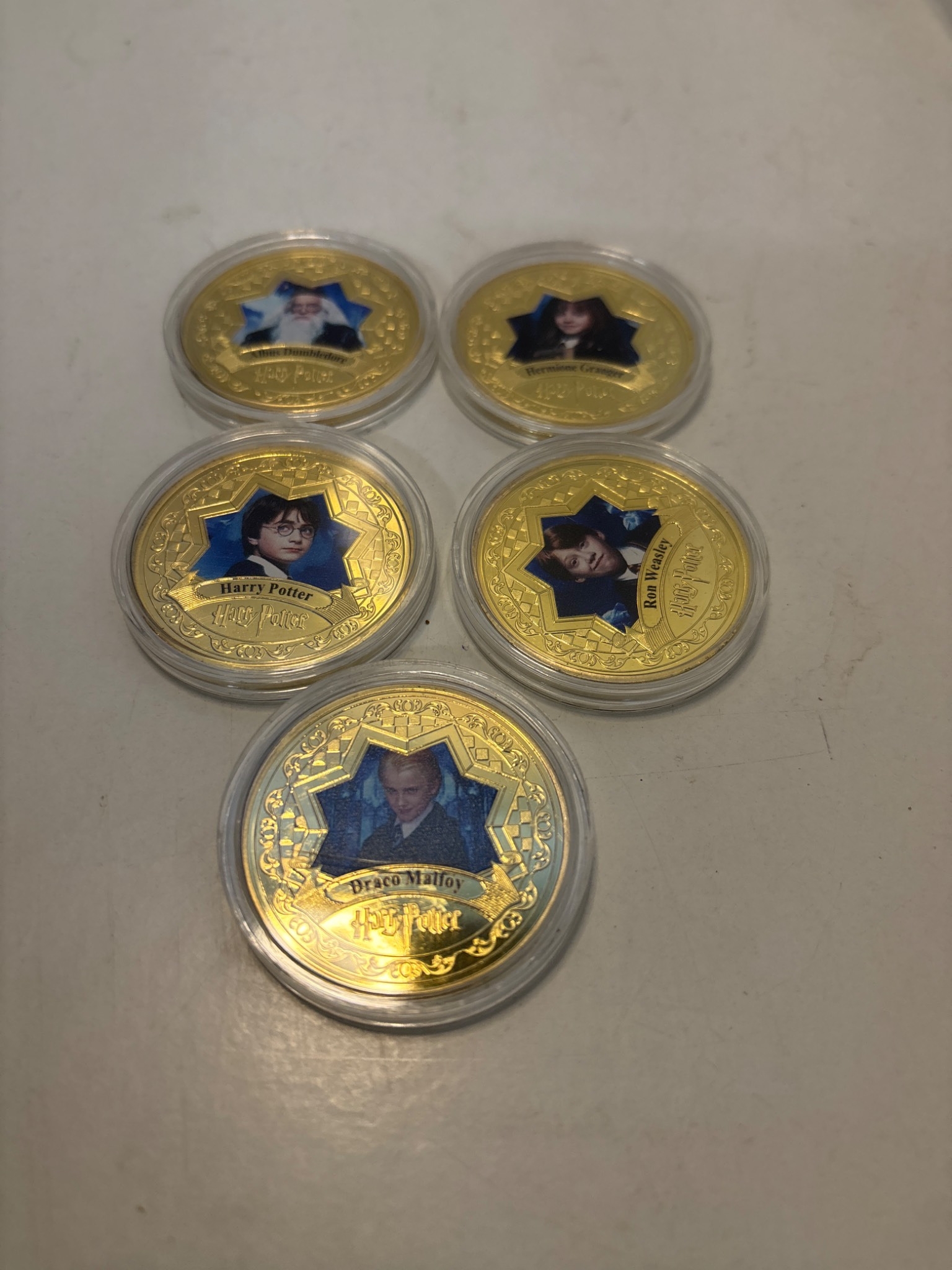Five gold-tone coins with Harry Potter characters.