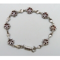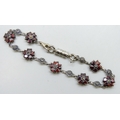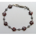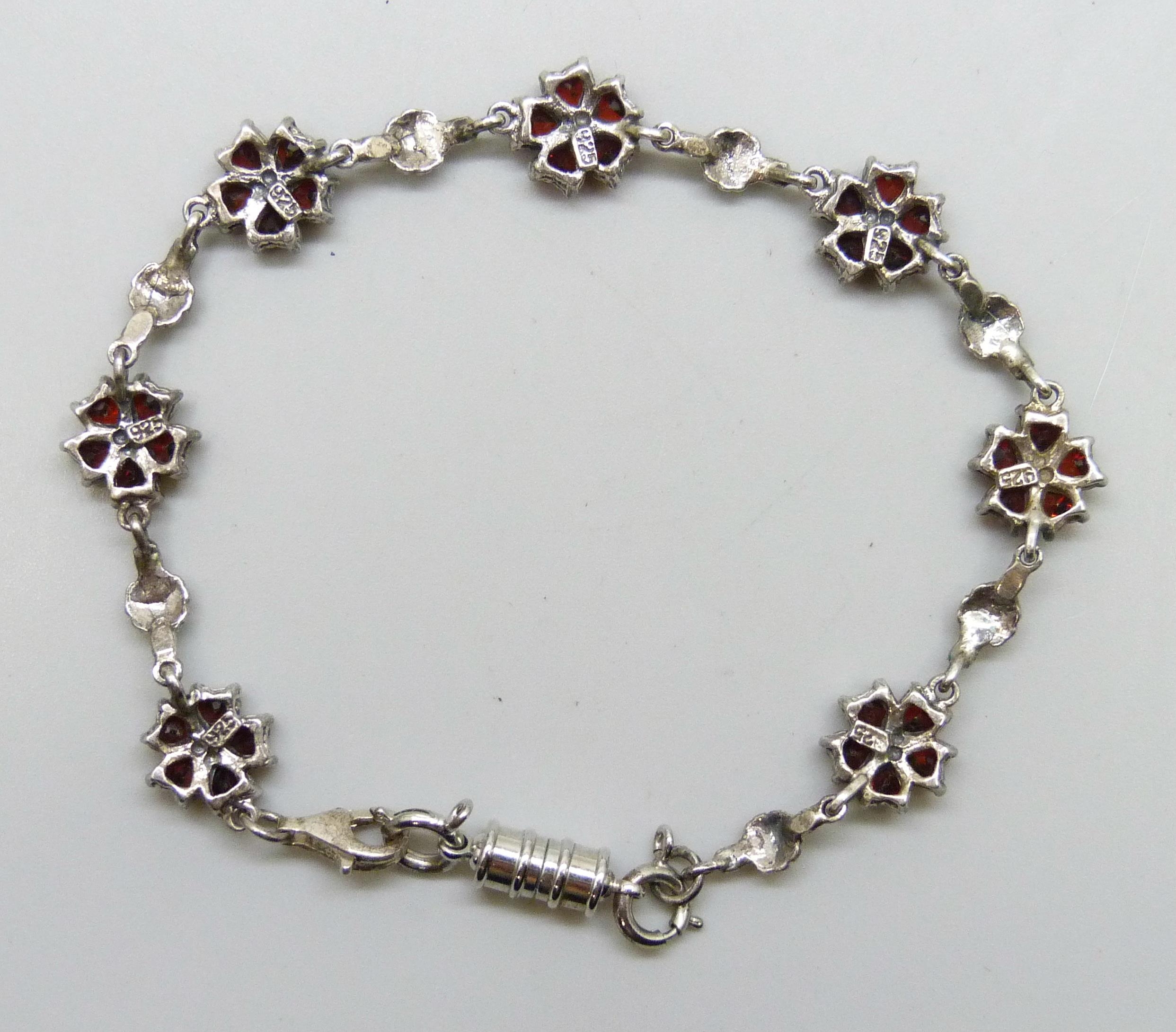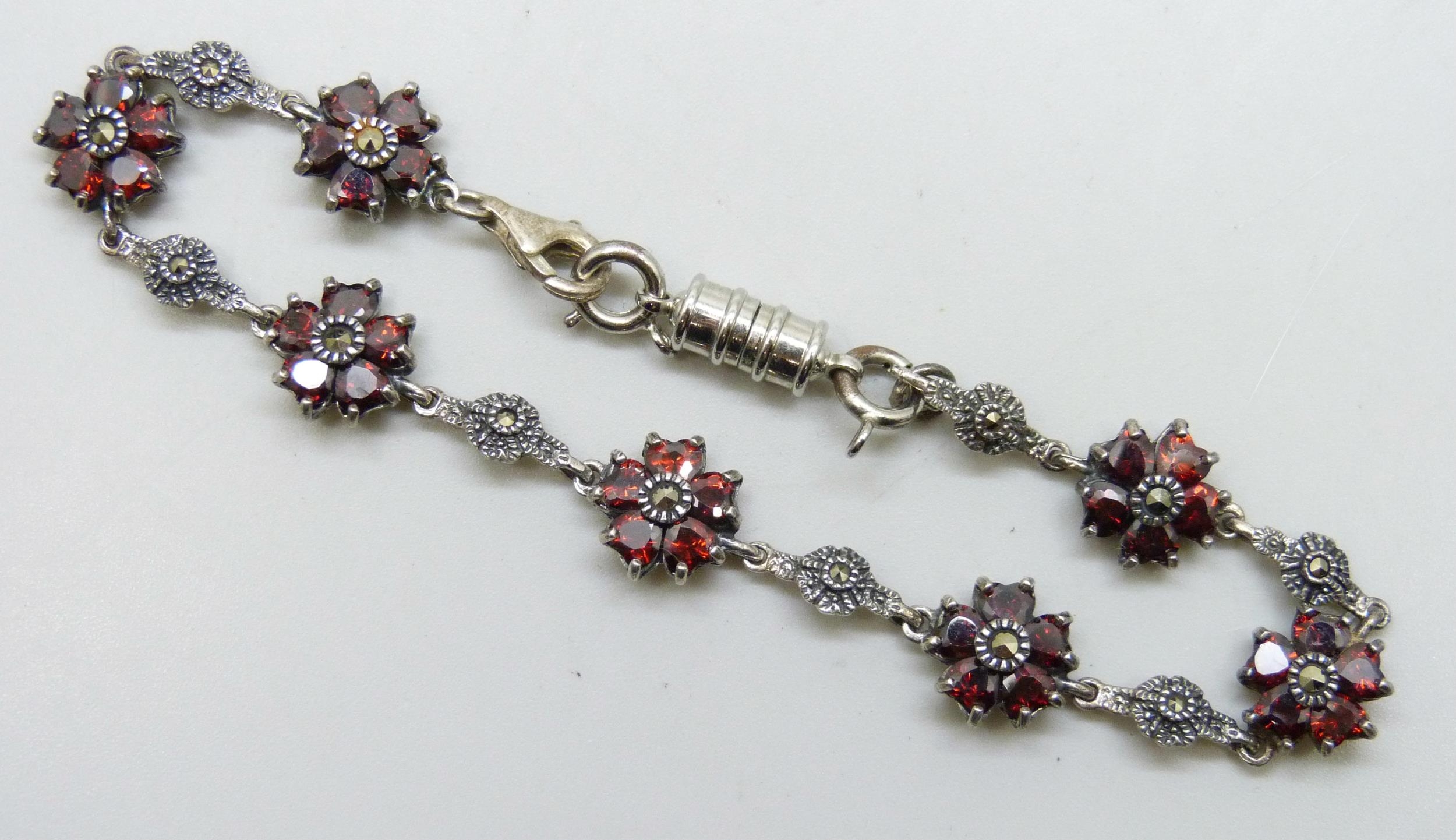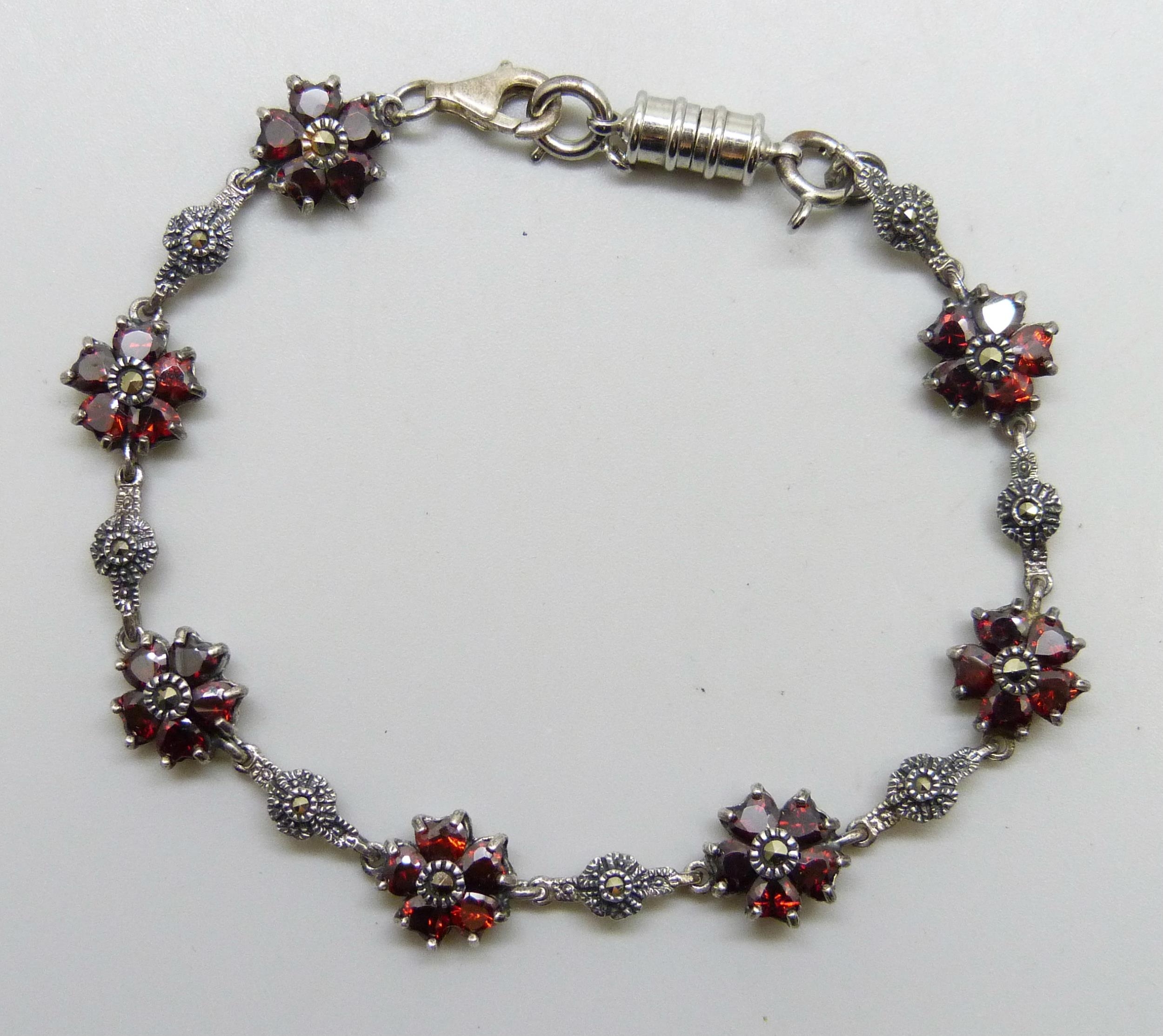A silver, garnet and marcasite bracelet with added plated magnetic clasp, 19.5cm