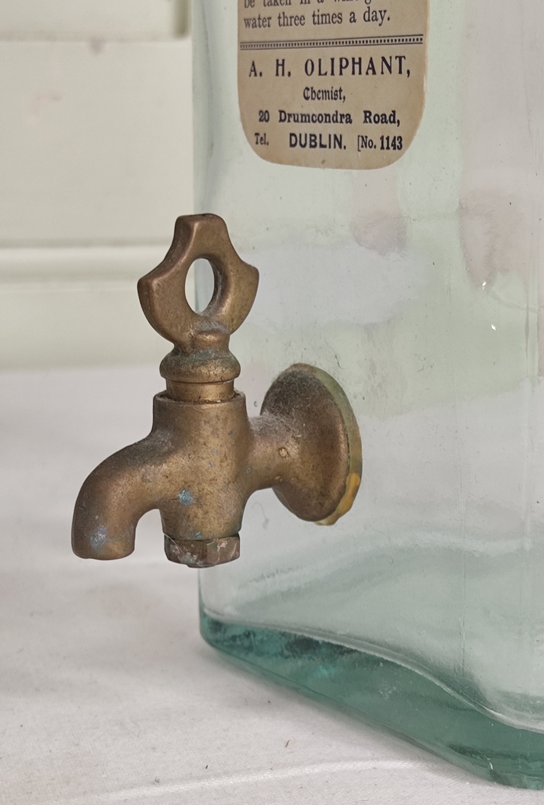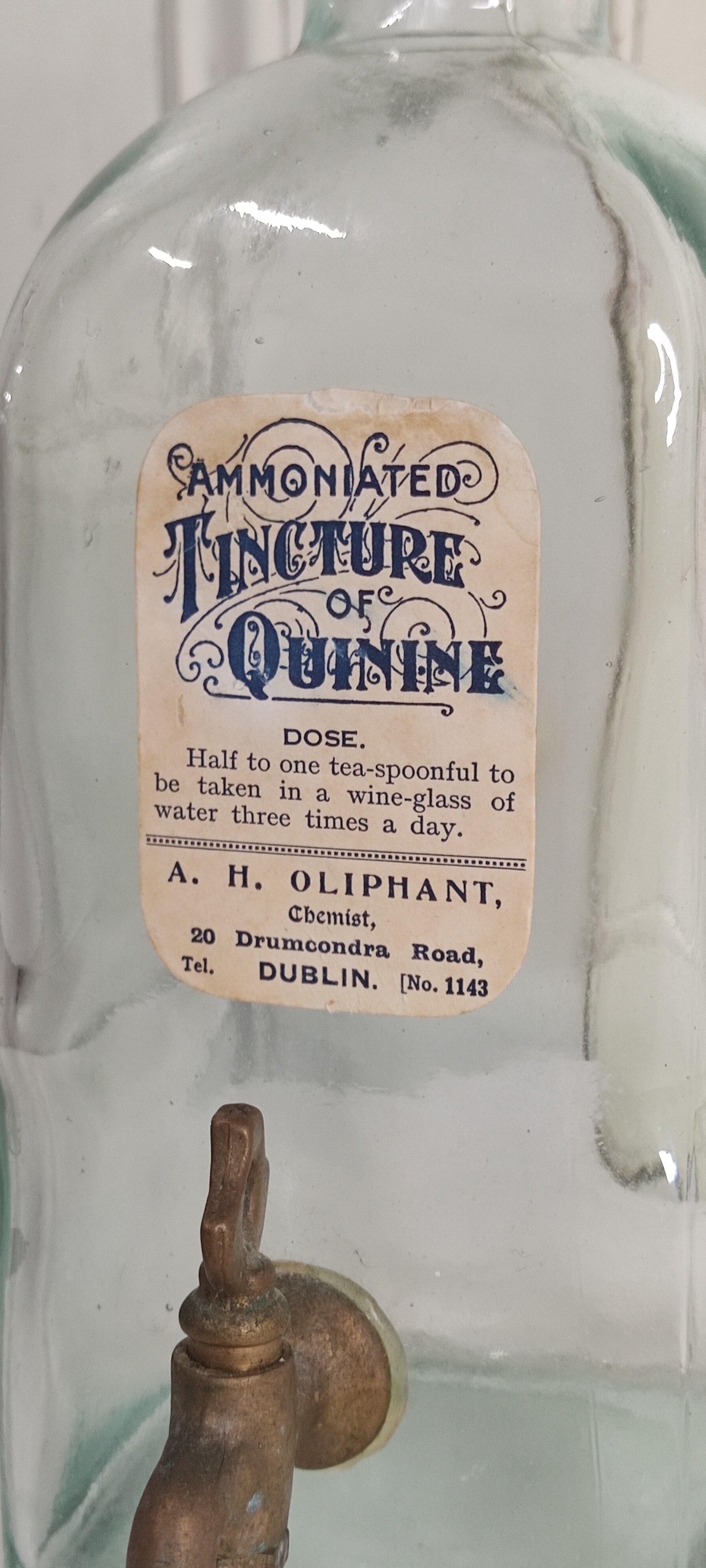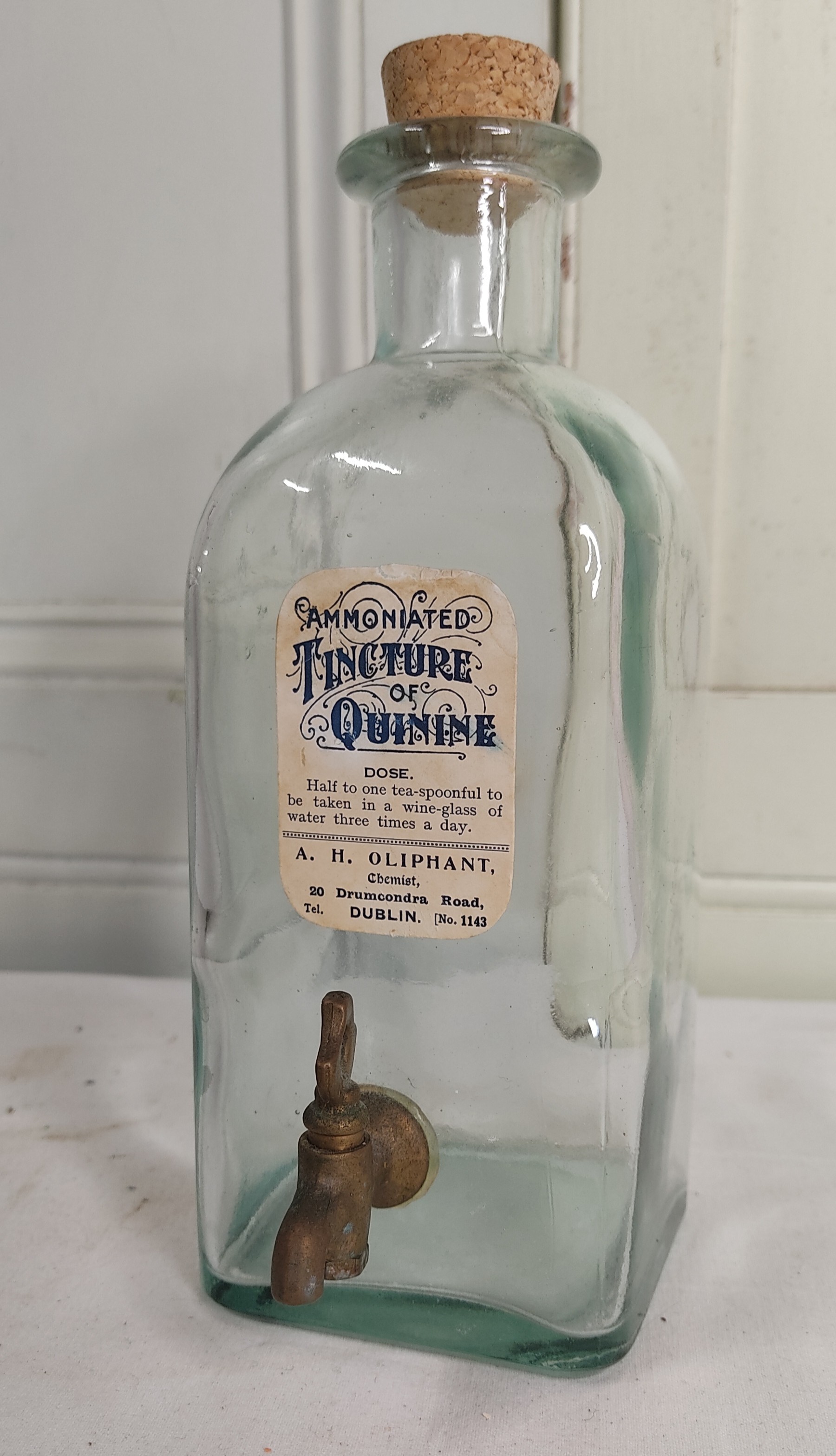 An antique pharmacy bottle with original paper label for Ammoniated Tincture of Quinine.