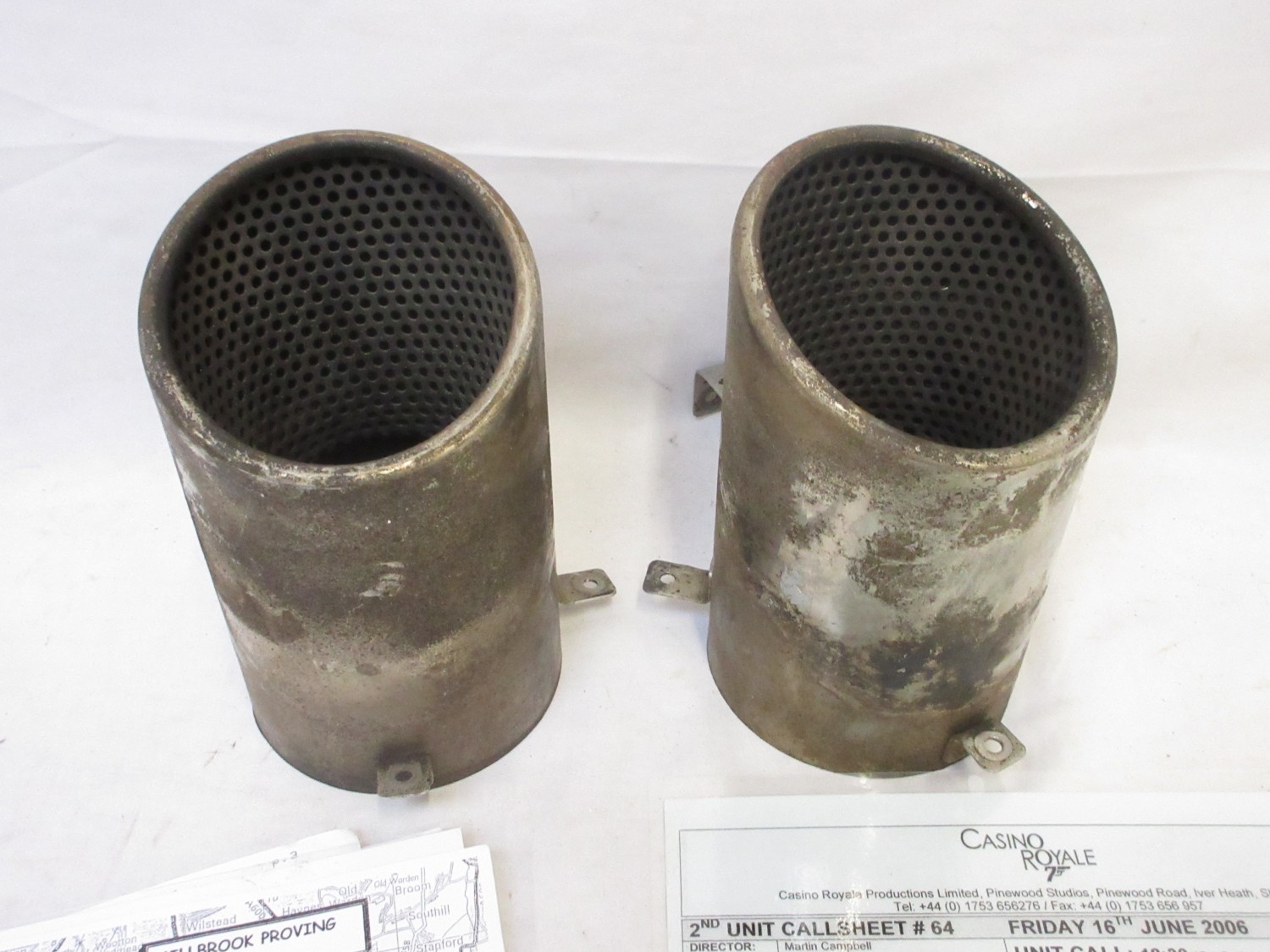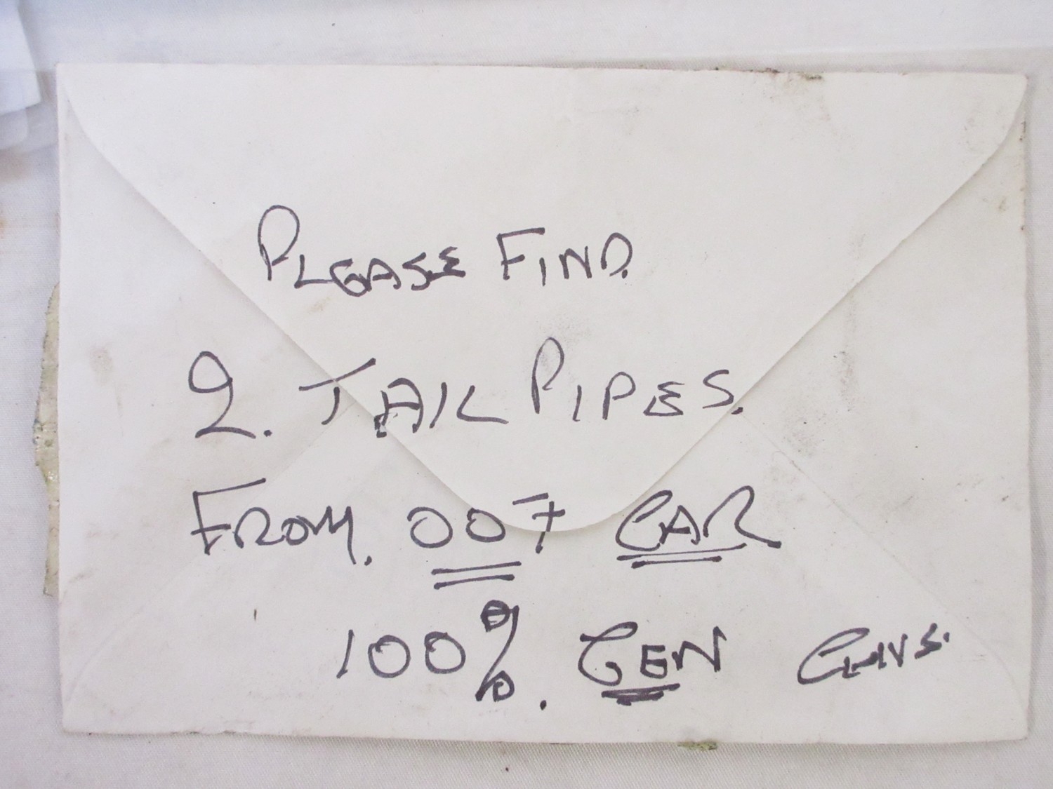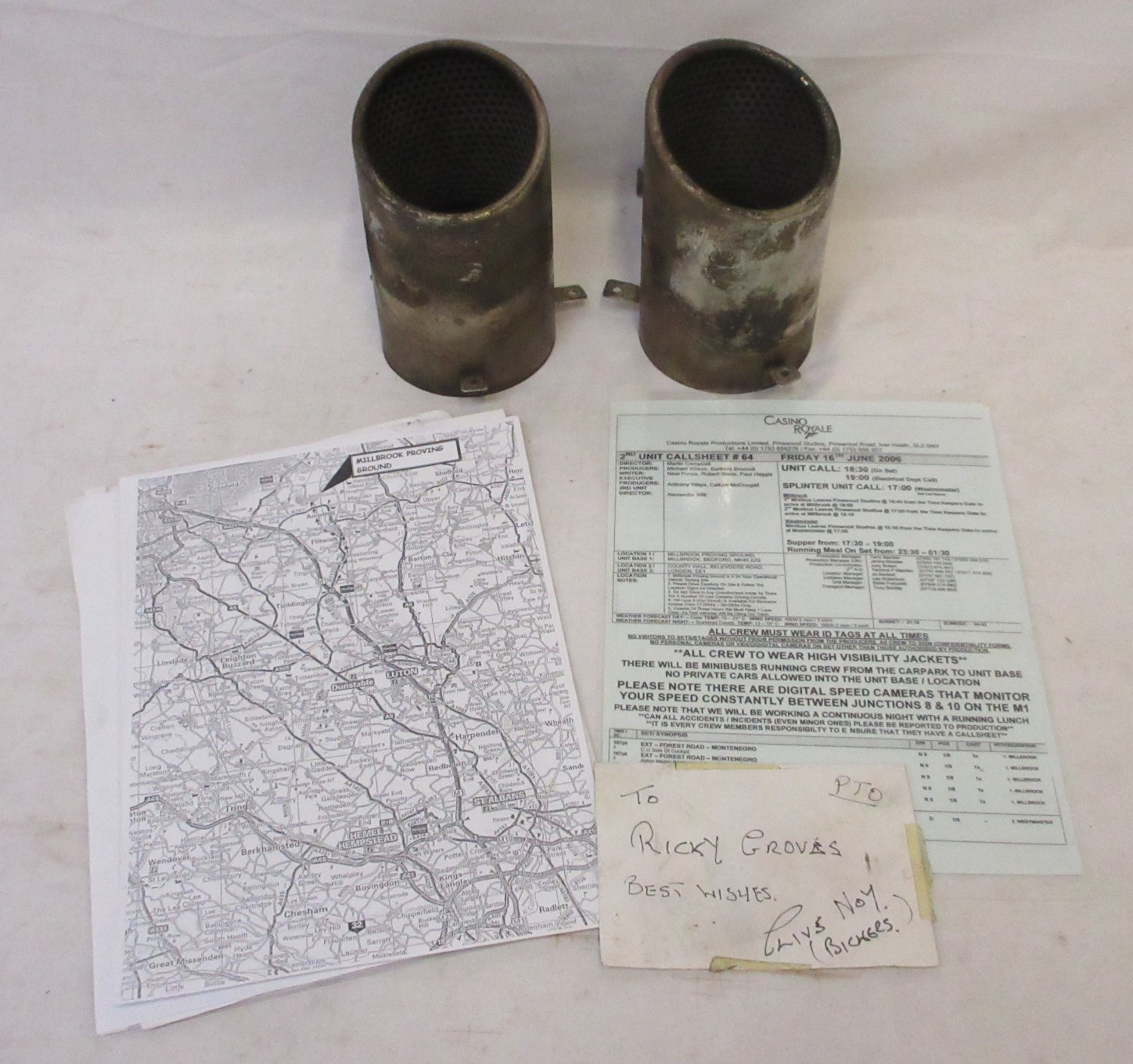 The Ricky Groves Collection - Casino Royale DB9 tail pipes from the wrecked DB9 at the Millbrook Proving ground with call sheets and paper relating to filming of scene, given to Ricky by James Bond stunt driver, Clive Noy