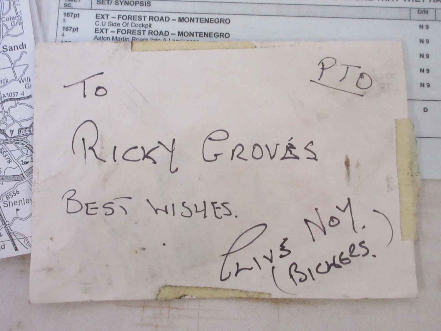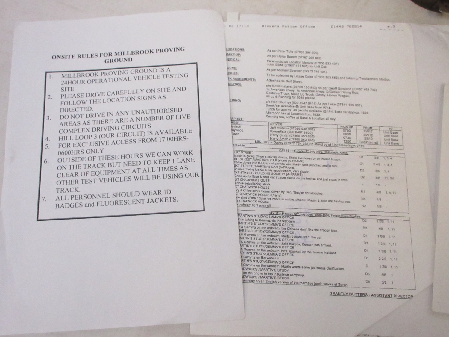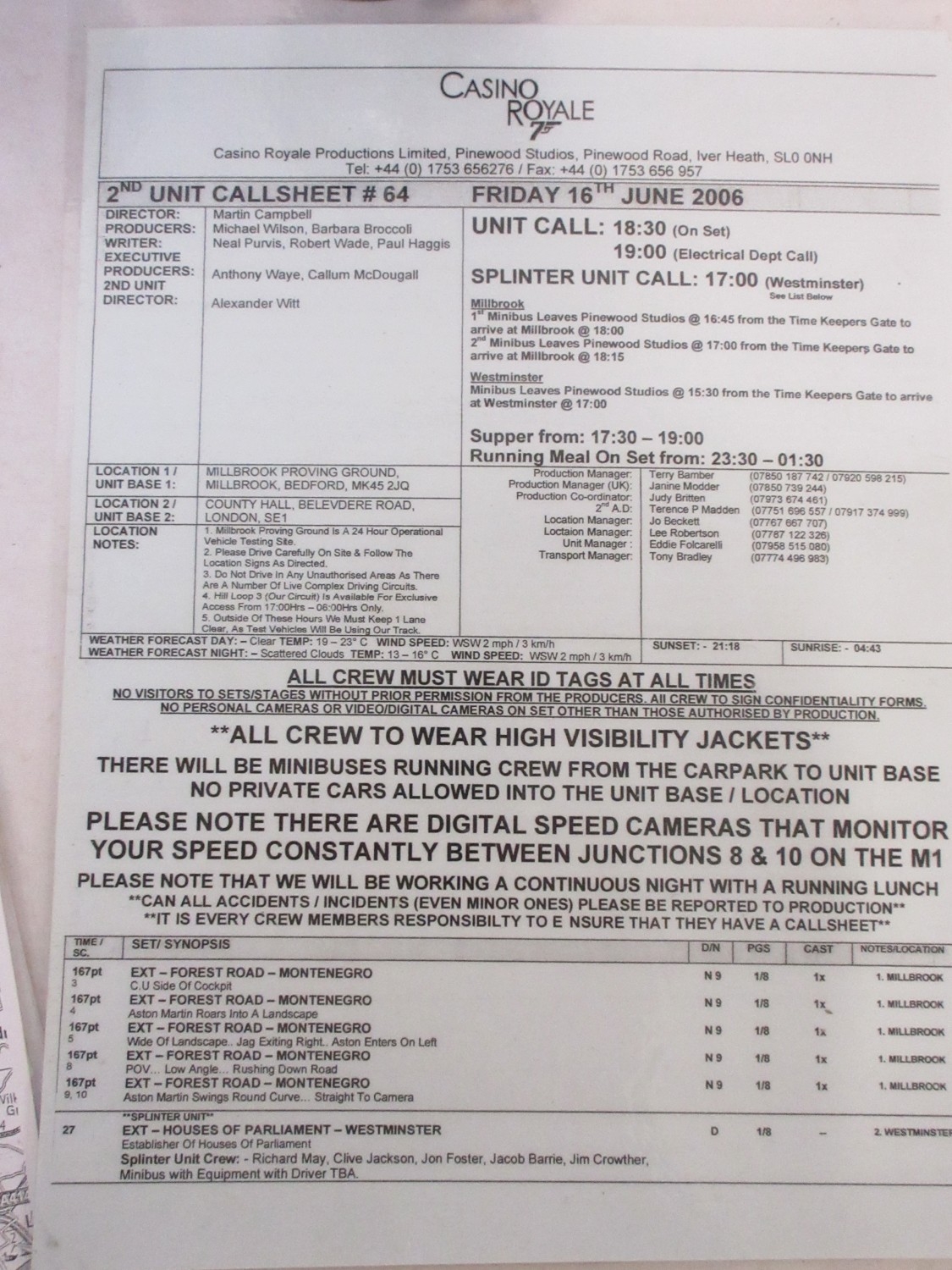 The Ricky Groves Collection - Casino Royale DB9 tail pipes from the wrecked DB9 at the Millbrook Proving ground with call sheets and paper relating to filming of scene, given to Ricky by James Bond stunt driver, Clive Noy