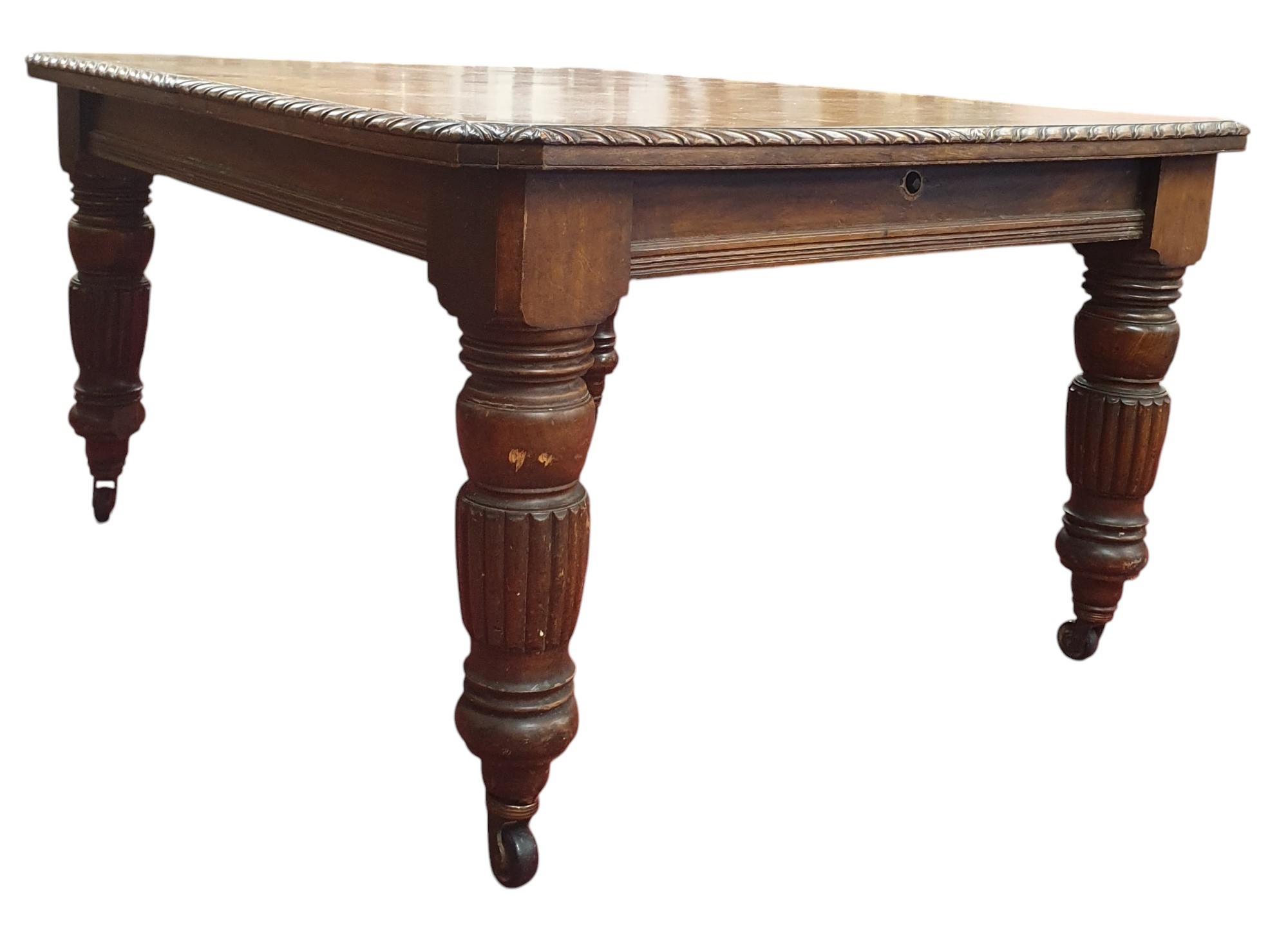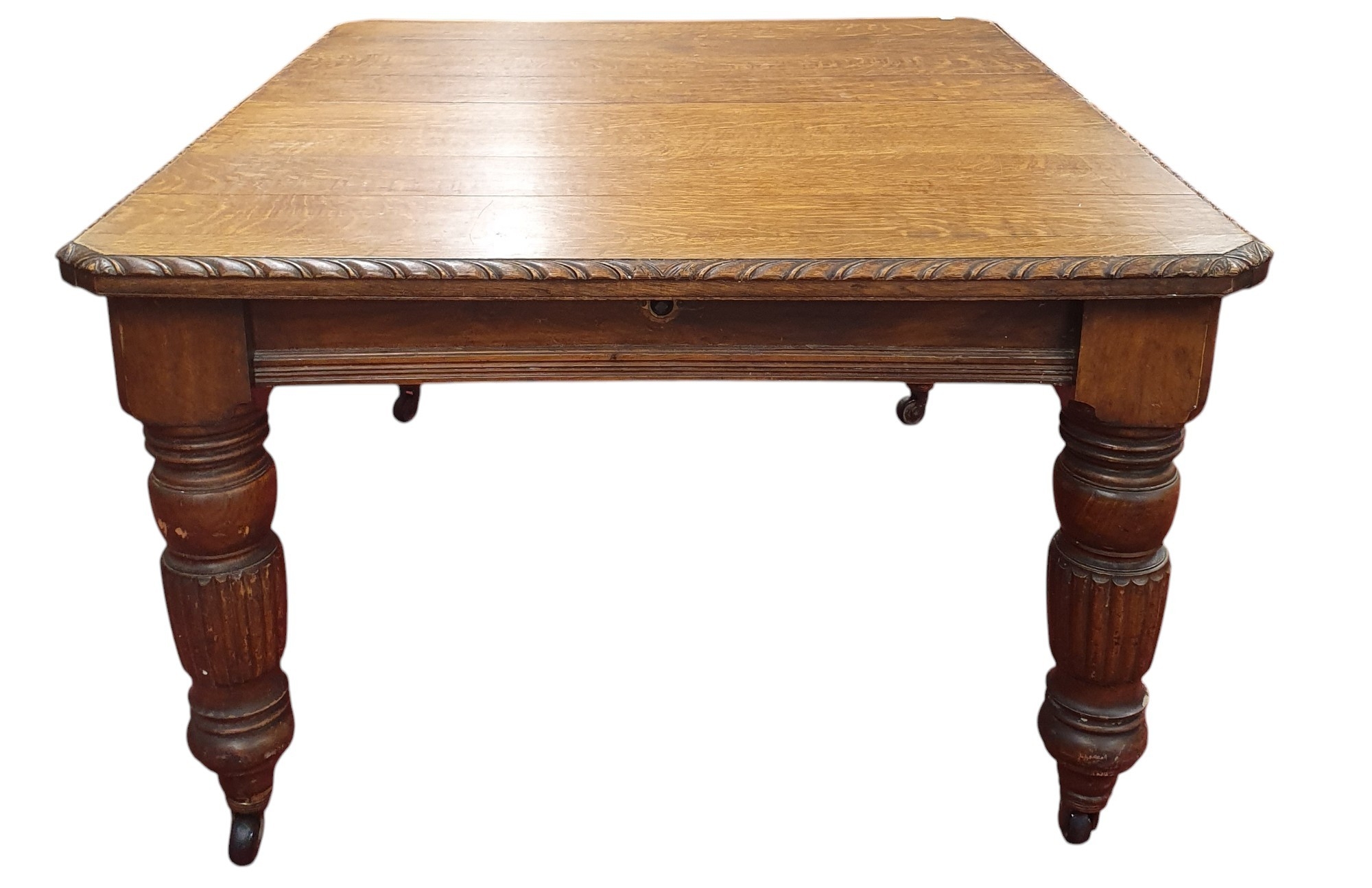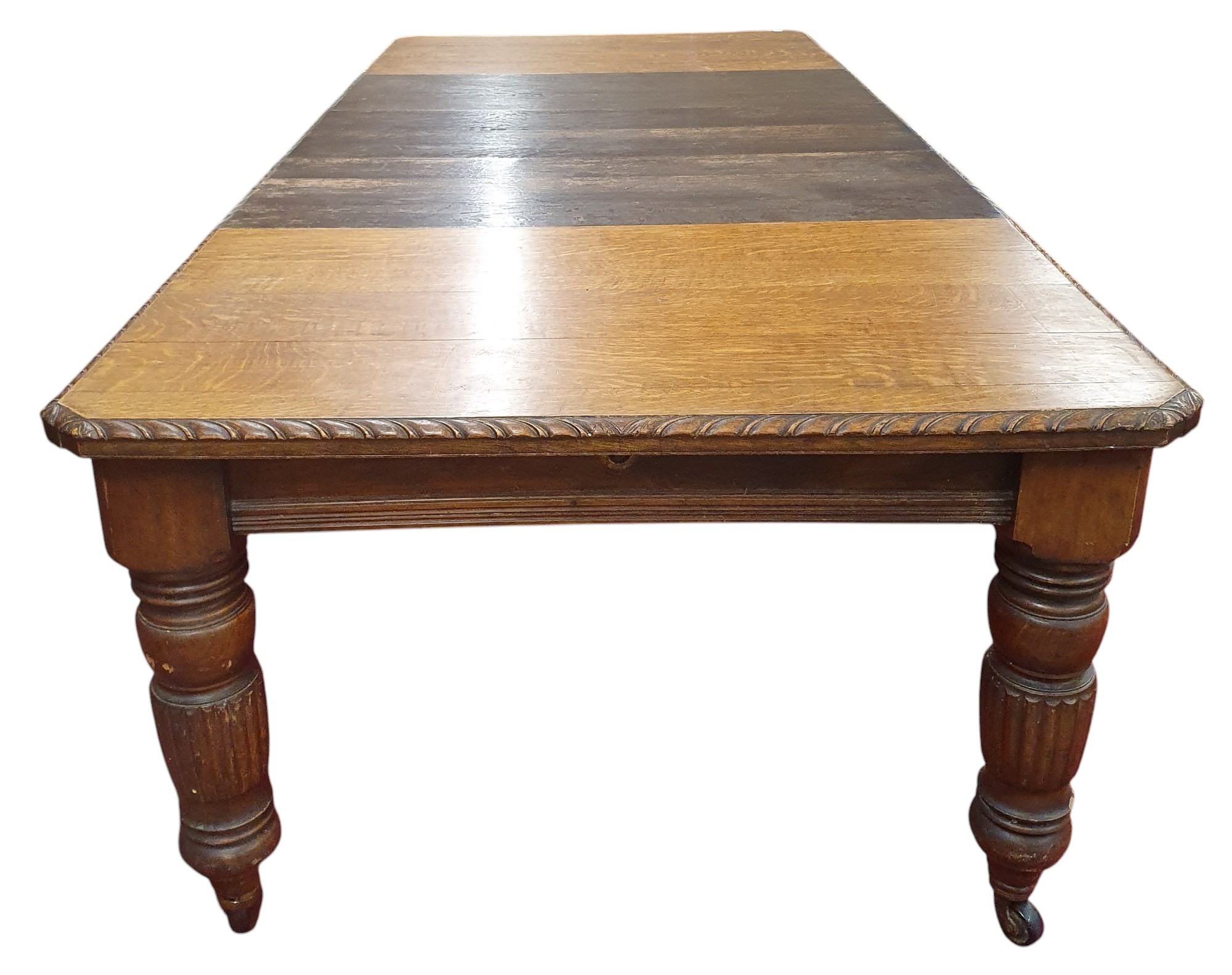 A good quality late 19th Century Oak Dining Table of large proportions on turned reeded supports, rope edge detail and three extra leaves.