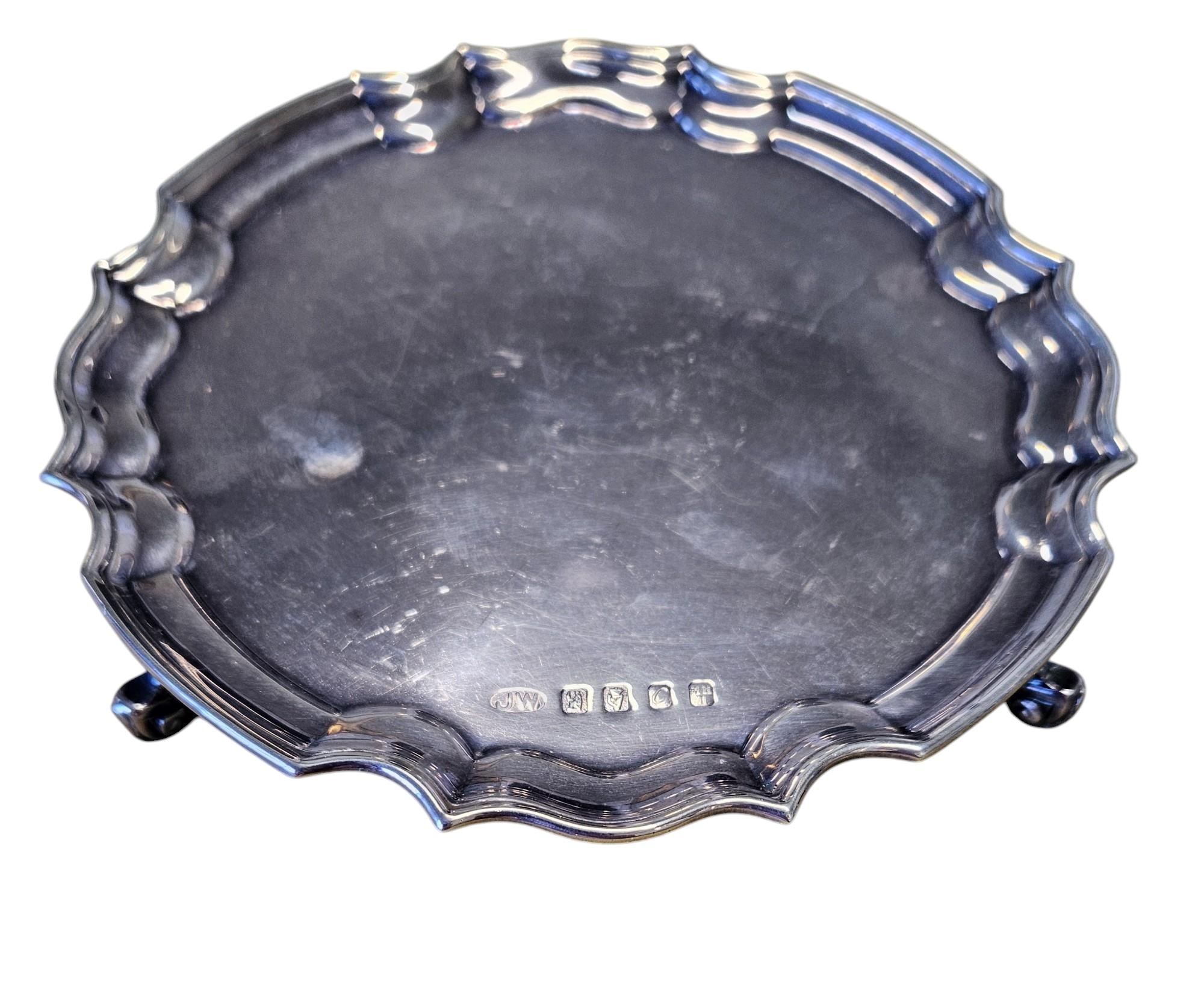 An Irish Silver Salver, Dublin 1988. 148 grams approx. Dublin City Millennium. The Company authorized the striking of a special mark to be put on all items of Irish manufactured gold, silver and platinum other than jewellery and watch cases manufactured and hallmarked during the period 1 January to 31 December 1988. The mark consists of a rectangular shield with corners chamfered containing three castles.