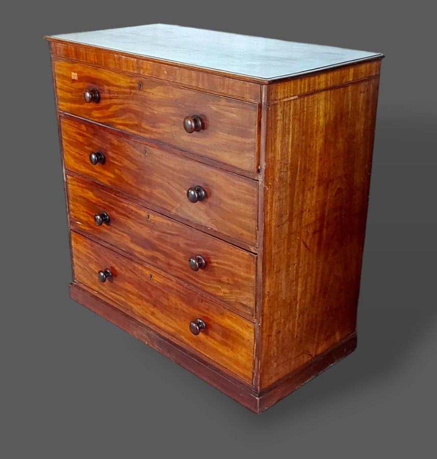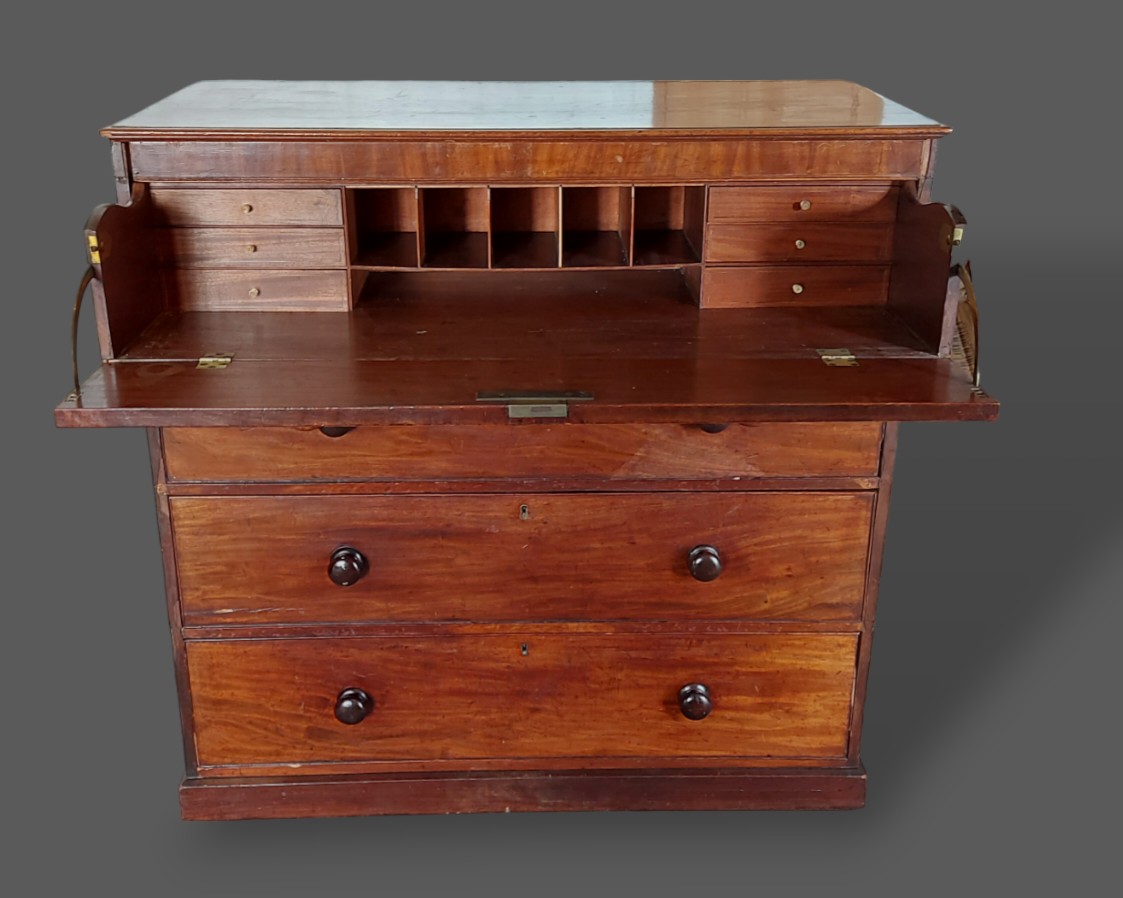A William IV mahogany secretaire chest, with a fitted secretaire drawer above three further drawers raised upon a plinth, 120cms wide, 59cms deep and 108cms tall