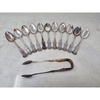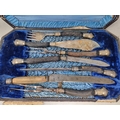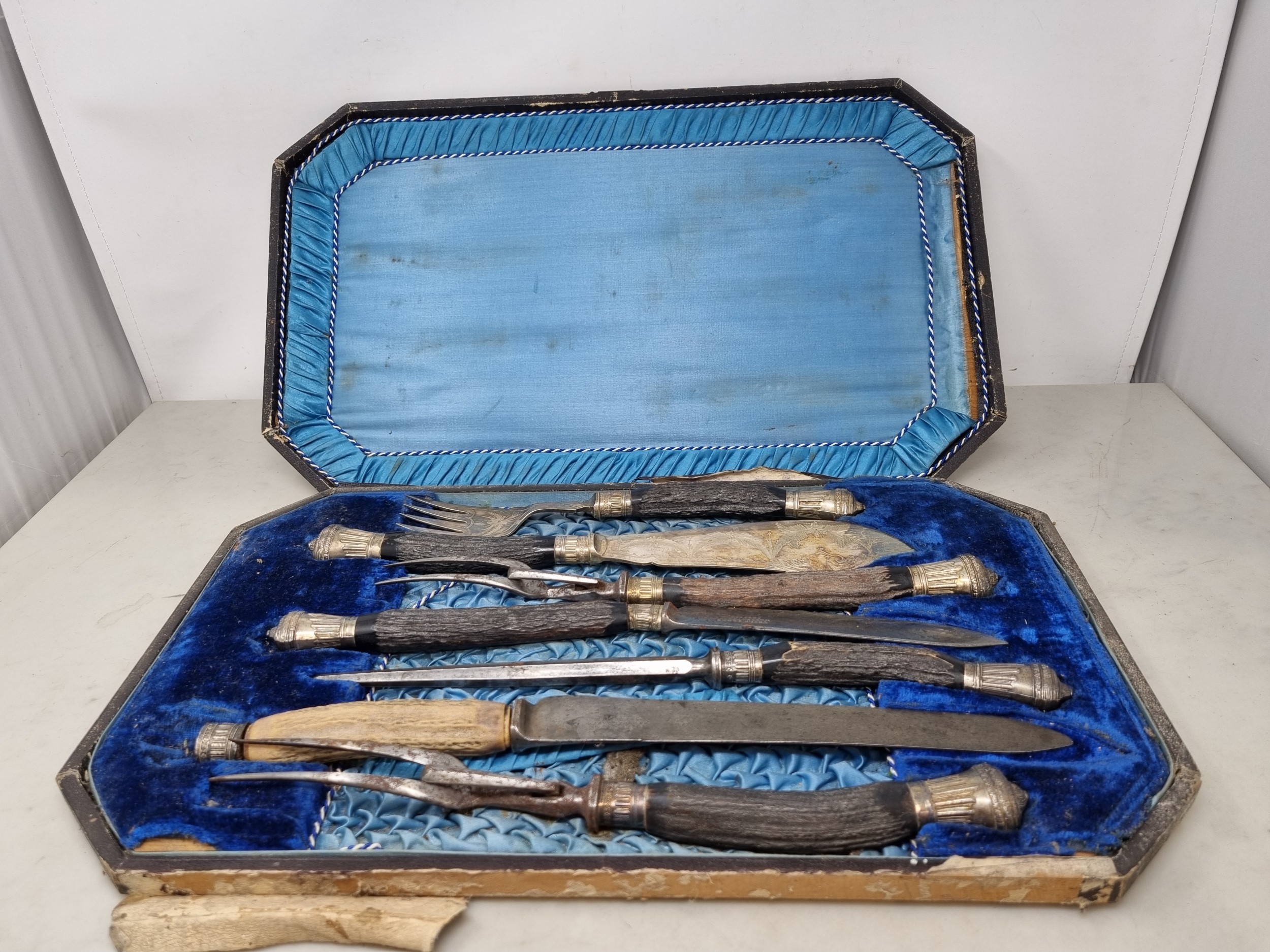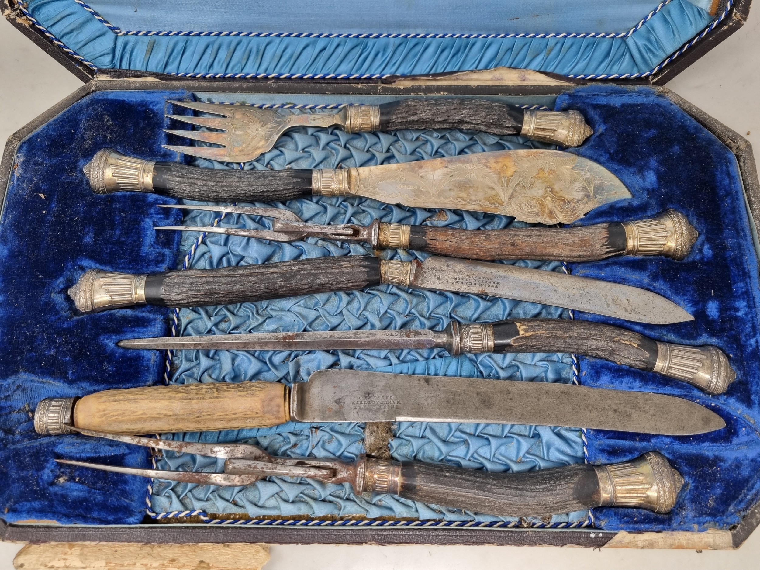 A Victorian silver mounted part Carving and Fish Serving Set with antler handles, Sheffield 1889,in case, includes an oddknife