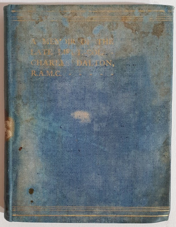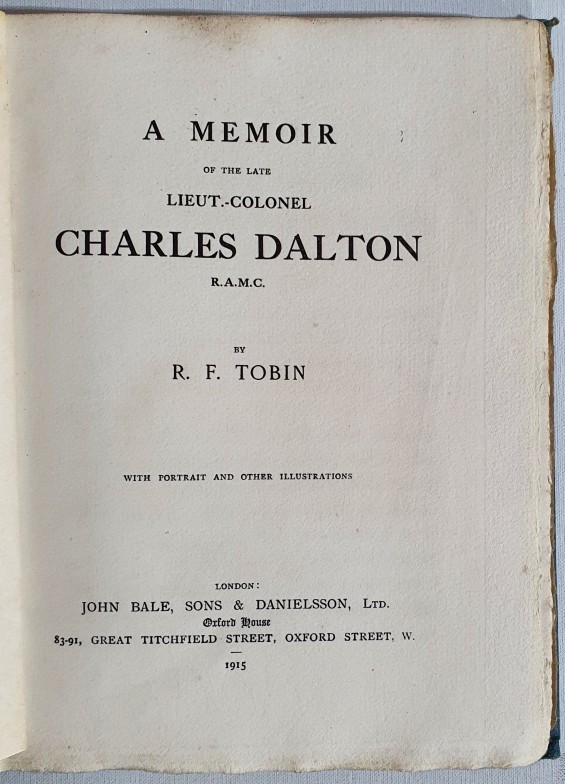 A memoir of the late Lieut.- Colonel Charles Dalton R.A.M.C / by R.F. Tobin. Original boards, all plates present, Pp. 79. Signed to the verso of the front board. [Mrs Jameson from the author Christmas 1915] Dalton was an Irish doctor and senior army officer killed in action on September 18, 1914, during the Battle of the Aisne, and posthumously recognised in 1915 for his gallantry in carrying wounded soldiers under fire and died from wounds sustained during the battle Tobin (1843–1919) was a prominent Irish surgeon and Lieutenant-Colonel in the Royal Army Medical Corps