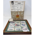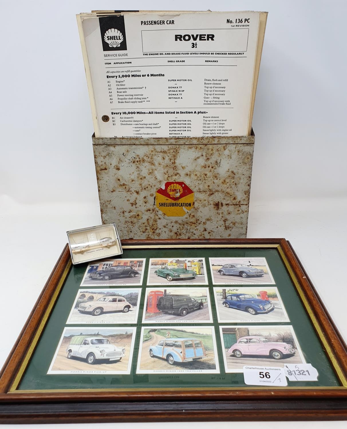 A Shell SHELLUBRICATION box with charts, 23 cm wide, a pair of Triumph Herald cufflinks, and a set of nine Golden Era trade cards, Morris Minors, framed as one (3)