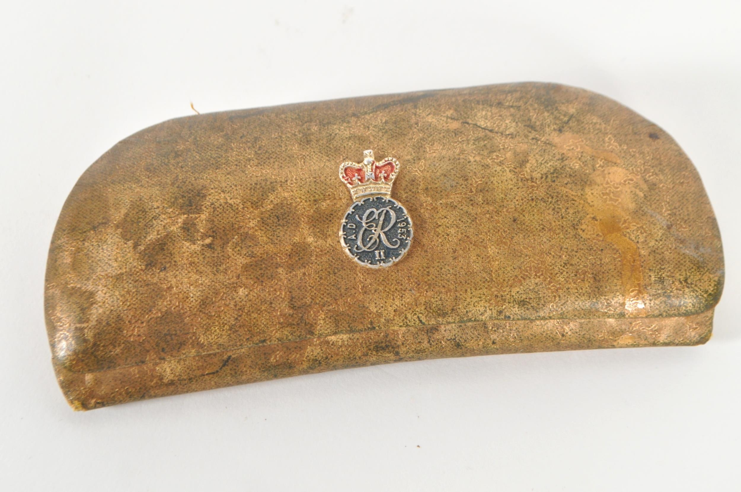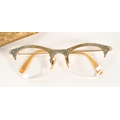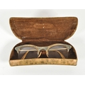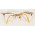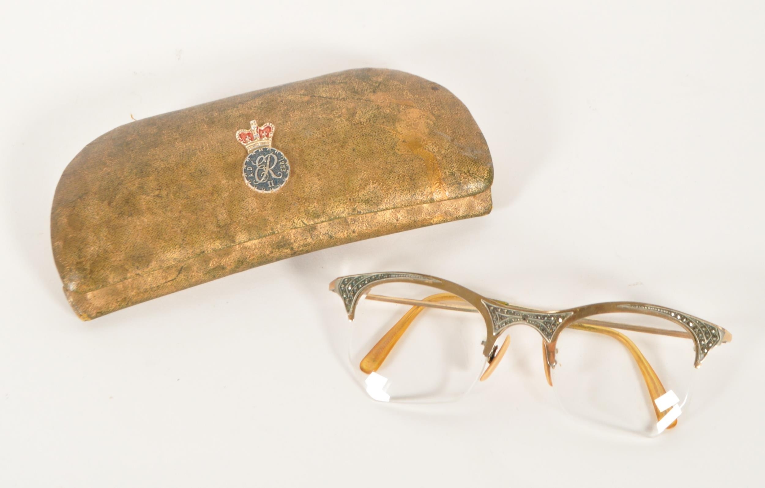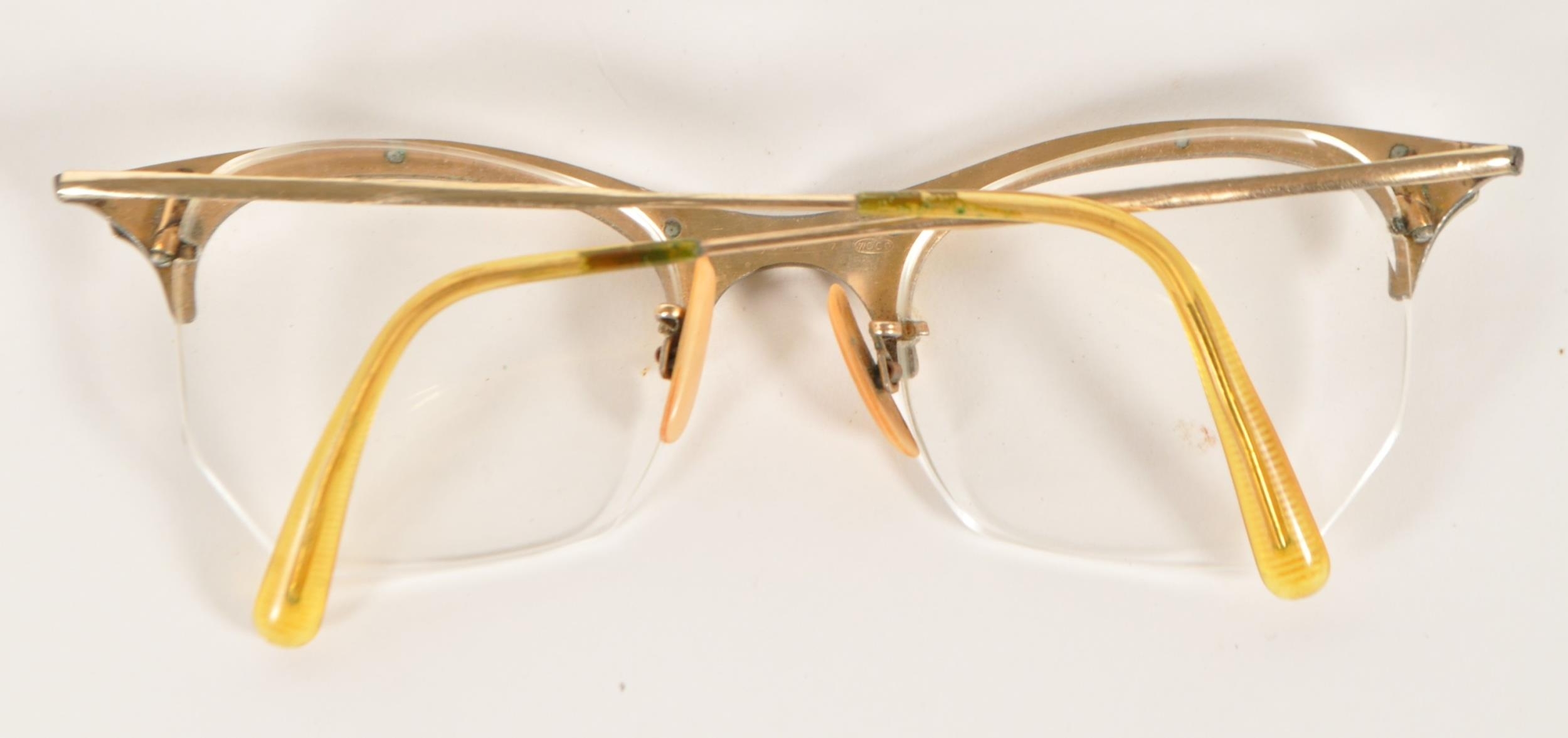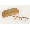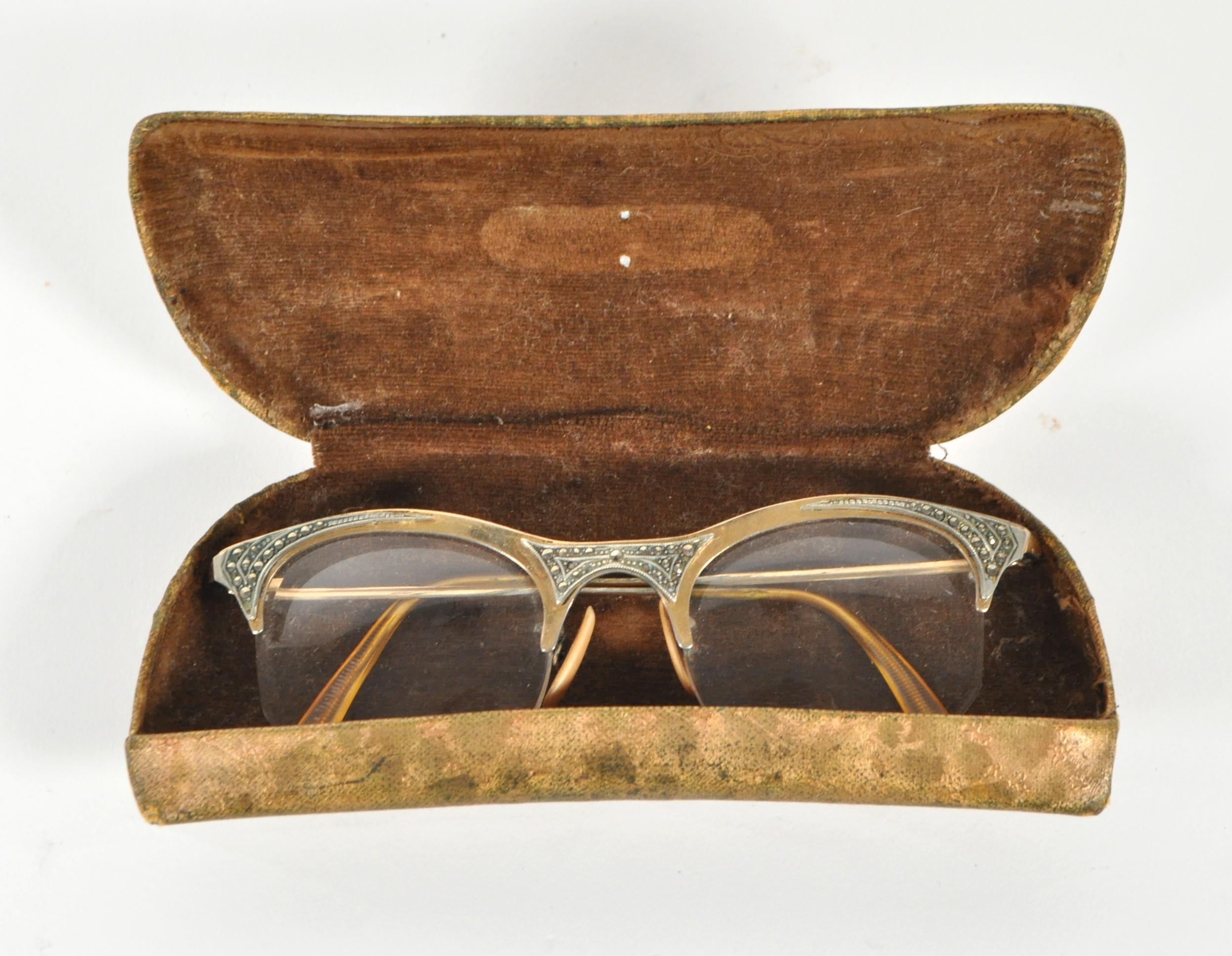 Goldray - A mid 20th century pair of cat eye reading glasses. Having a gilt frame and arms, frameless lenses with diamanté decoration. With flip over carry case.