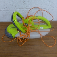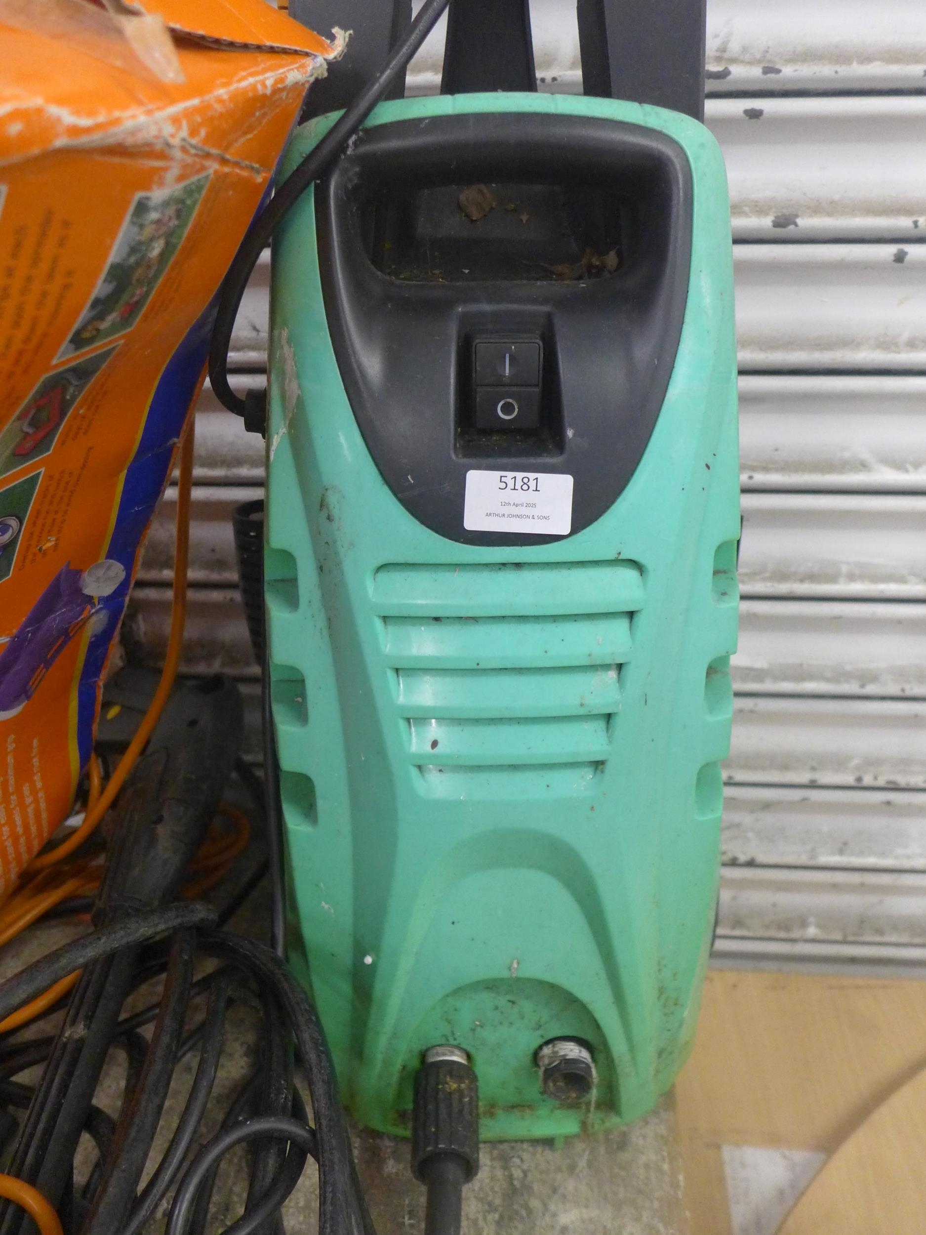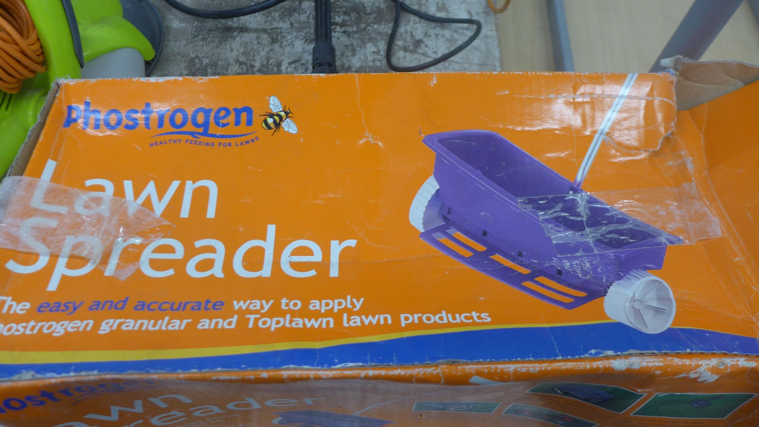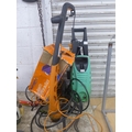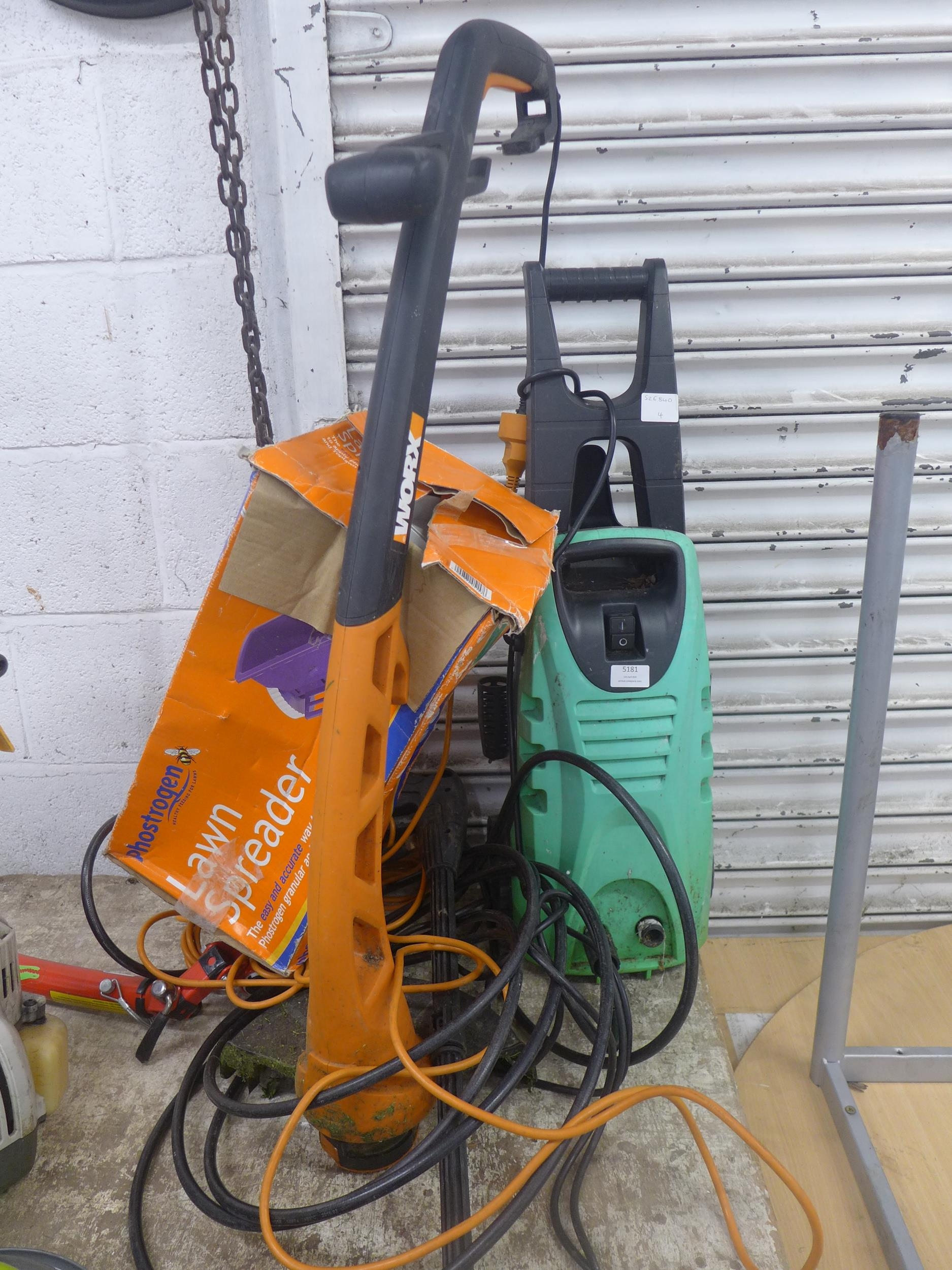 A green 240V pressure washer and a Worx, 240V garden strimmer and lawn spreader