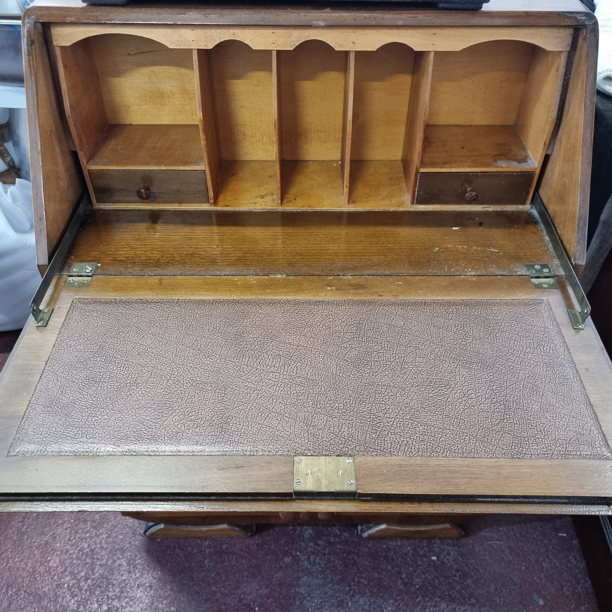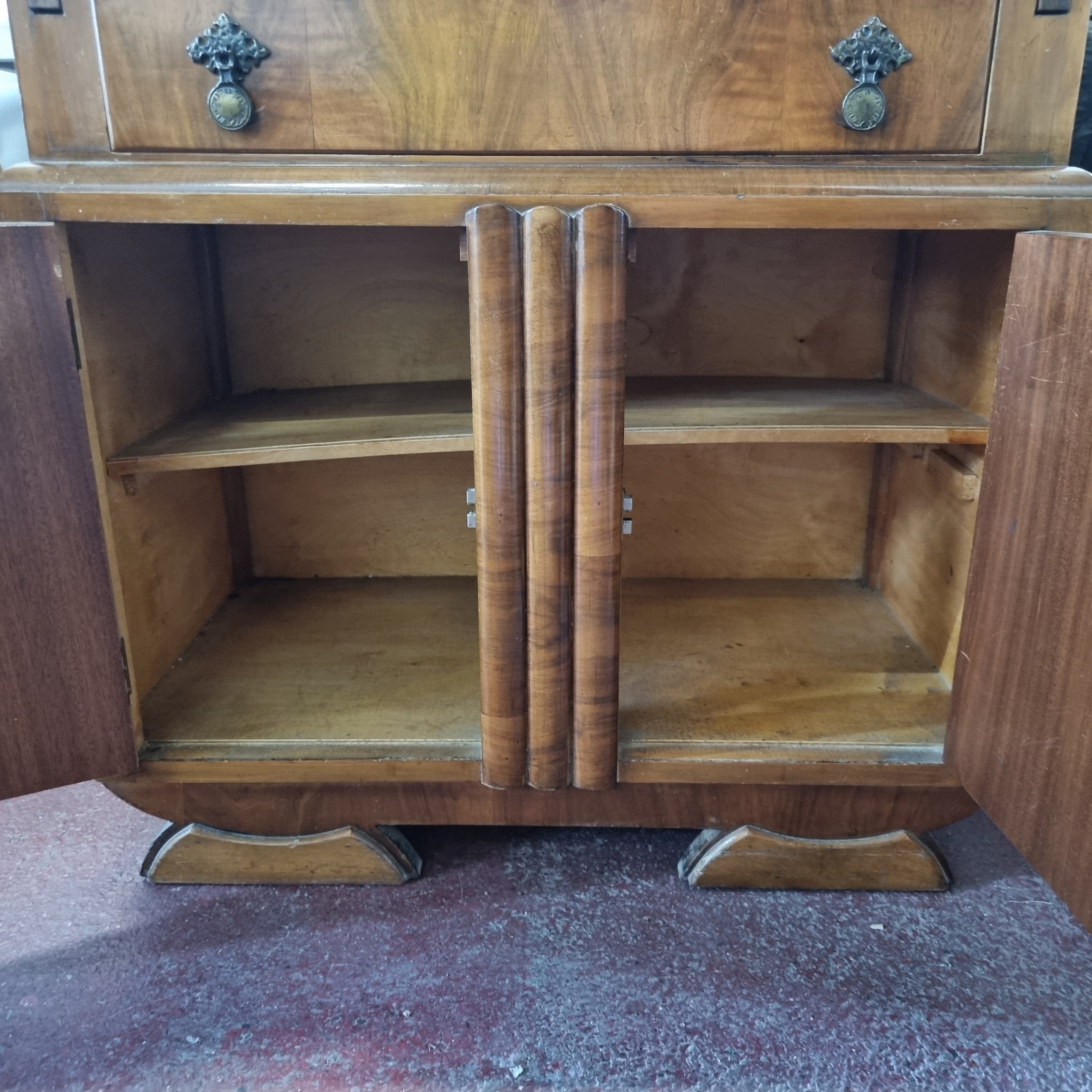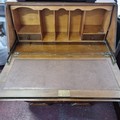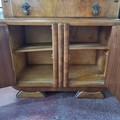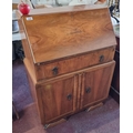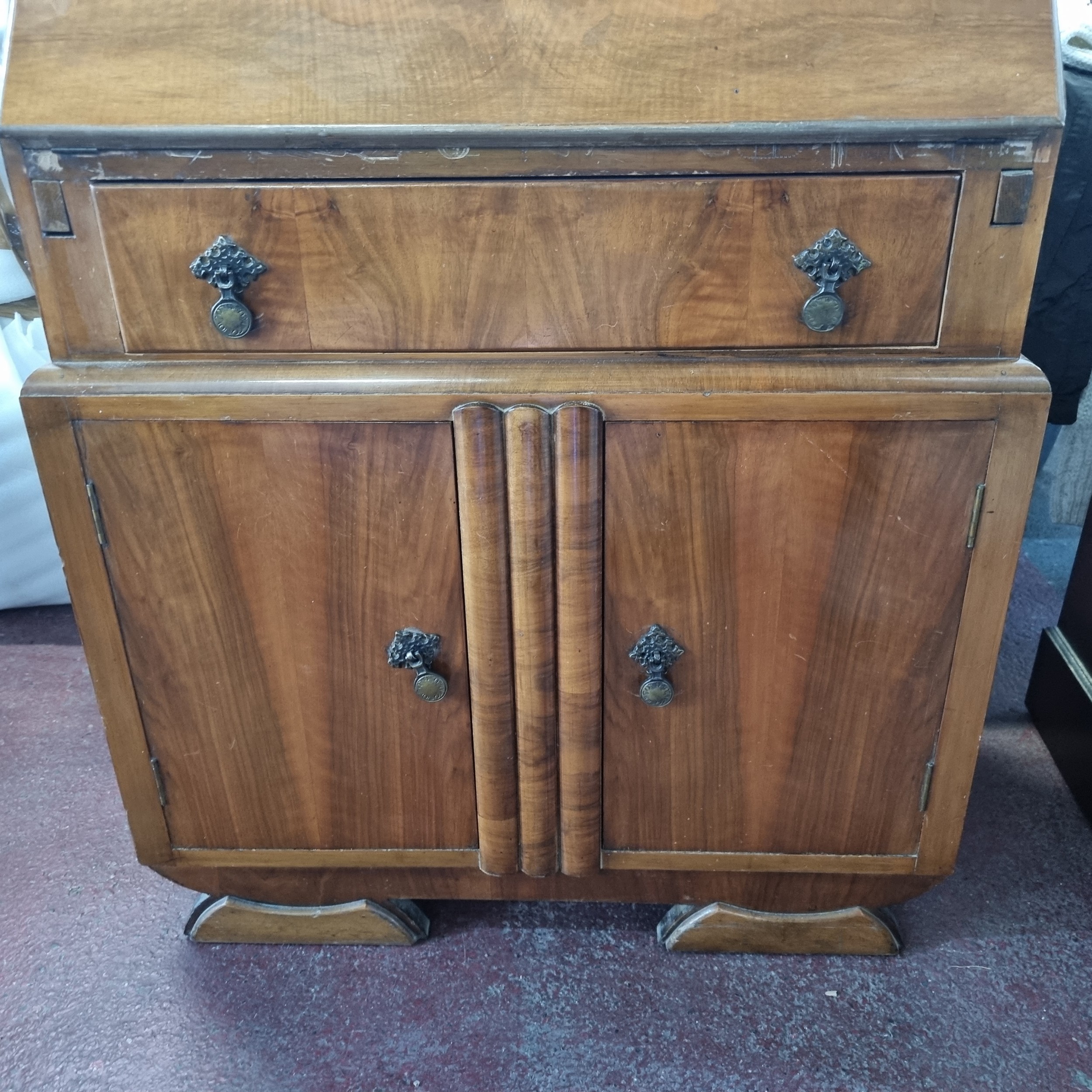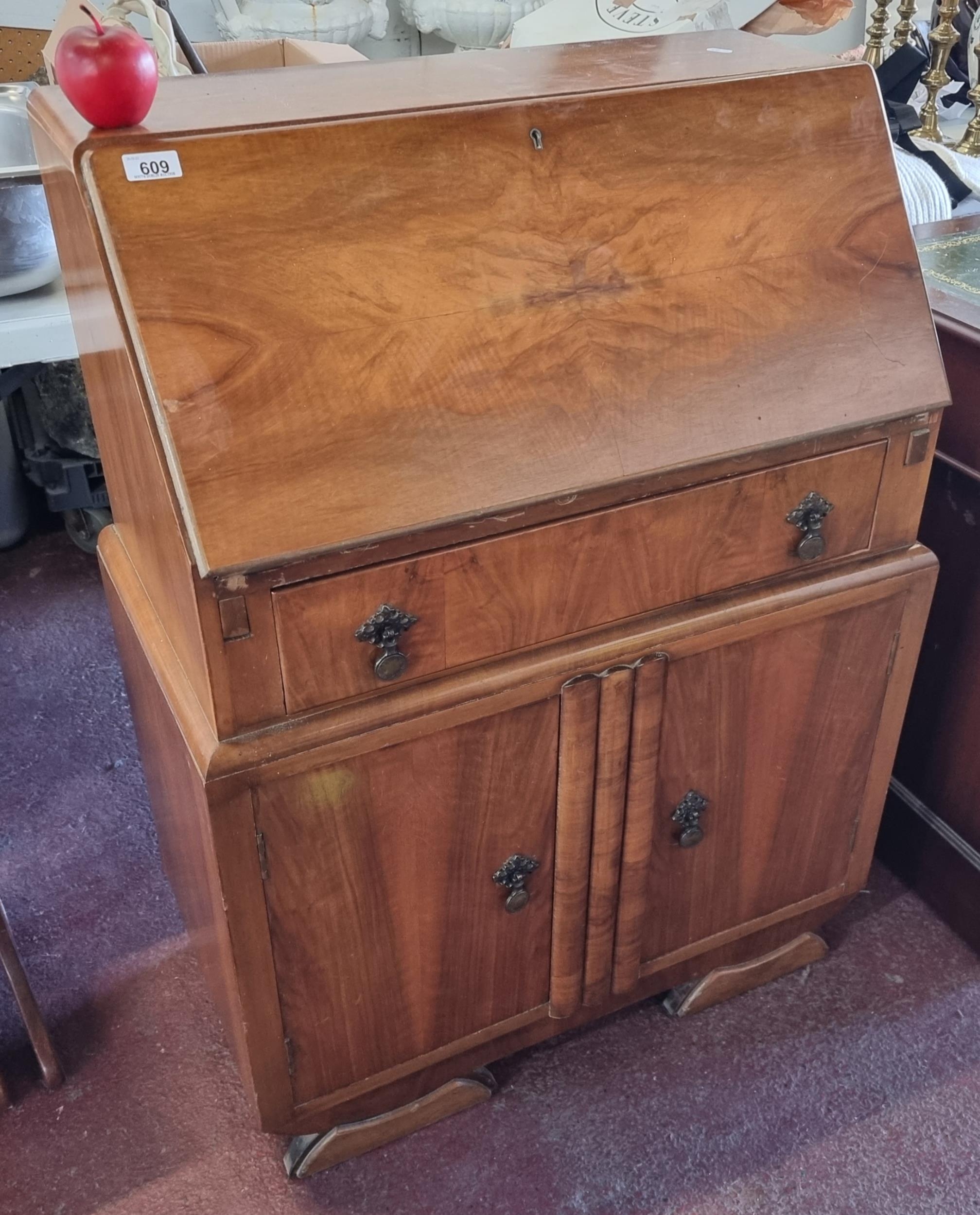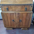 A stunning art deco fire mahogany writing bureau with two cupboards to base and a drawer with drop pull handle, the top opens to reveal a leather upholstered writing surface.