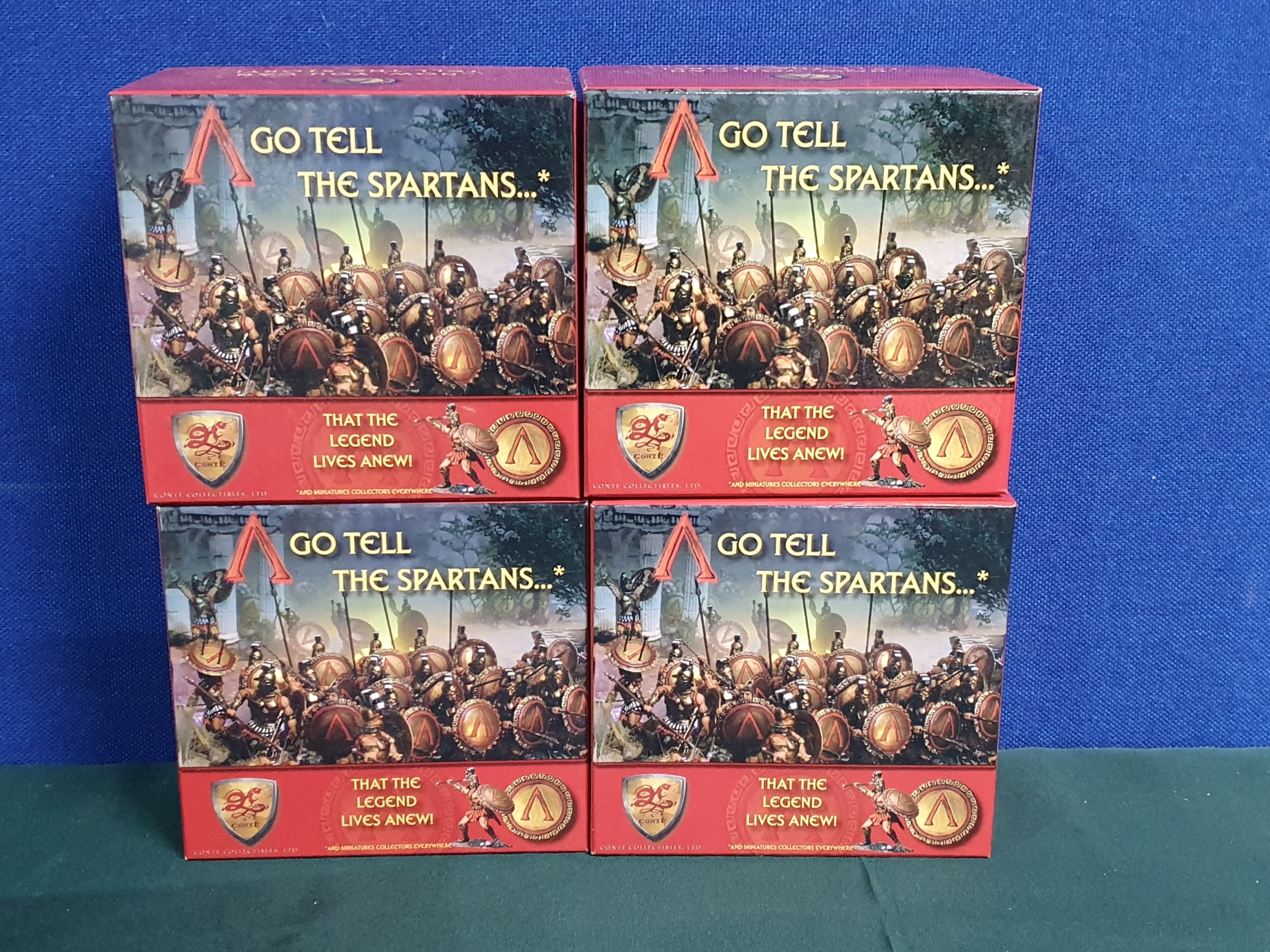Four boxed Conte Collectibles 'Go Tell the Spartans' Figures and Groups comprising 'AG028 'With your Shield or upon it', 2x AG034 'Immortal Officer Attacking' and AG023 'Immortals Command Set', all unused as new