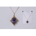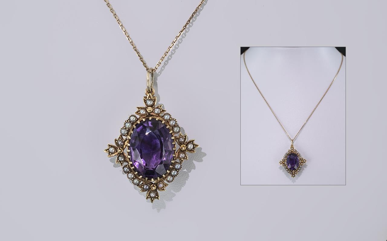 Mid - Victorian Superb 15ct Gold Amethyst and Black Seed Pearl Set Pendant Drop of Exquisite Form / Design. Marked 15ct. c.1860. The Large Faceted Natural Amethyst of Excellent Natural Colour. Est 7.00 cts. Later 9ct Gold Chain. Height of Pendant 1.5 Inches - 3.75 cms. Pristine Condition In All Aspects - Please Confirm with Photo.