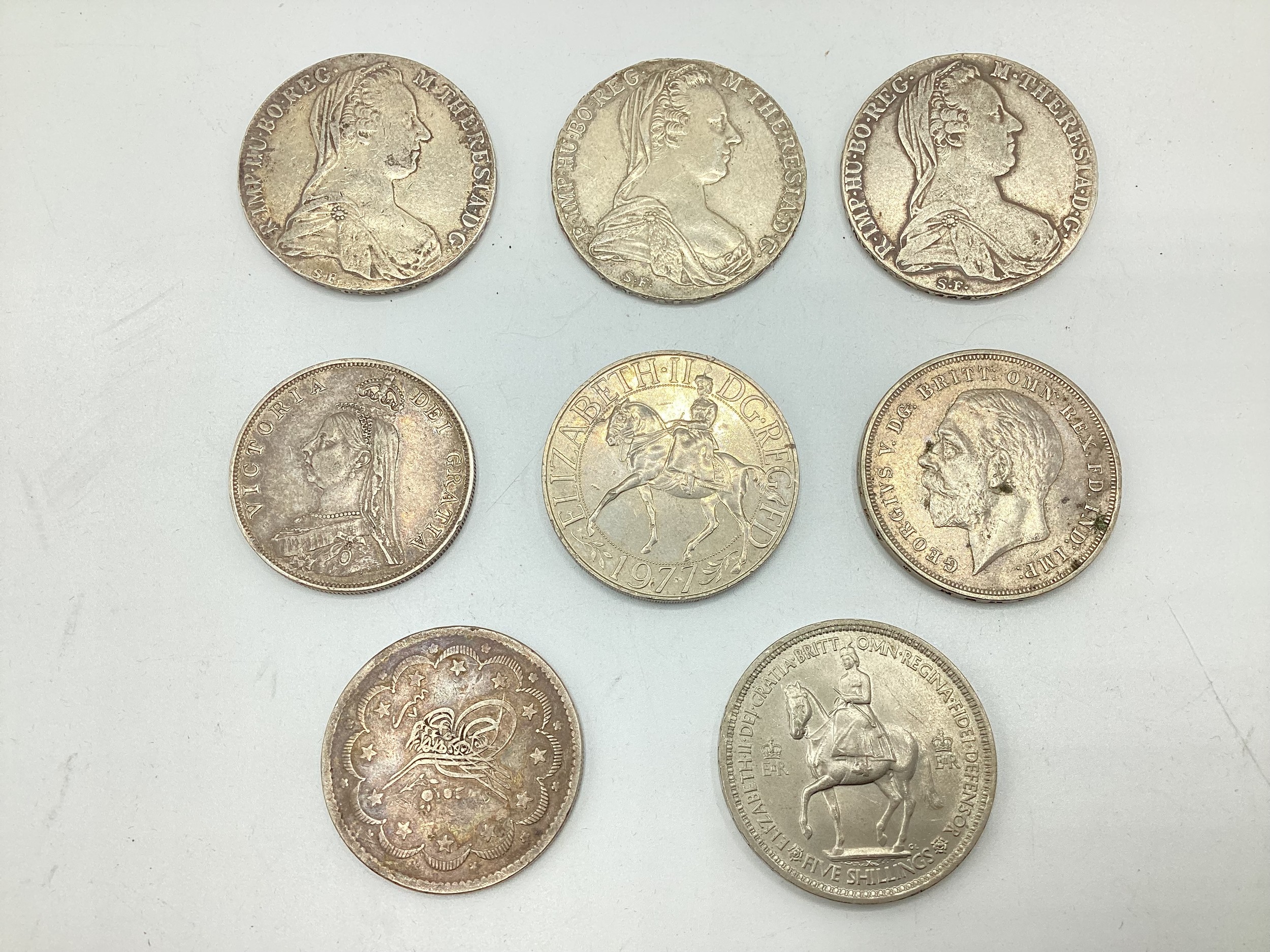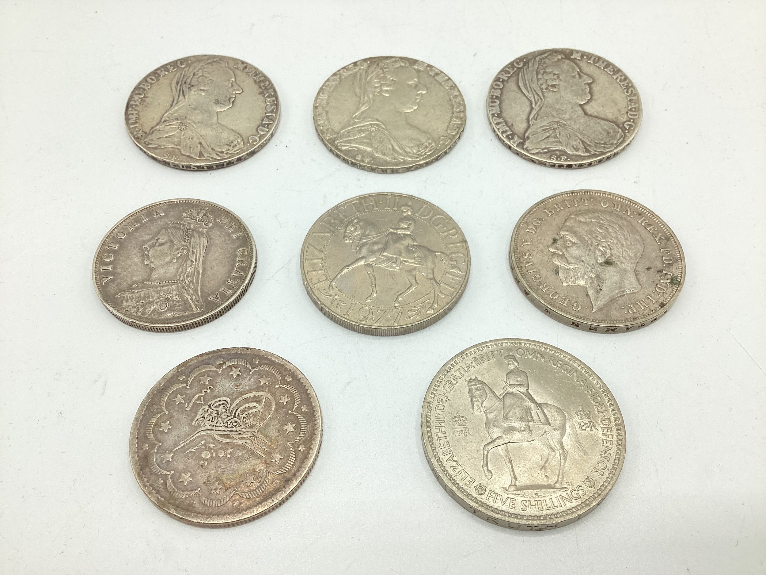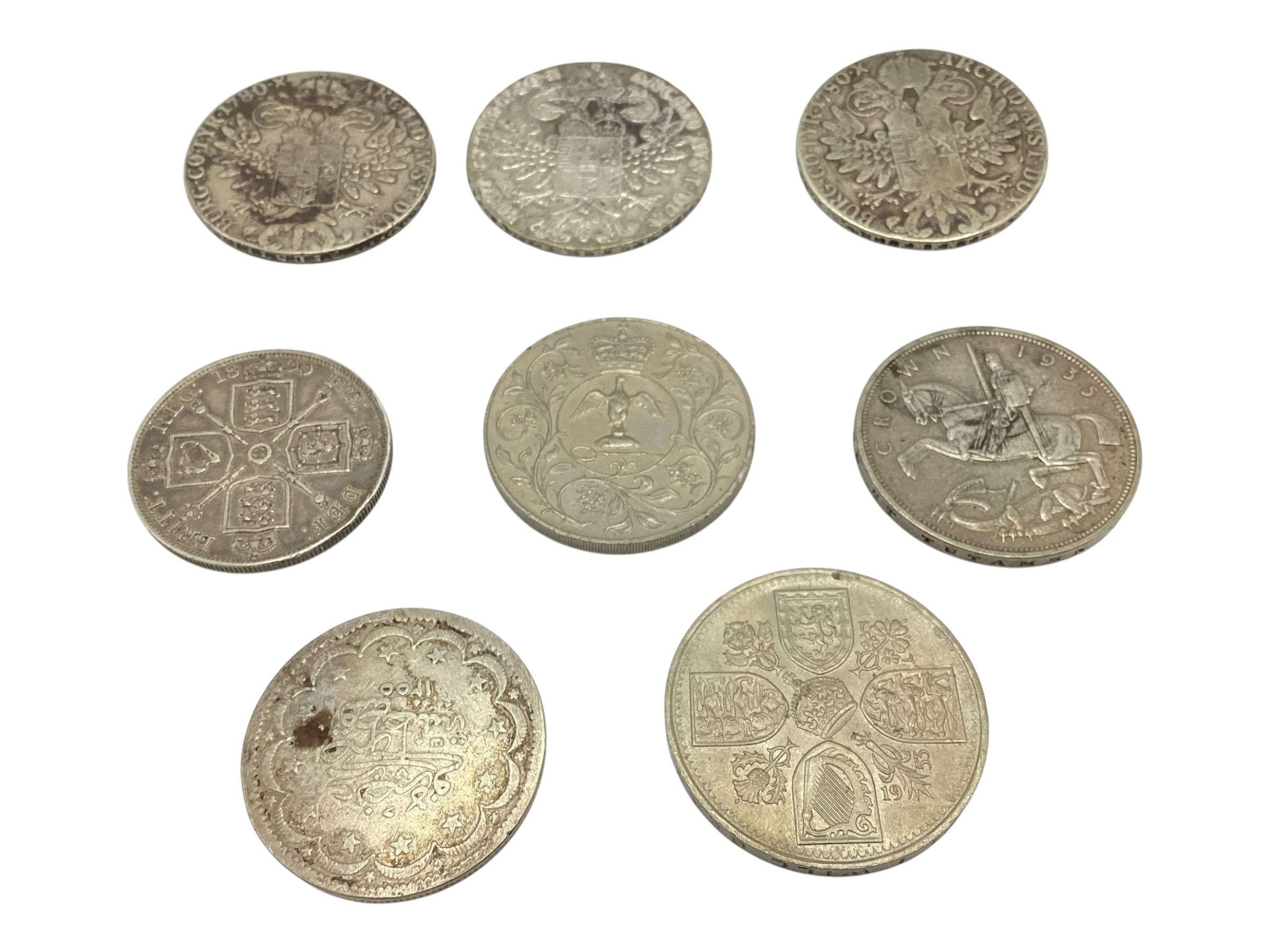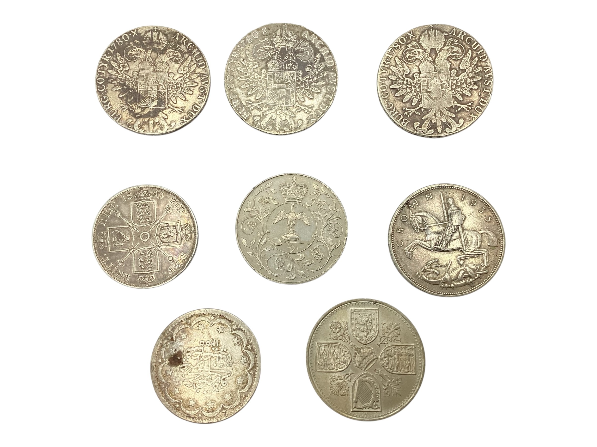Three Maria Theresa coins dated 1780 together with a Victorian 1890 double florin and an Ottoman white metal coin together with three commemorative coins.