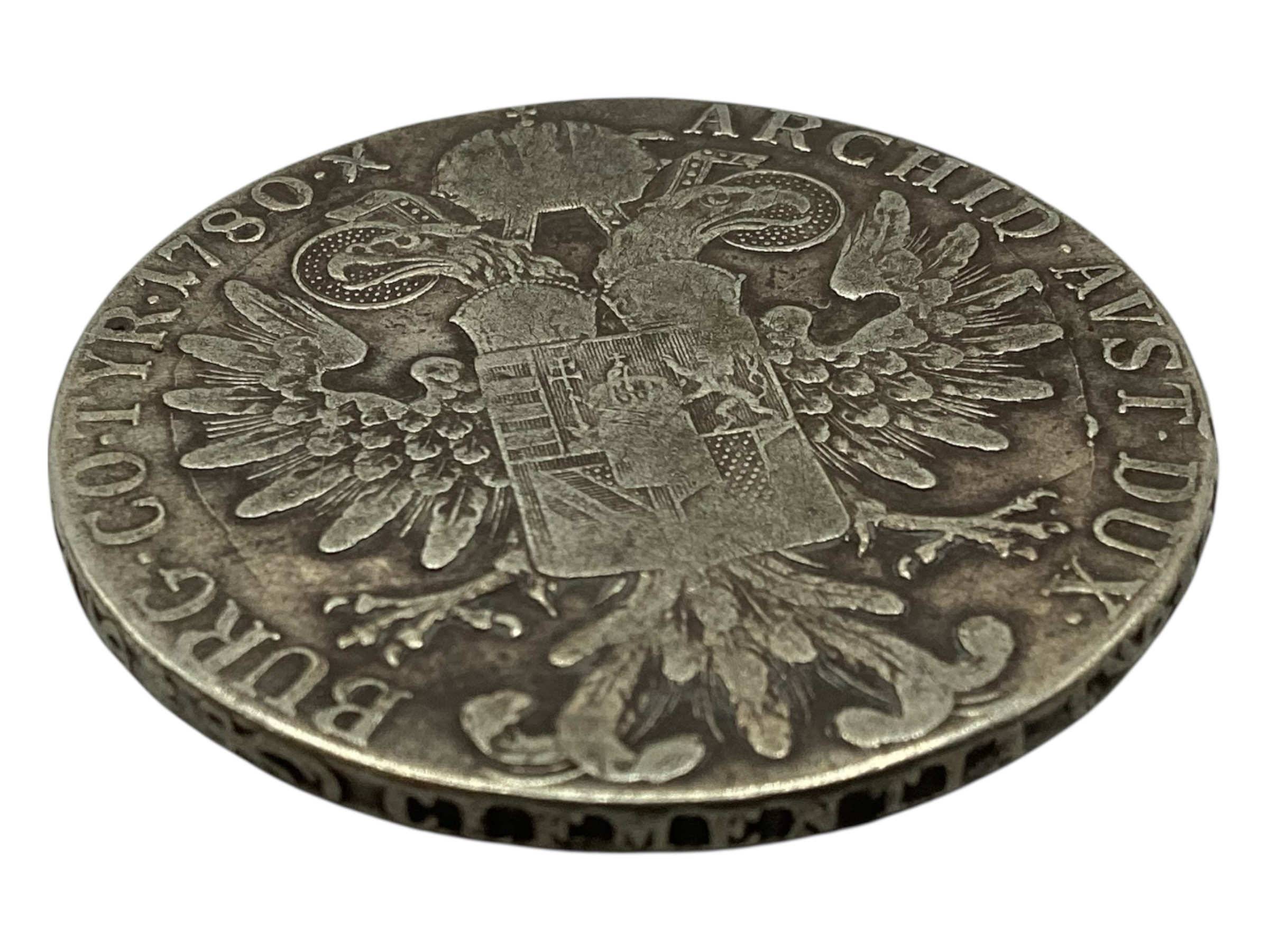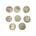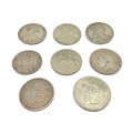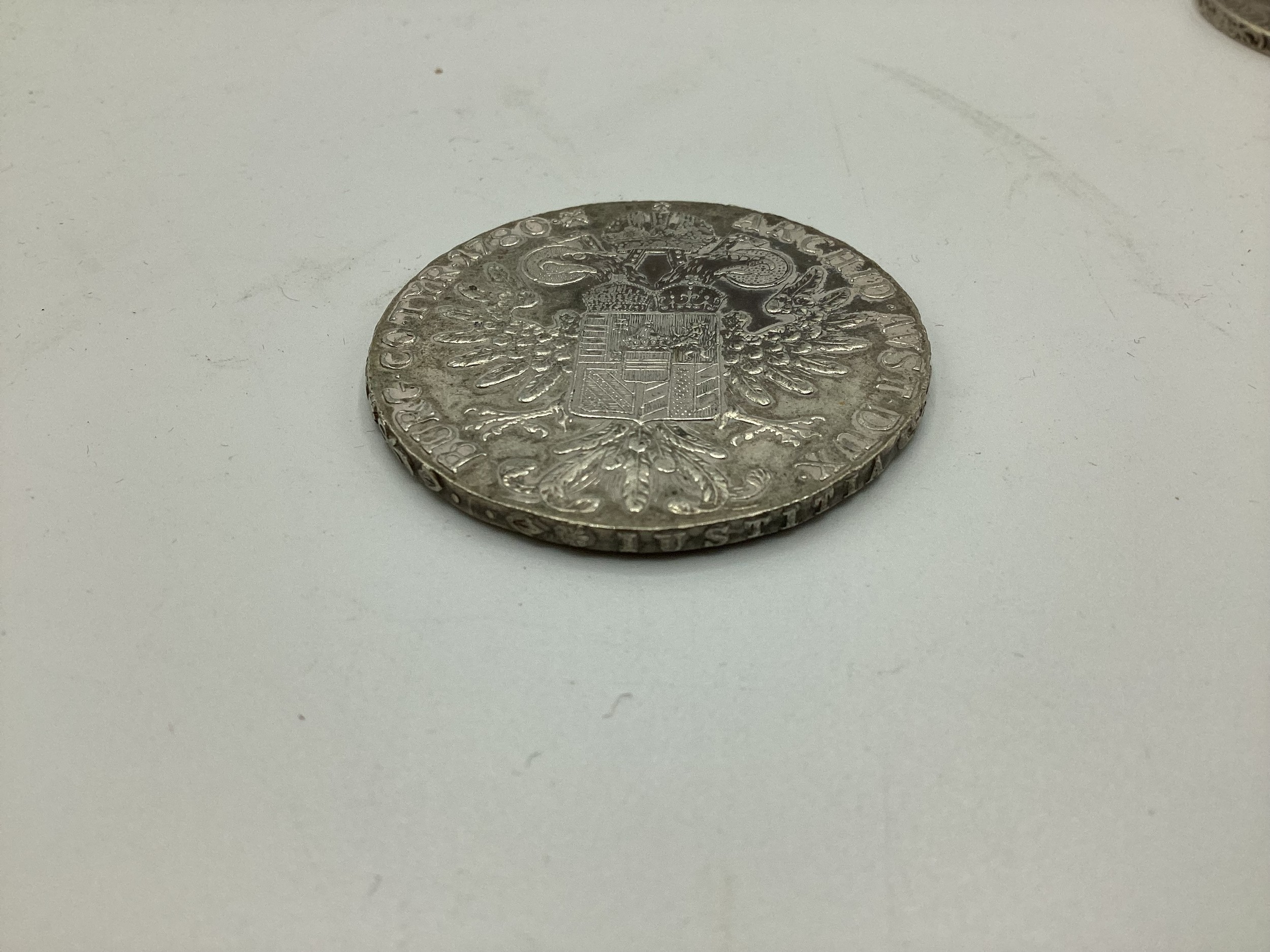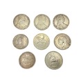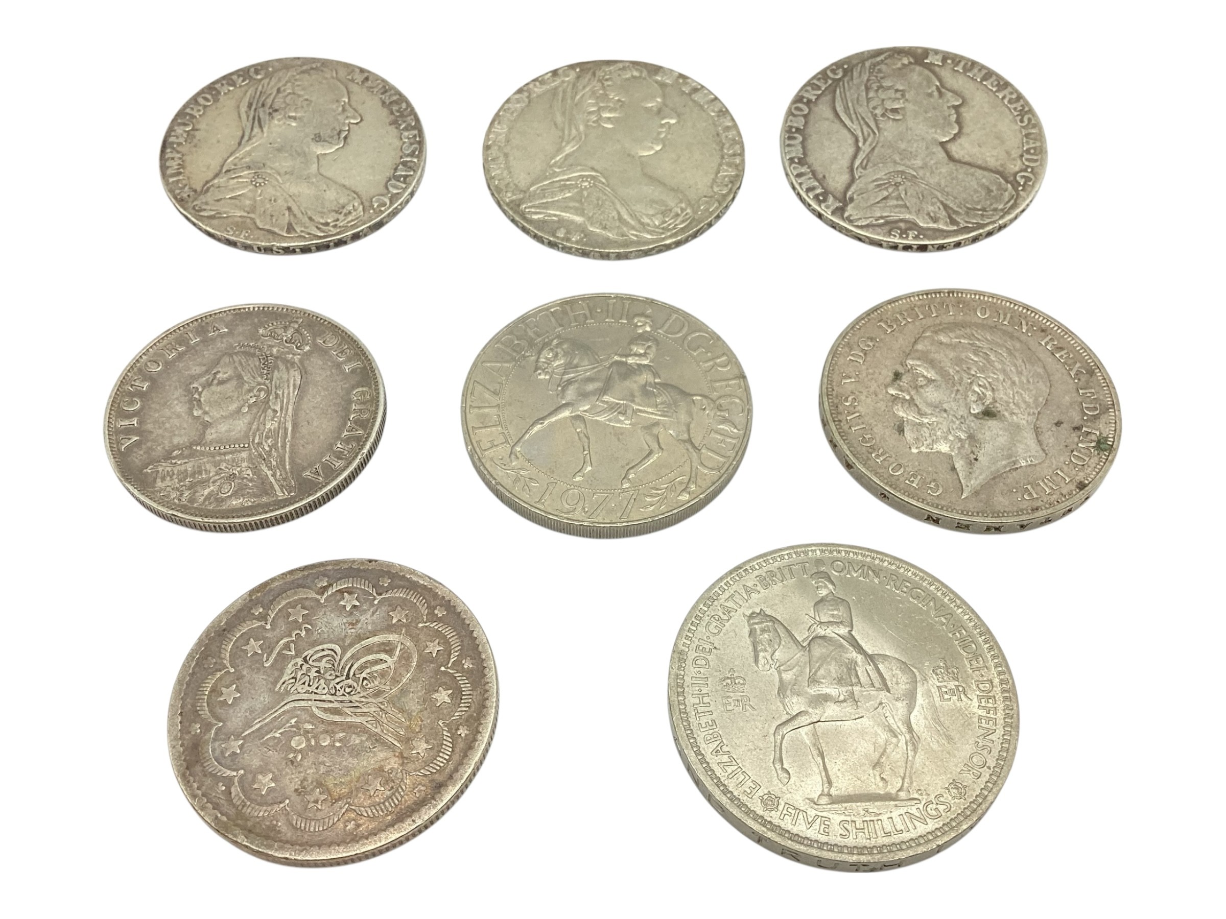 Three Maria Theresa coins dated 1780 together with a Victorian 1890 double florin and an Ottoman white metal coin together with three commemorative coins.