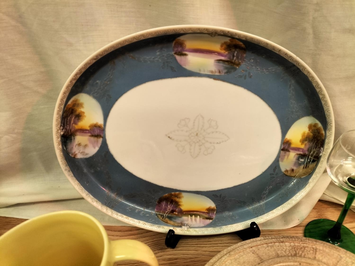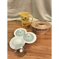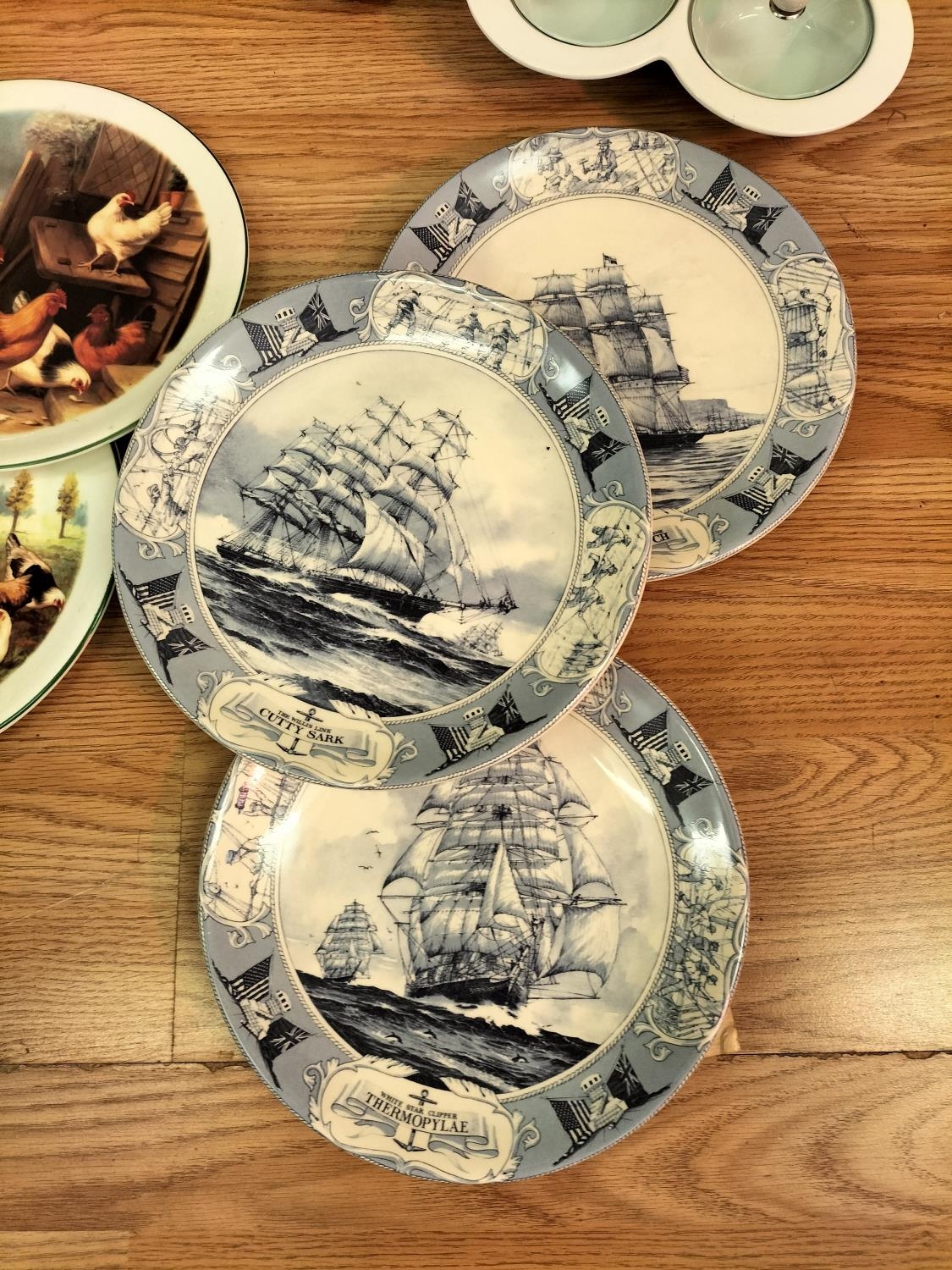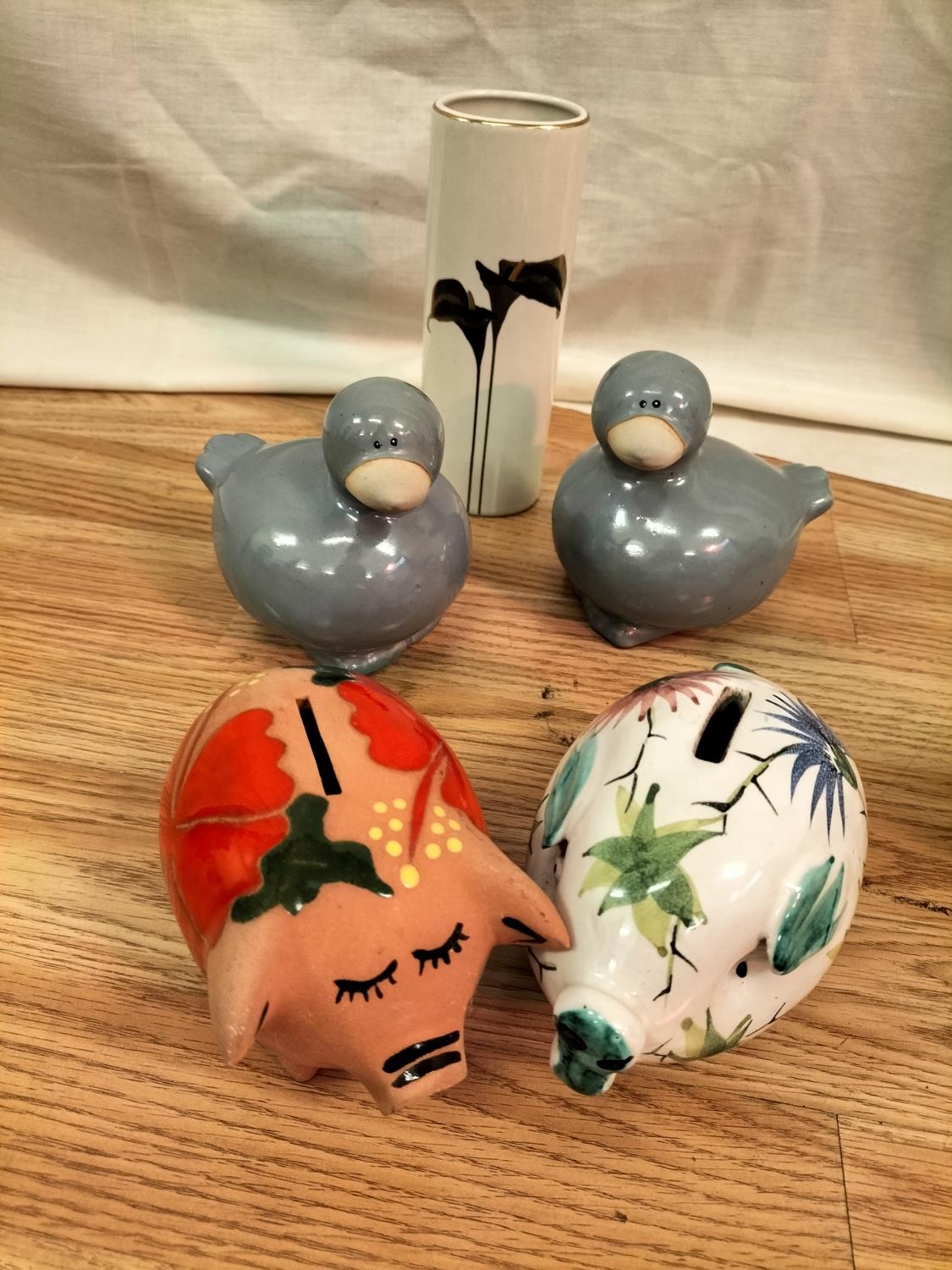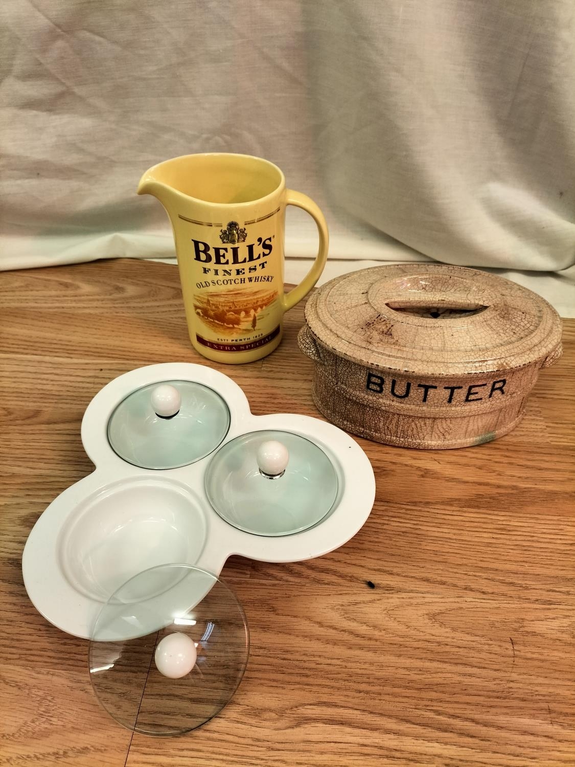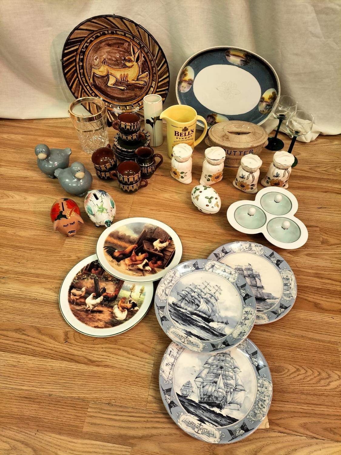 Collection of Ceramics and Glass to include Wade Whisky Jug, Butter Dish (A/F). Condiment Set, Piggy Banks, Plates and Large Plaque.