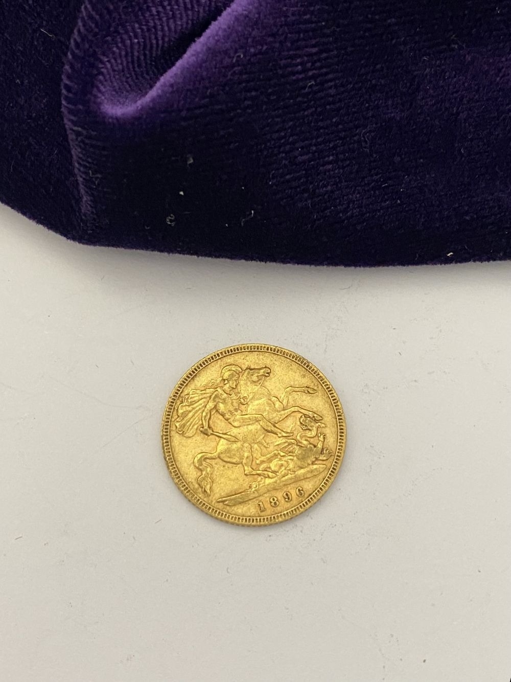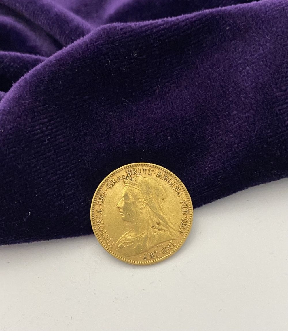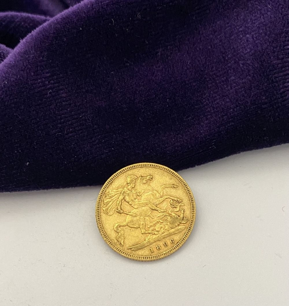 A VICTORIA GOLD HALF-SOVEREIGN – 1896, Jubilee portrait of Queen Victoria, crowned, veiled bust facing left, Latin legend VICTORIA DEI GRATIA and toothed border surrounding. The reverse with crowned quartered shield of the Royal arms in frame, Latin legend BRITANNIARUM REGINA FID: DEF and toothed border surrounding. Weight: 3.97g. The Latin legend translates as “Victoria, by the Grace of God’ to the front and “Queen of the Britons, Defender of the Faith” to reverse. Condition as photographed