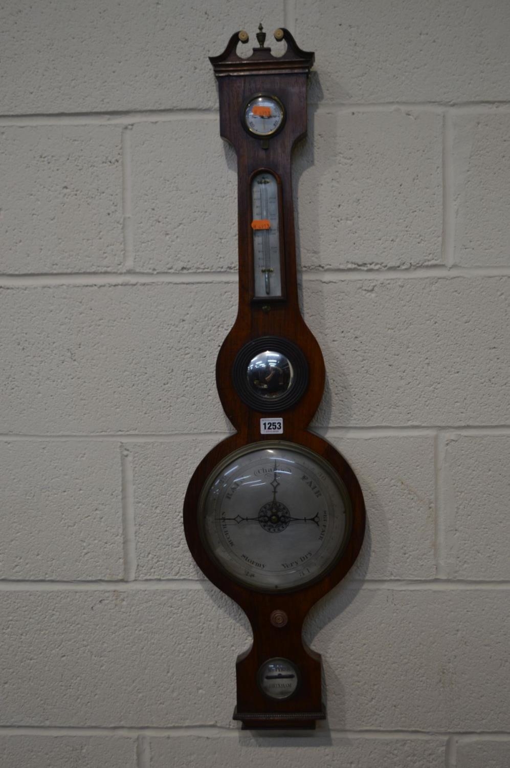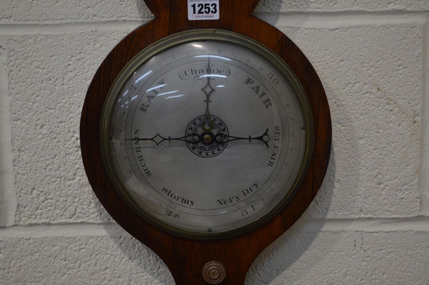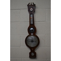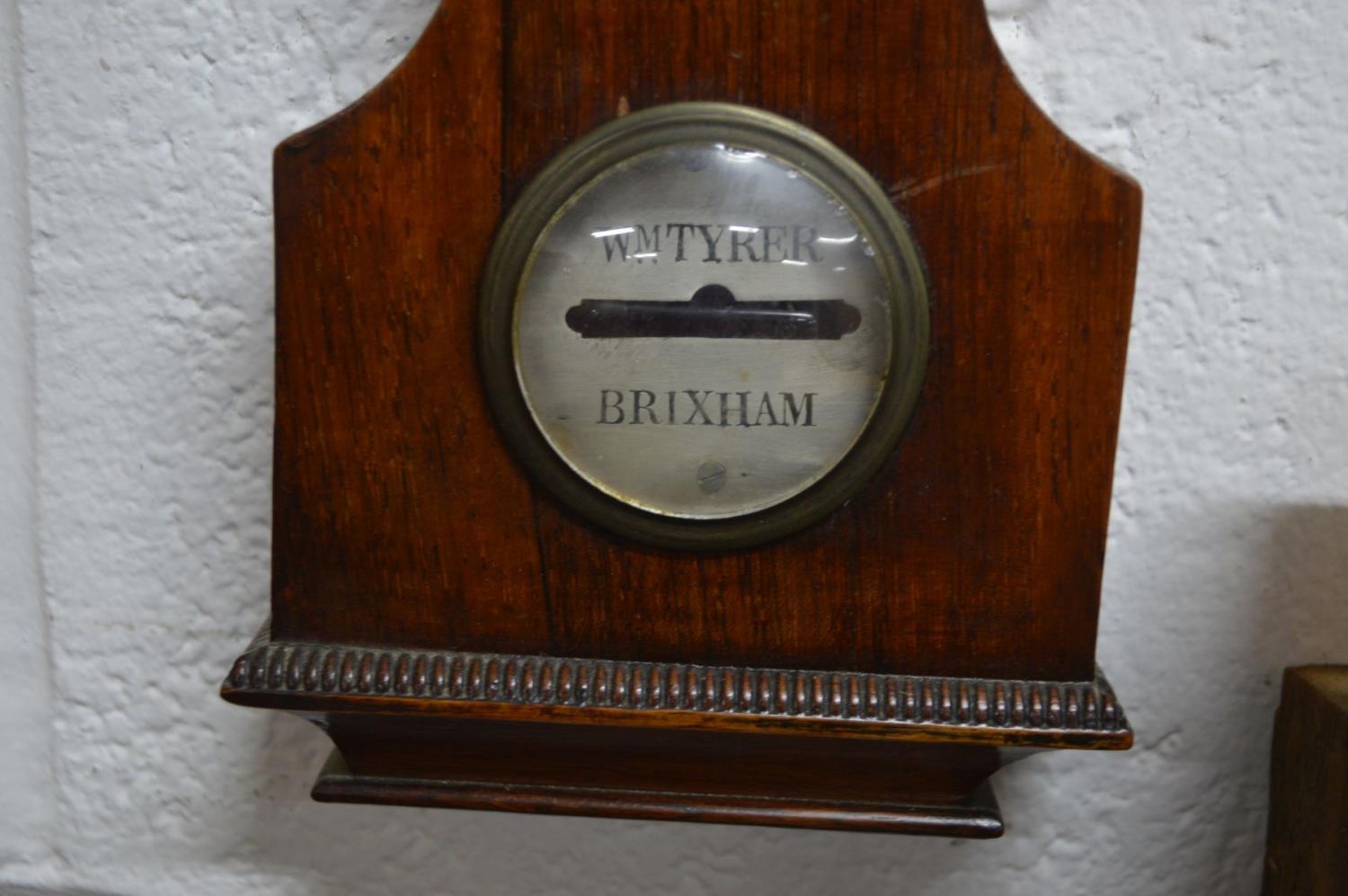 A GEORGIAN ROSEWOOD BANJO BAROMETER, named 'WMTYRER BRIXHAM' on silvered panel, with silvered dials, humidity gauge to top and swan neck pediment