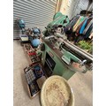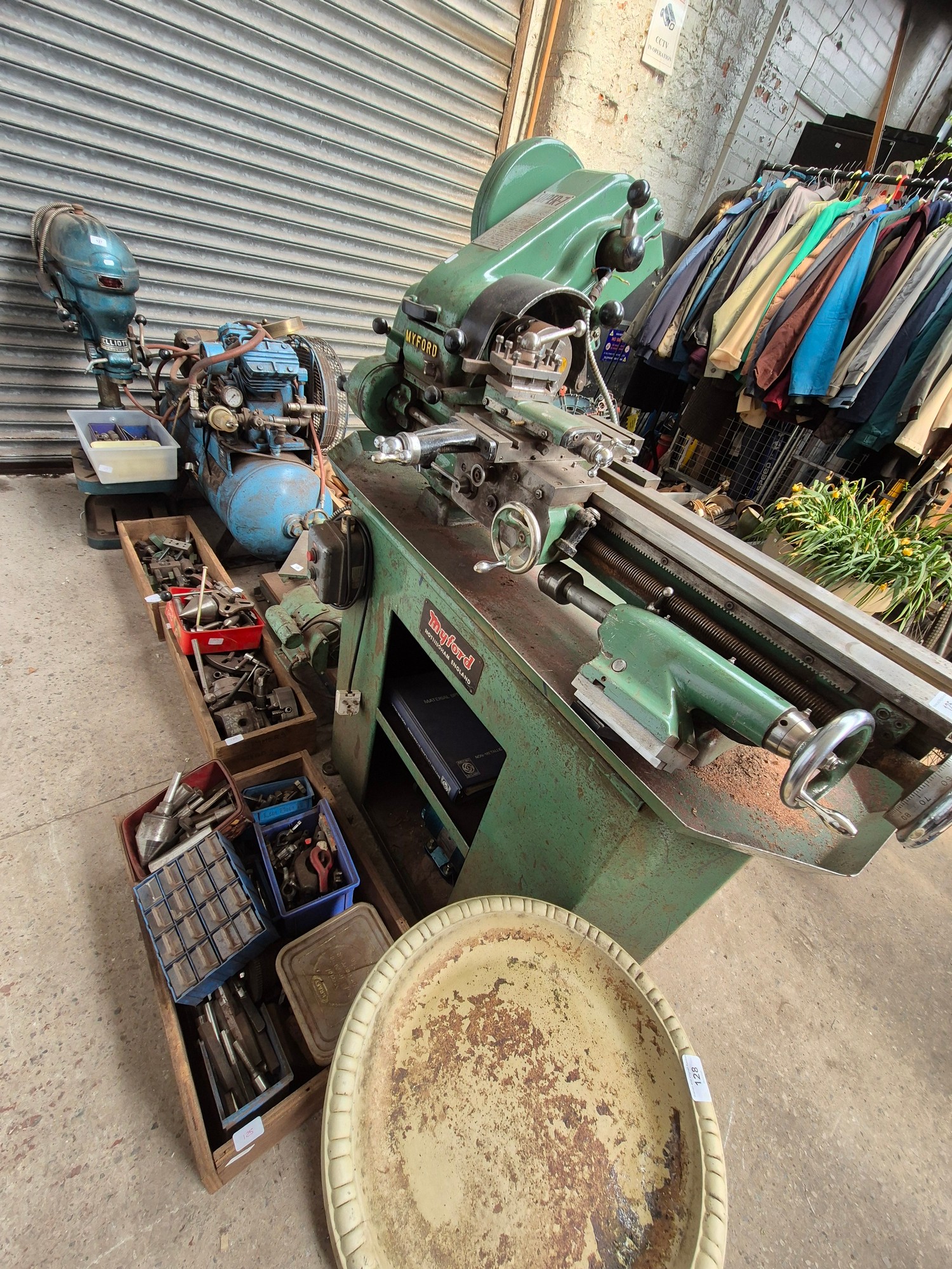 A Myford Super 7 lathe with disconnected Brooks Motors Gryphon motor and 4 boxes of accessories