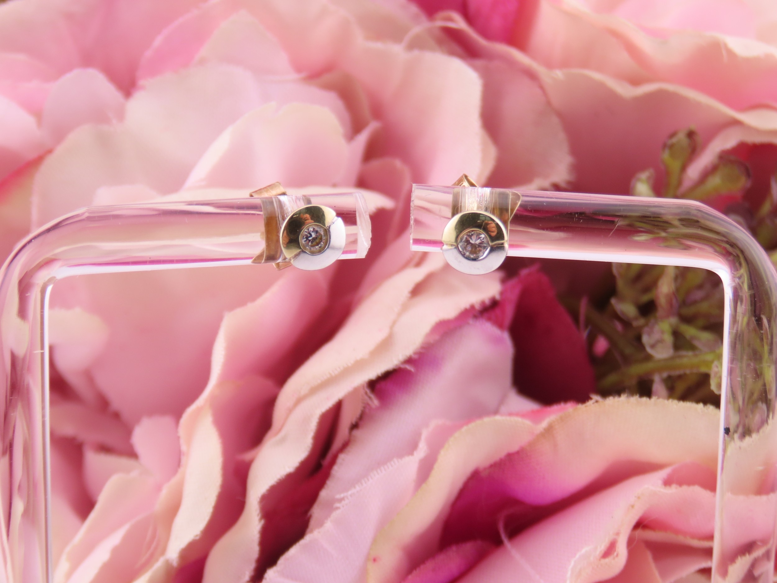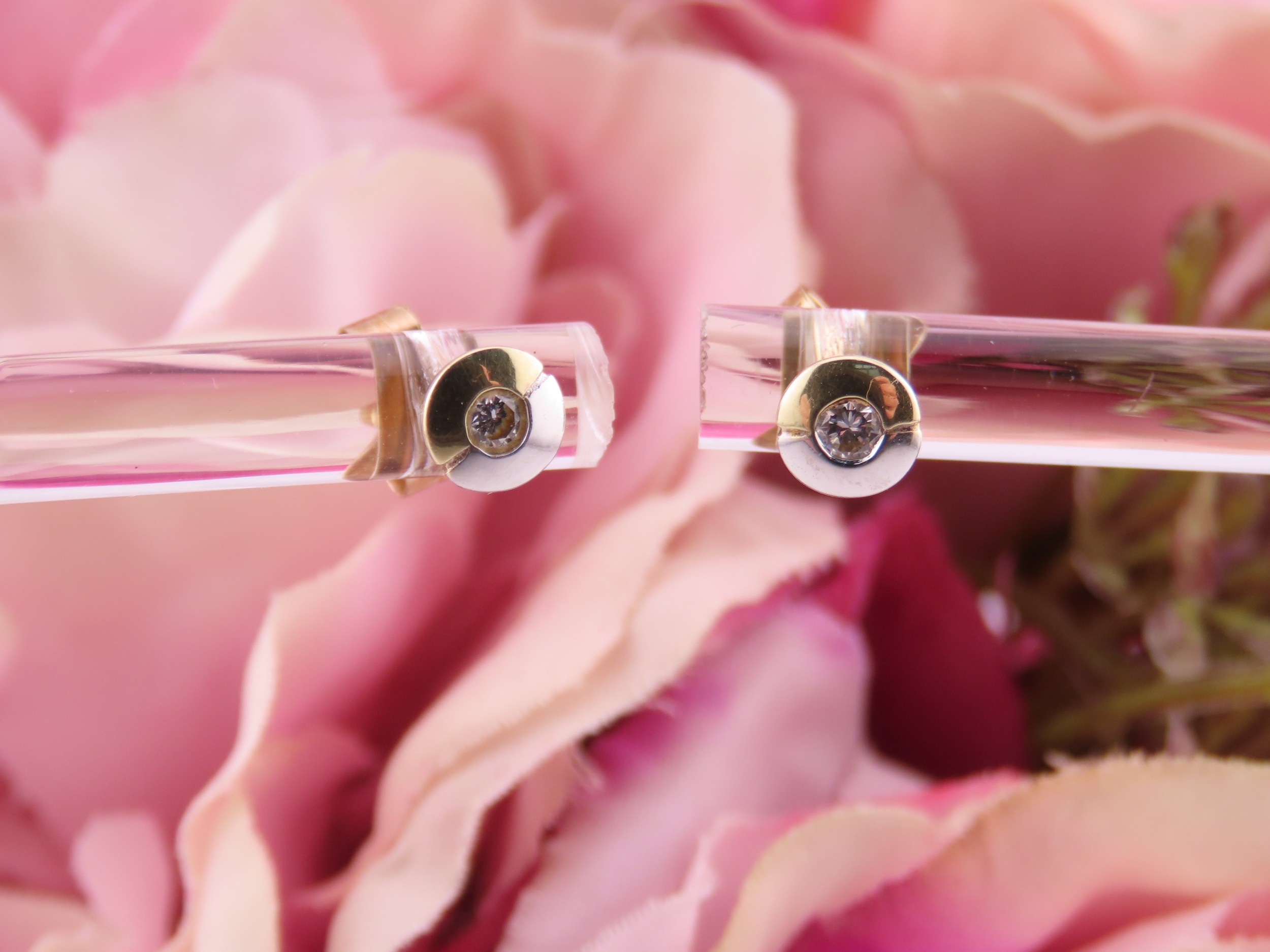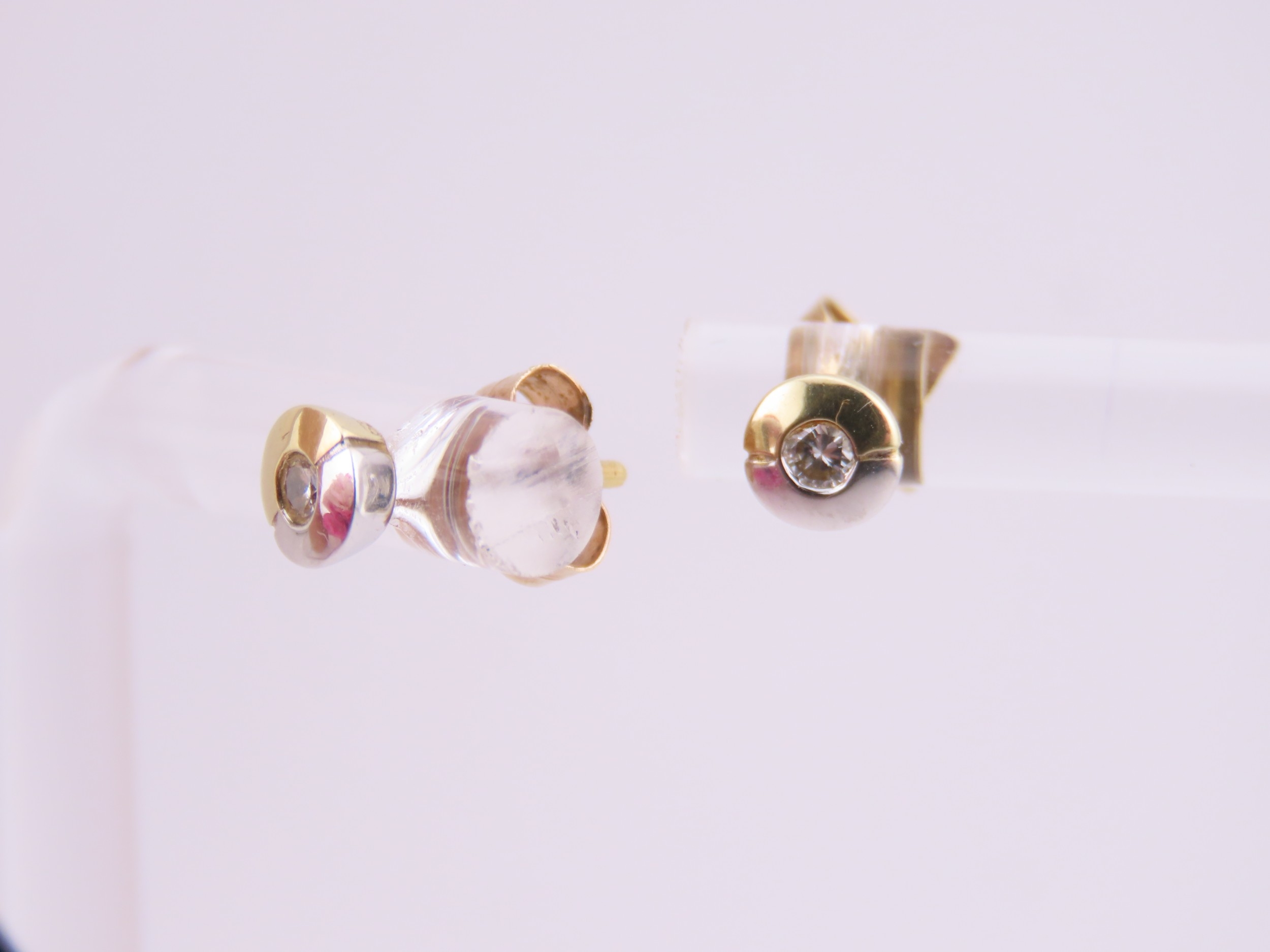 Pair of 14ct Two Tone Gold Diamond Set Earrings. Each centred with a small brilliant cut diamond in white gold collets mounted on yellow gold fittings. Gross weight 1.3 grams.
