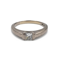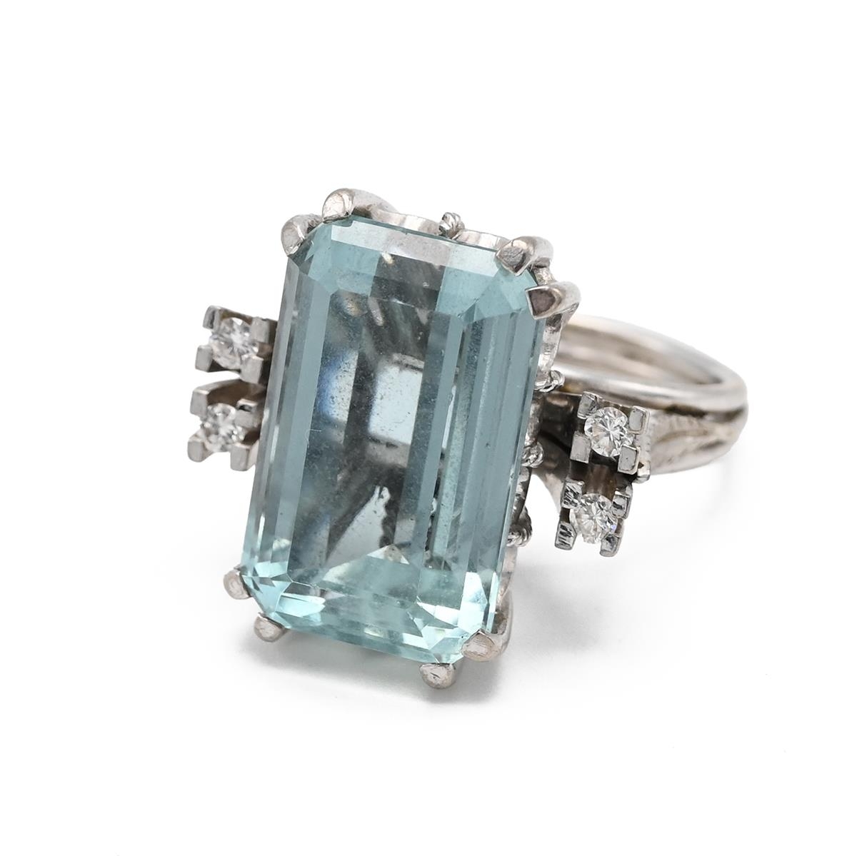 A 15ct white gold aquamarine and diamond cocktail ring, the step cut aquamarine approximately 17mm x 11mm, flanked by four round brilliant cut diamonds in prong settings, each approximately 0.02ct, ring size K, total gross weight approximately 11.3g. Unmarked but tested as 15ct. J
