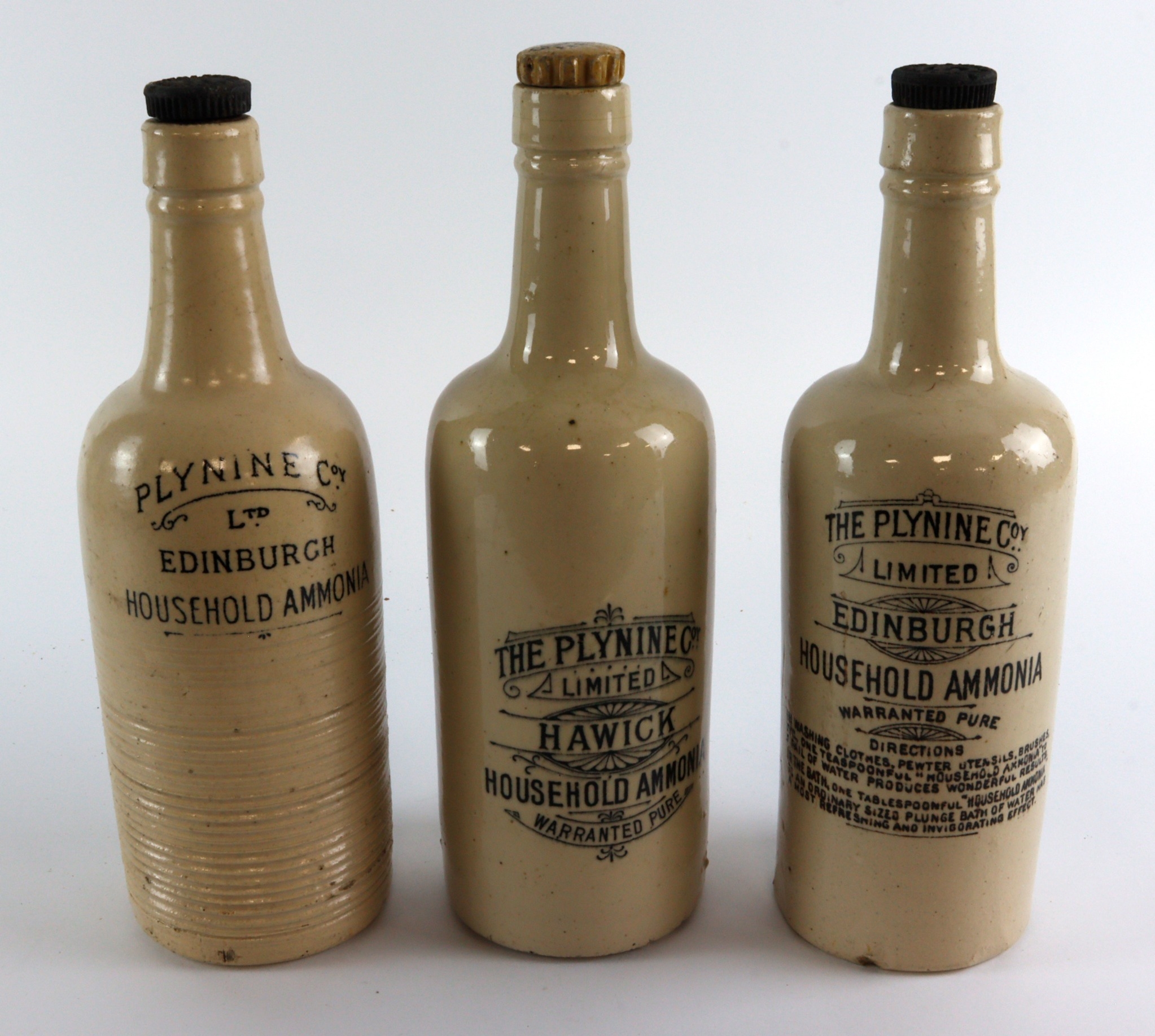 Plynine Co Ltd: Three Stoneware Pottery Bottles, comprising two Edinburgh and one Hawick, the Hawick bottle is made by Buchan of Edinburgh, and the pottery stopper is marked "Campbell of Perth"