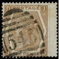1872 6d Pale chestnut Pl.12. Very fine used right hand wing margin example of this scarce ‘abnormal’ issue lettered JD, neatly cancelled by a Newcastle on Tyne ‘545’ numeral. 1981 RPS Certificate. SG124a. Cat. £3500