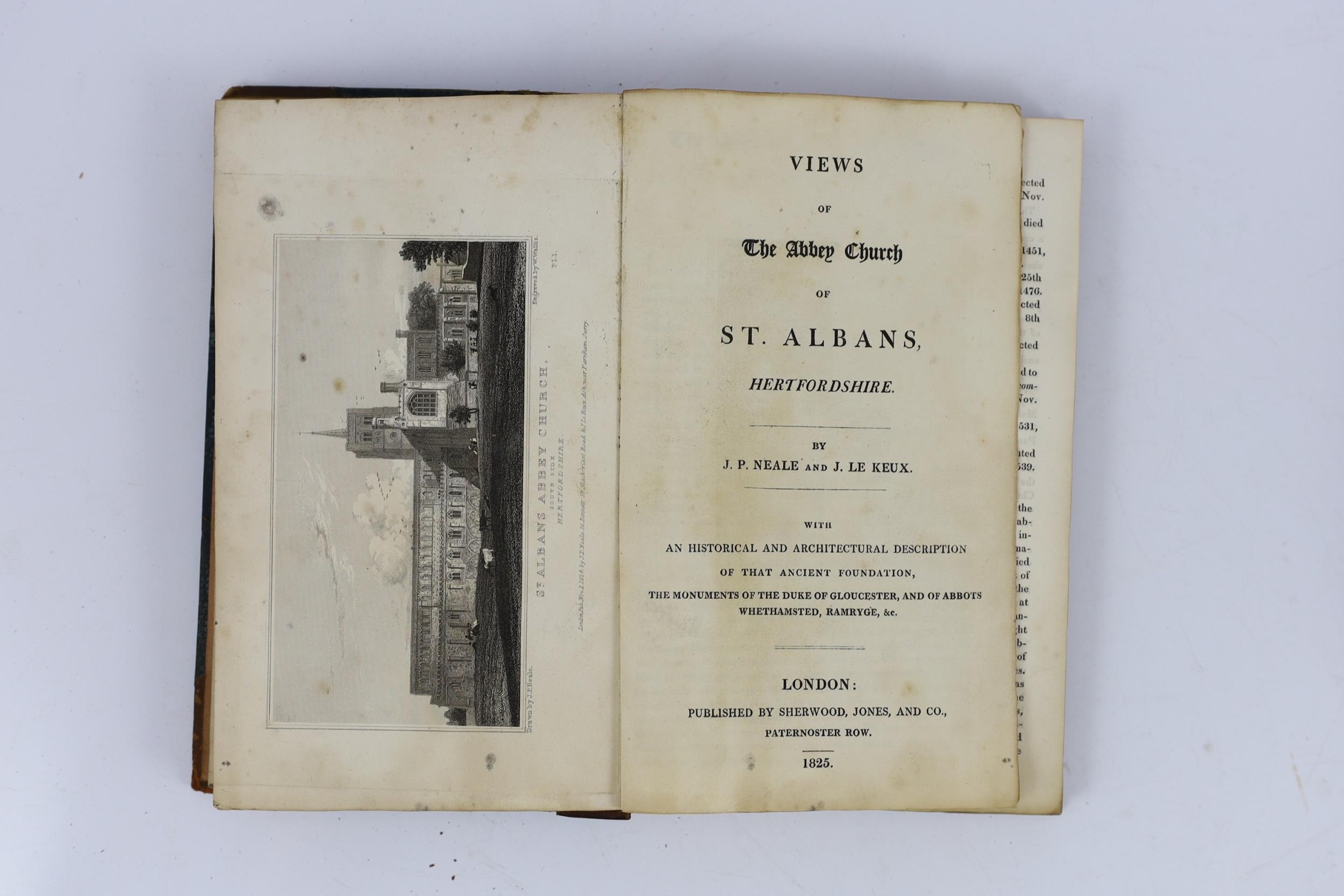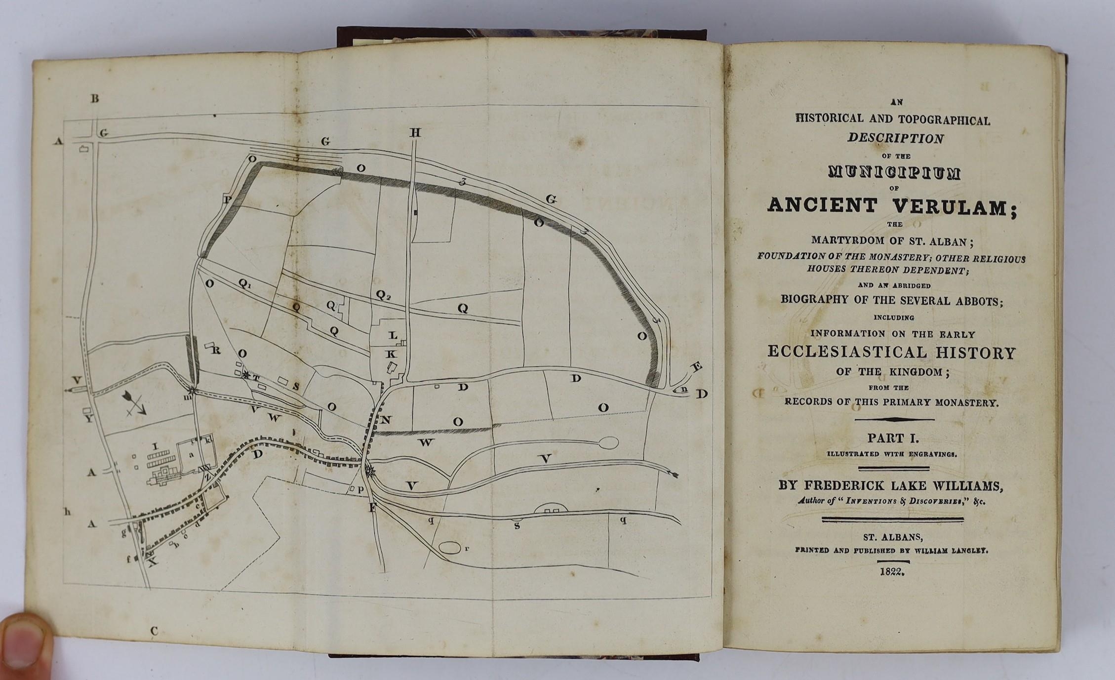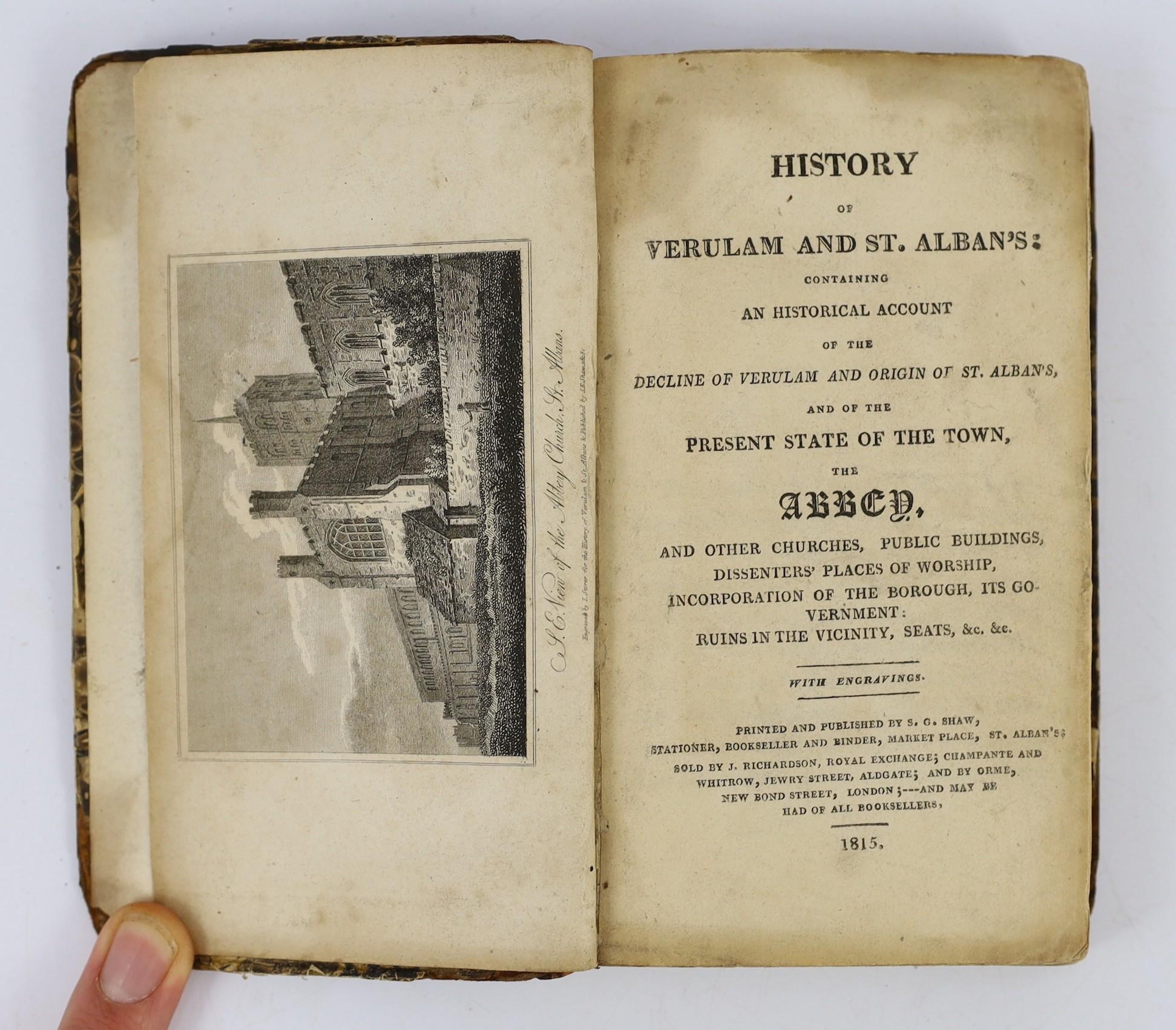 ° ° HERTS: A Short Account of Verulam and St. Albans ... old limp leather cloth, sm.cr.8vo. 1815; Williams, Frederick Lake - An Historical and Topographical Description of the Municipium of Ancient Verulam; the Martyrdom of St. Alban; Foundation of the Monastery ... 2 parts bound together. folded plan (and key leaf) and 4 plates, subscribers list; rebound half morocco and marbled boards. St Albans,1822; History of Verulam and St Alban's ... ruins in the vicinity, seats, &c. &c. folded plan (with key leaf) and 3 plates; old marbled boards and later morocco spine, 12mo. St. Alban's, 1815; Neale, J.R. and Le Keux, J - Views of the Abbey Church of St. Albans ... with an historical and architectural description ... 7 plates, text engravings; old half calf and marbled boards; bound with - (Nicholson, Rev. H.J.B.) The Abbey Church of Saint Alban ... for the use of visitors.; 4th edition. plan and other illus. 1874 (4)