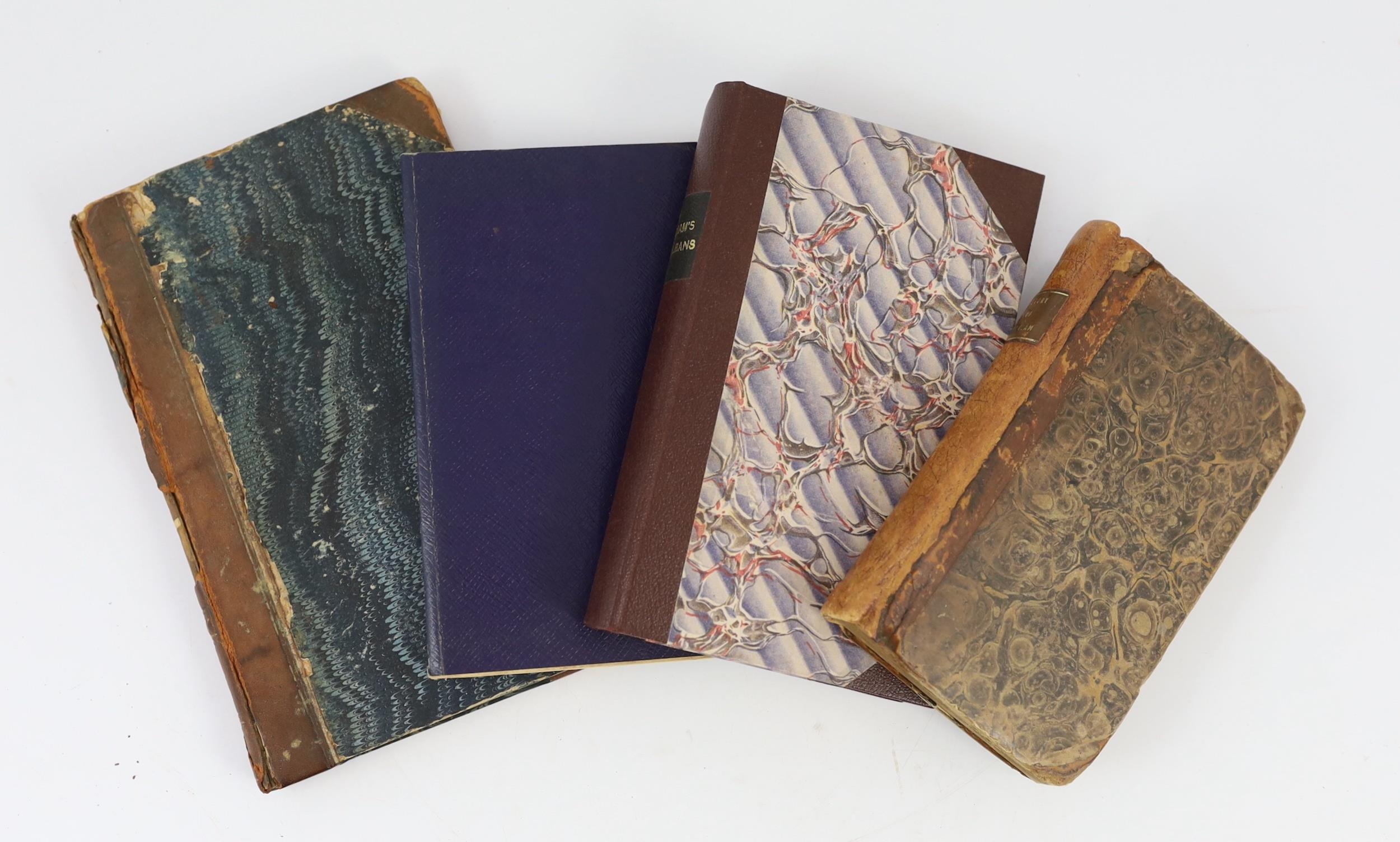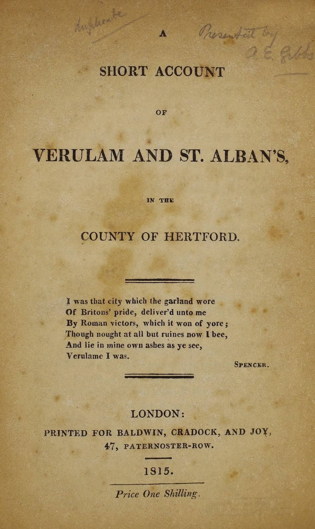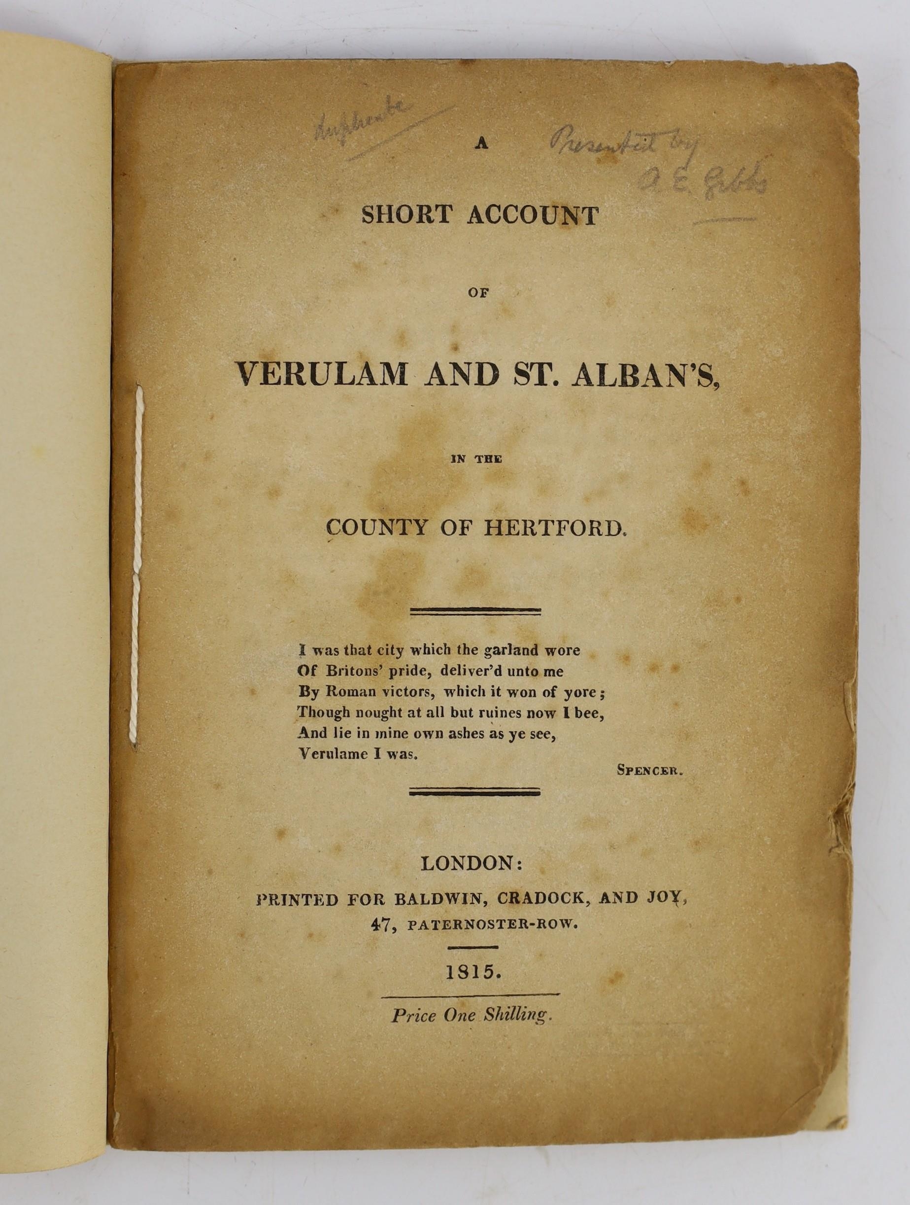° ° HERTS: A Short Account of Verulam and St. Albans ... old limp leather cloth, sm.cr.8vo. 1815; Williams, Frederick Lake - An Historical and Topographical Description of the Municipium of Ancient Verulam; the Martyrdom of St. Alban; Foundation of the Monastery ... 2 parts bound together. folded plan (and key leaf) and 4 plates, subscribers list; rebound half morocco and marbled boards. St Albans,1822; History of Verulam and St Alban's ... ruins in the vicinity, seats, &c. &c. folded plan (with key leaf) and 3 plates; old marbled boards and later morocco spine, 12mo. St. Alban's, 1815; Neale, J.R. and Le Keux, J - Views of the Abbey Church of St. Albans ... with an historical and architectural description ... 7 plates, text engravings; old half calf and marbled boards; bound with - (Nicholson, Rev. H.J.B.) The Abbey Church of Saint Alban ... for the use of visitors.; 4th edition. plan and other illus. 1874 (4)