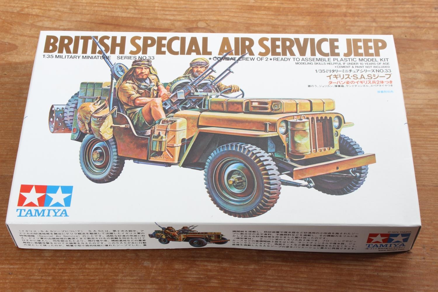 A boxed Tamiya British Special Air Service jeep series No 33 model kit.