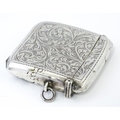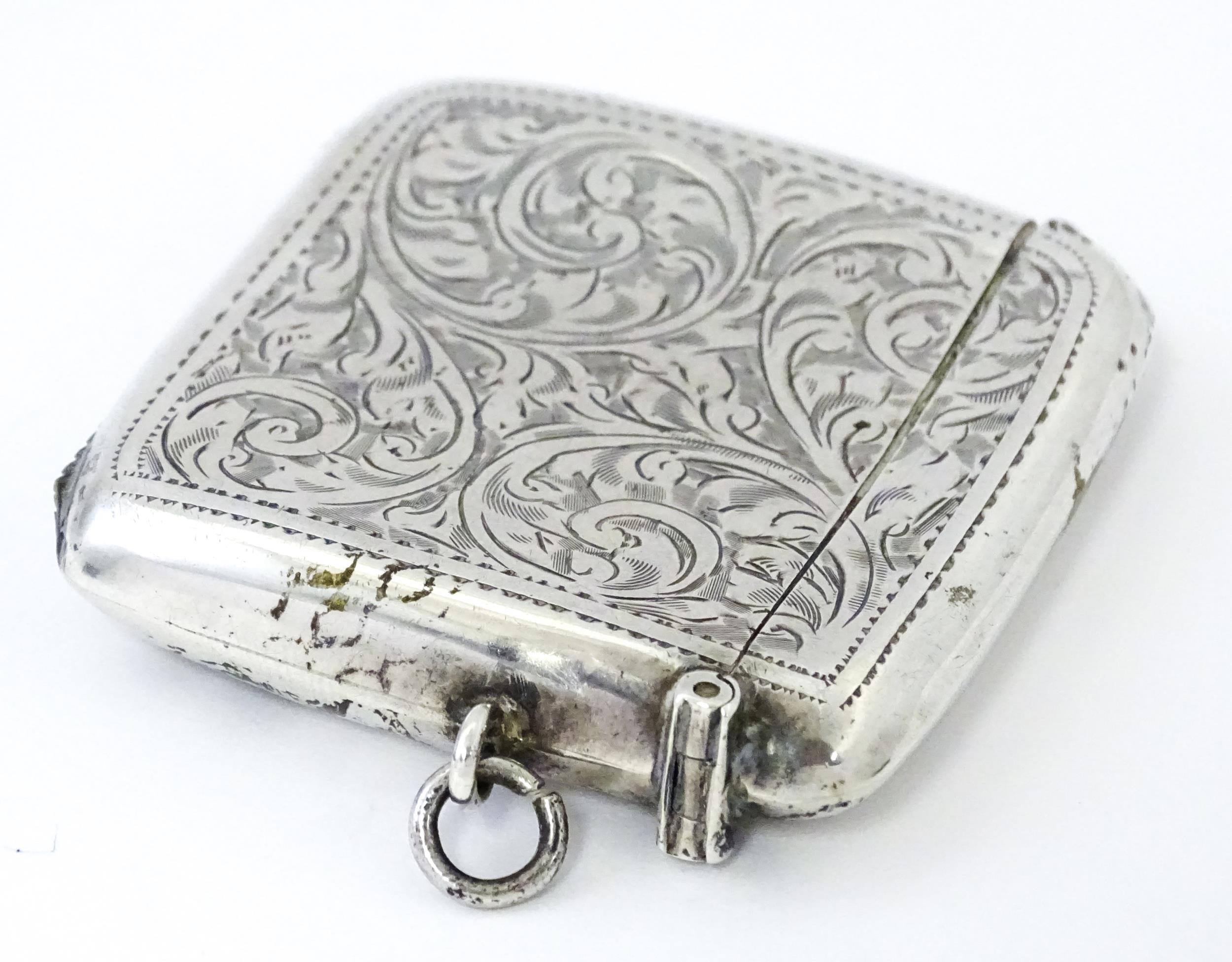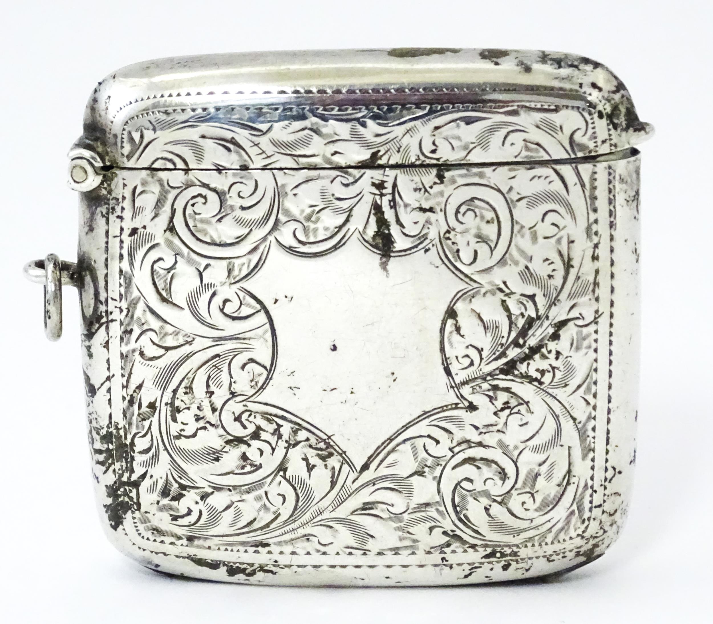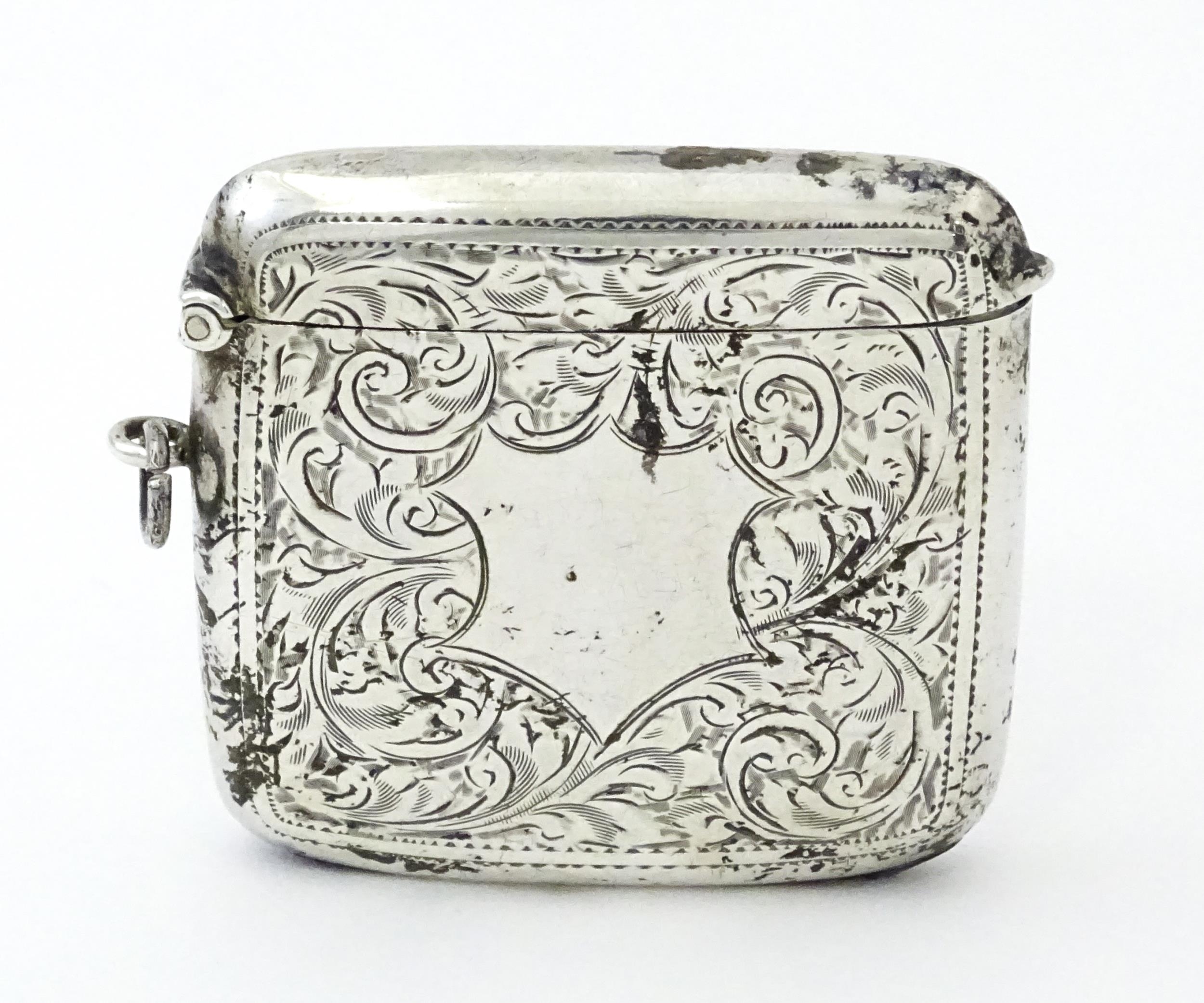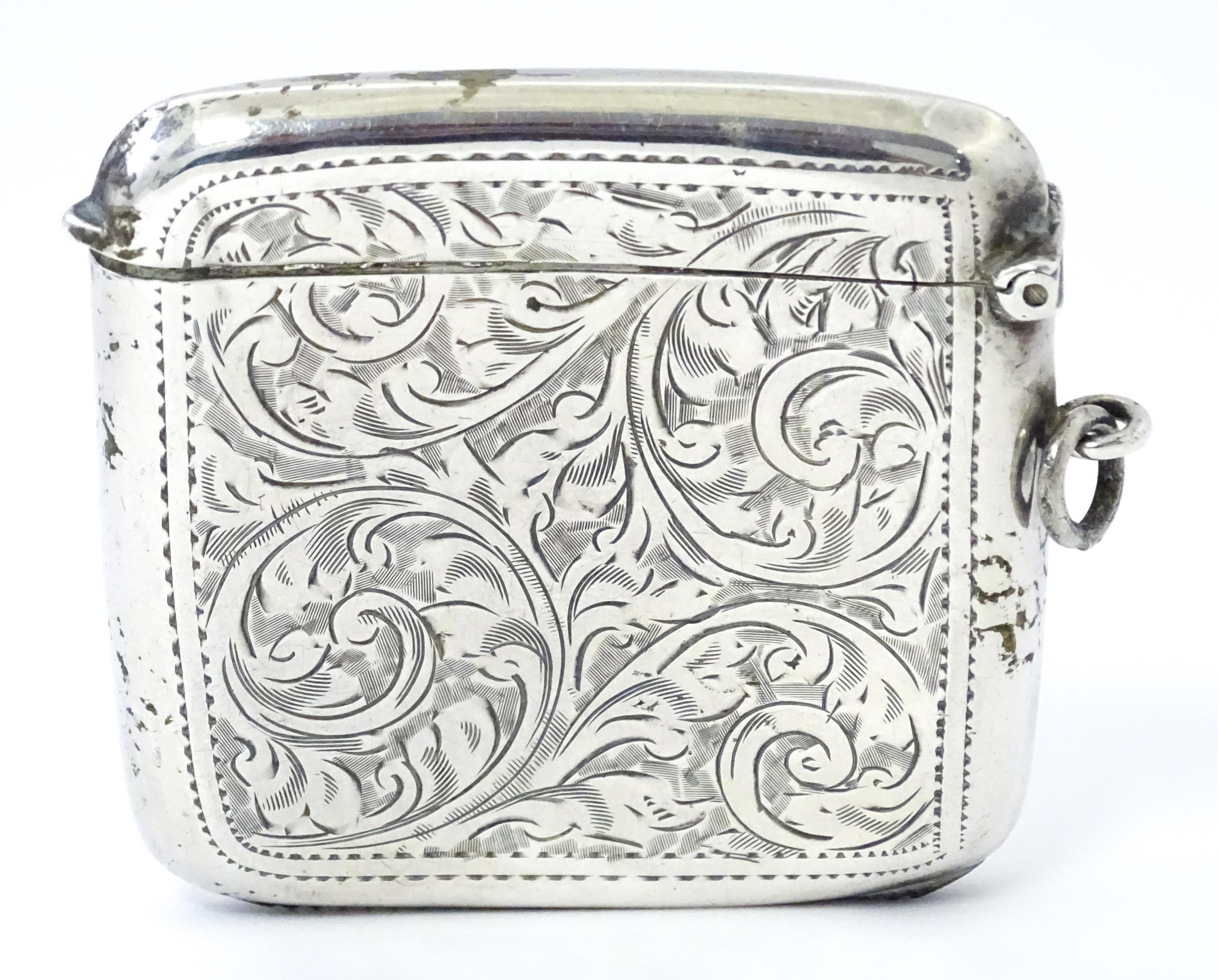 A large silver vesta case with engraved acanthus scroll decoration, hallmarked Birmingham 1921, maker William Hair Haseler. Approx. 2" high