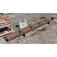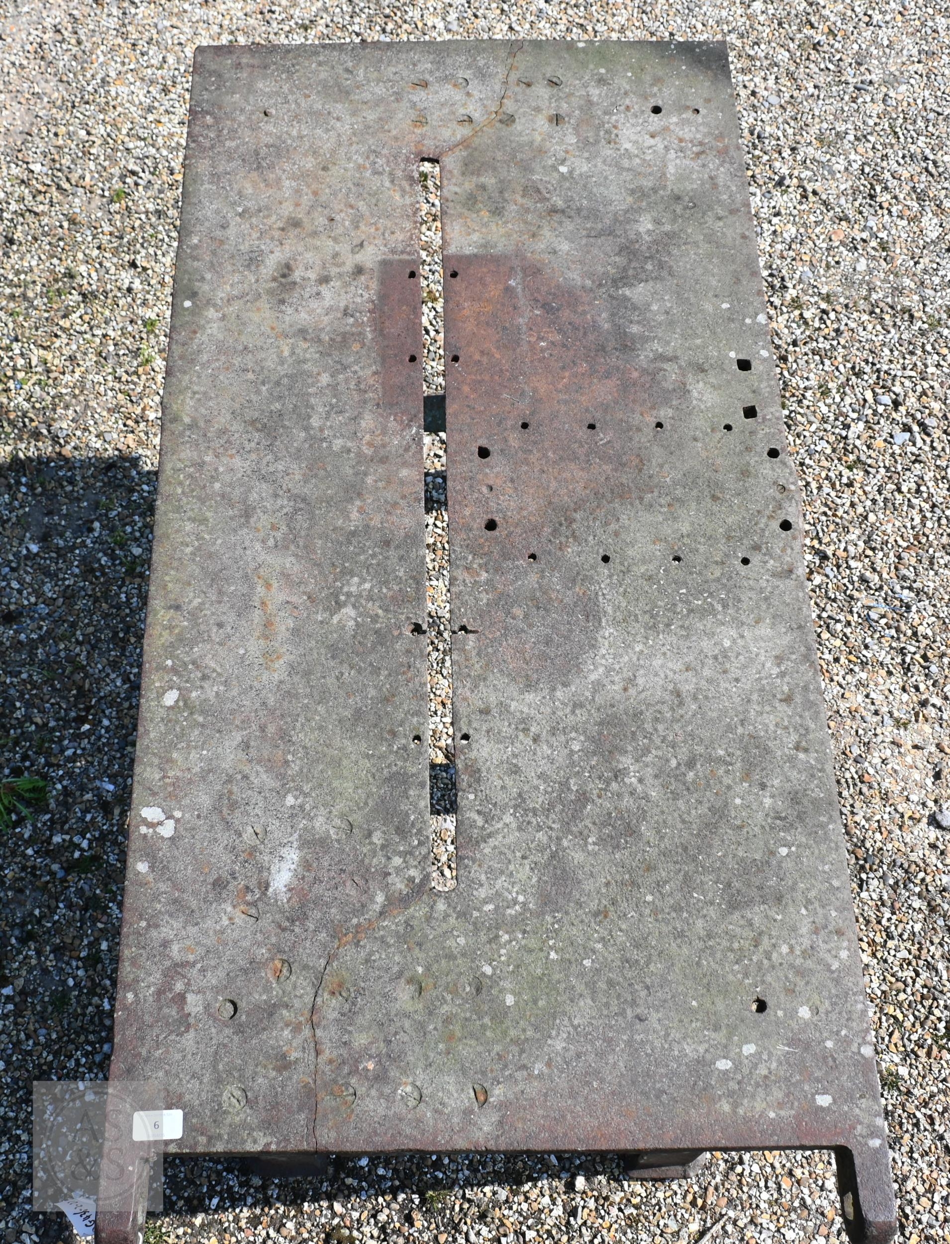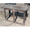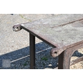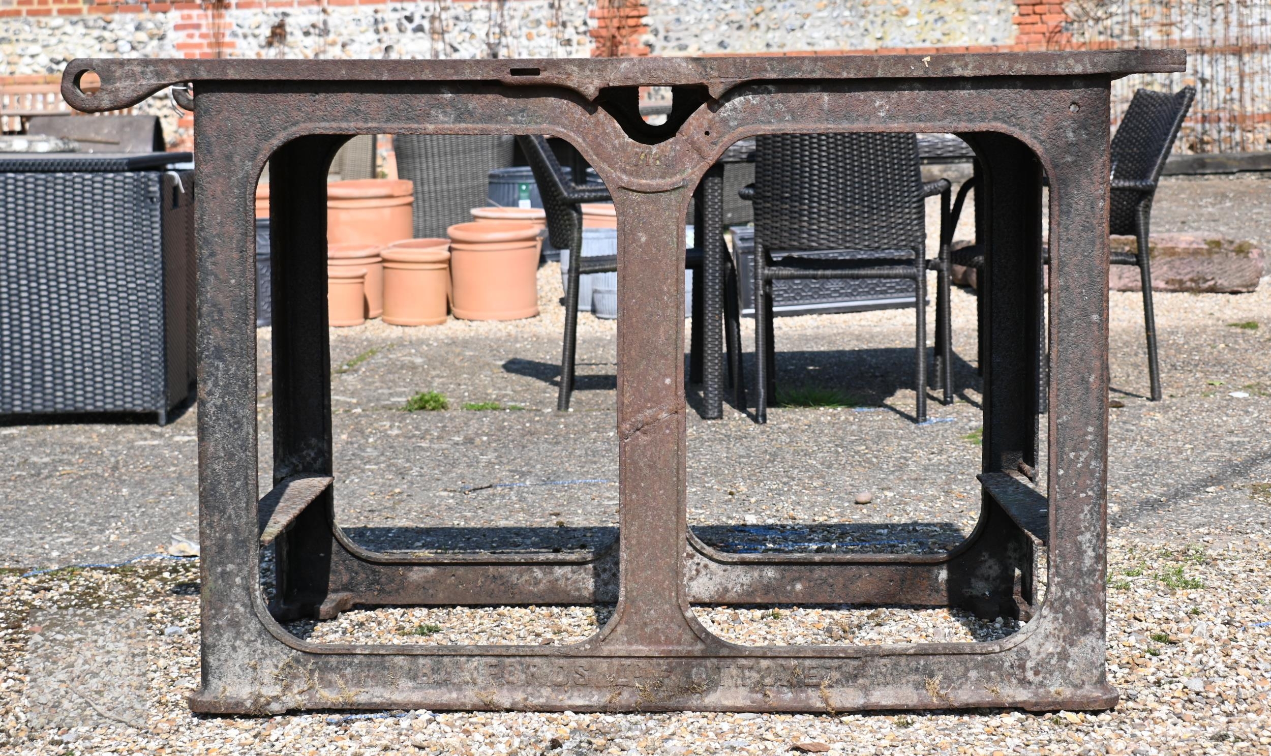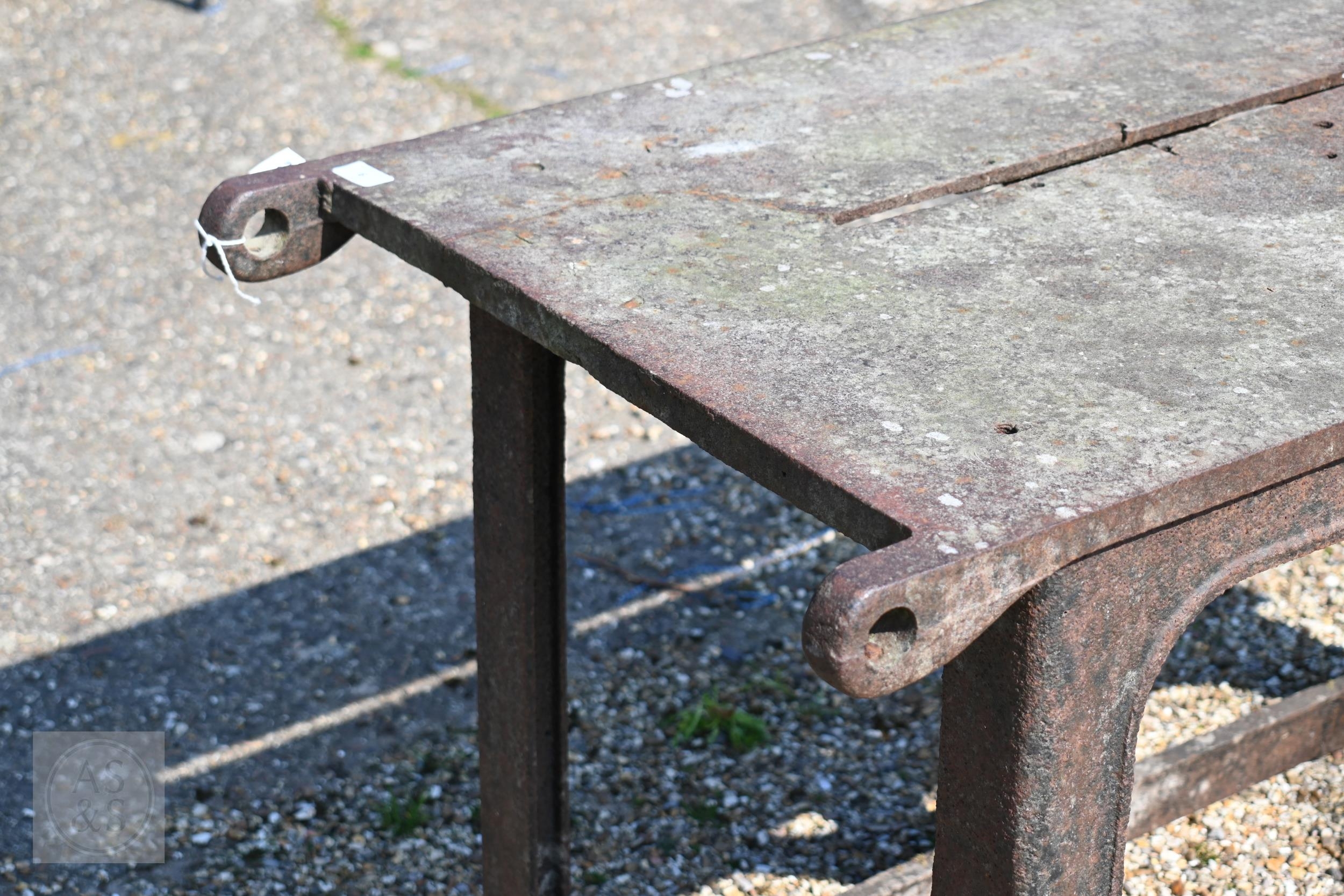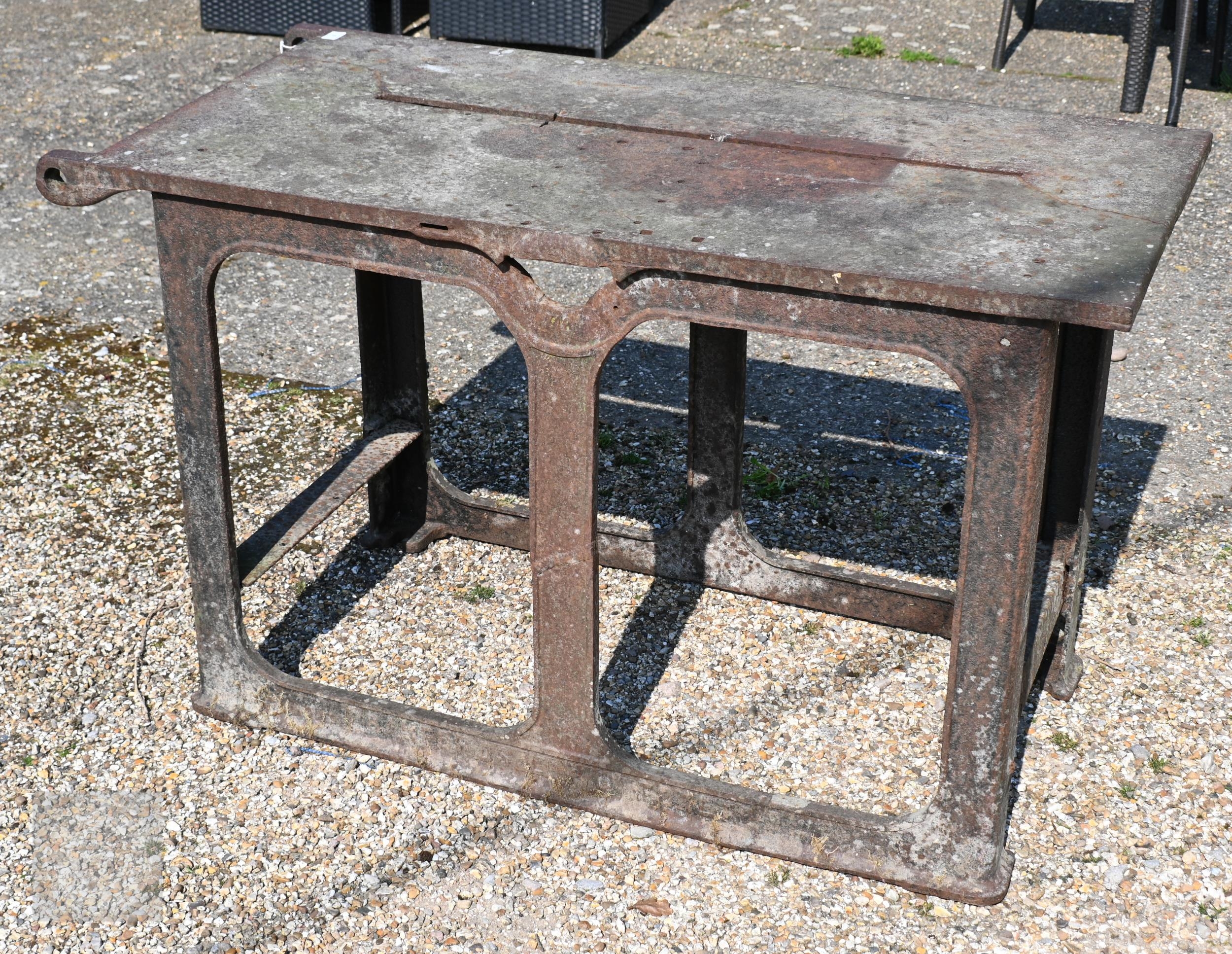 Bamfords Ltd, Uttoxeter, an old weathered cast iron agricultural saw bench table, 127 cm x 61 cm x 76 cm h, incomplete, weathered and a/f