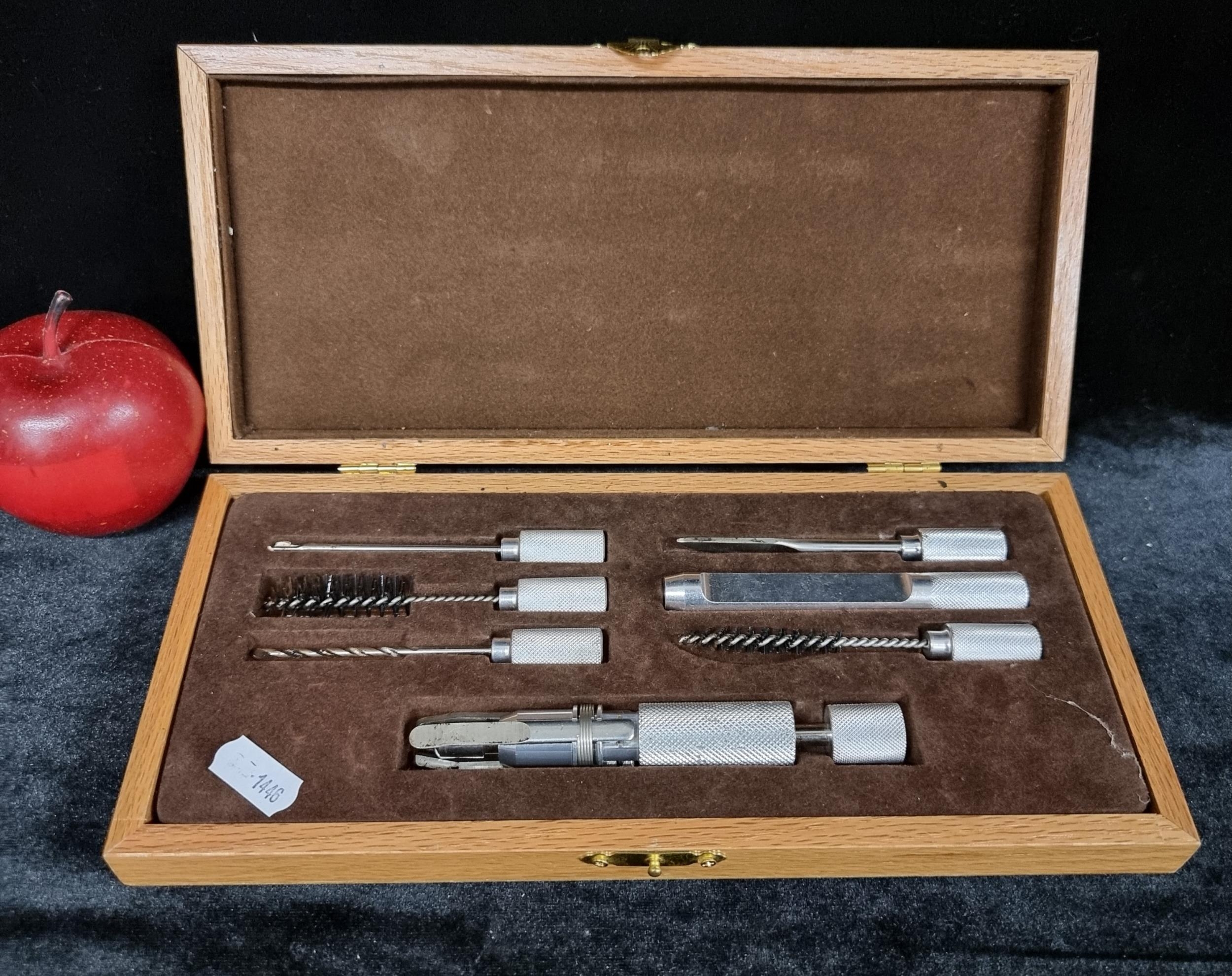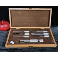 A vintage pipe cleaning set with seven stainless steel cleaning tools housed in original presentation box.