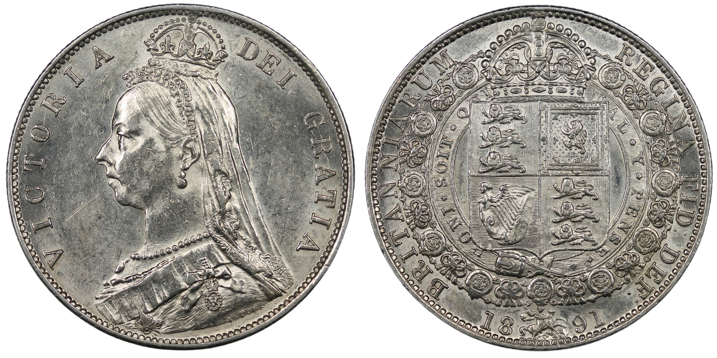 1891 Half Crown, Victoria Jubilee head. Lustrous and vibrant, one of the more difficult years of the series to find in higher grades. Obverse wiped, aUNC. [ESC 724, Bull 2776, S.3924]