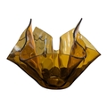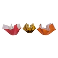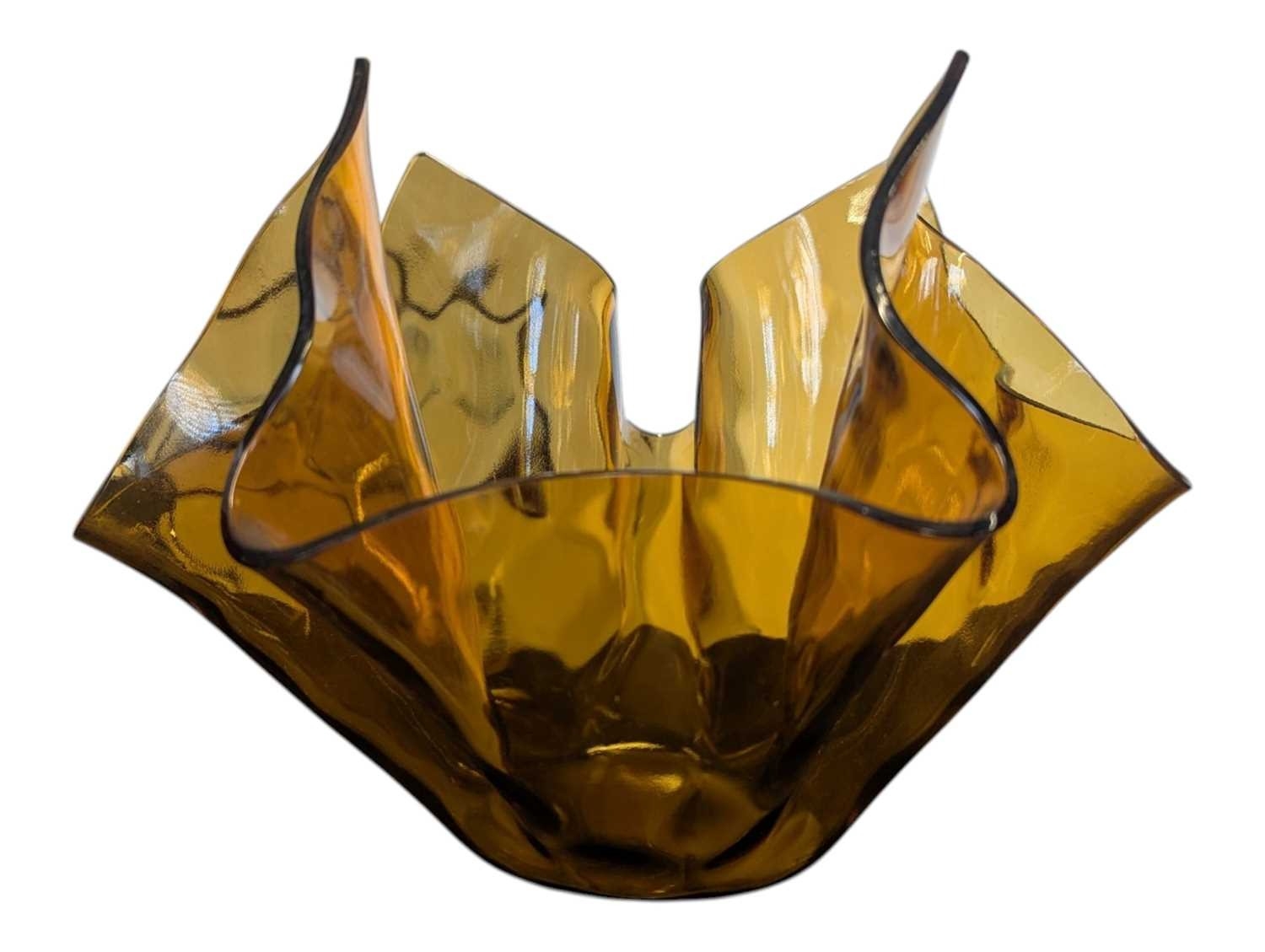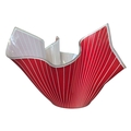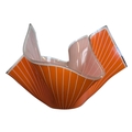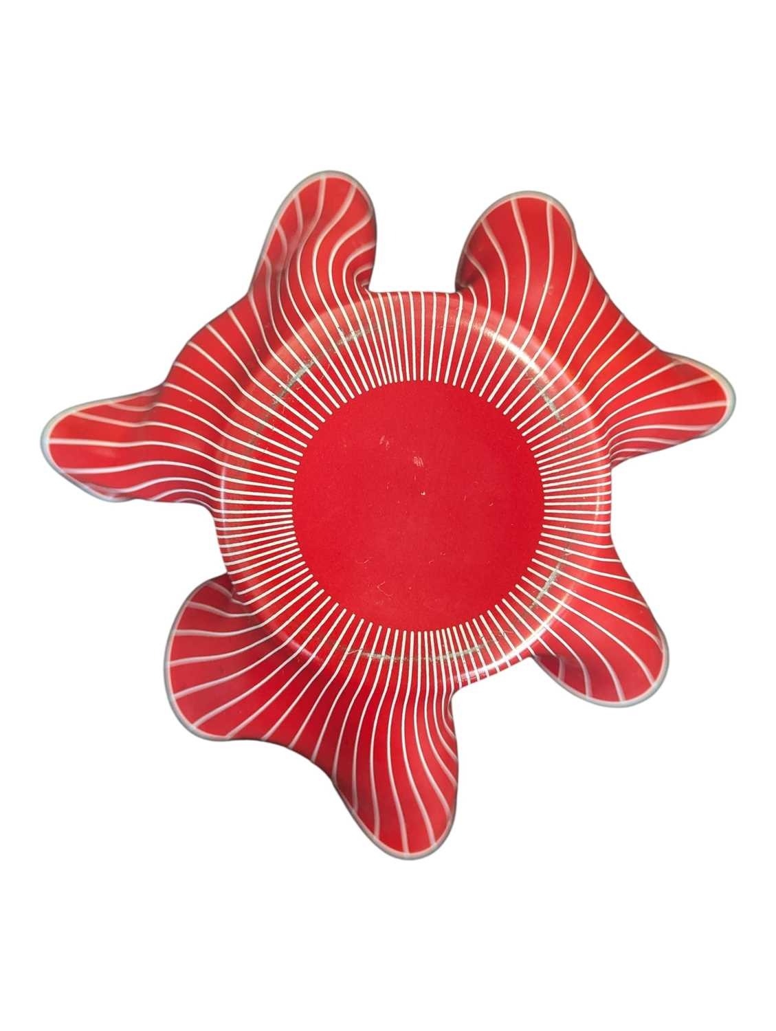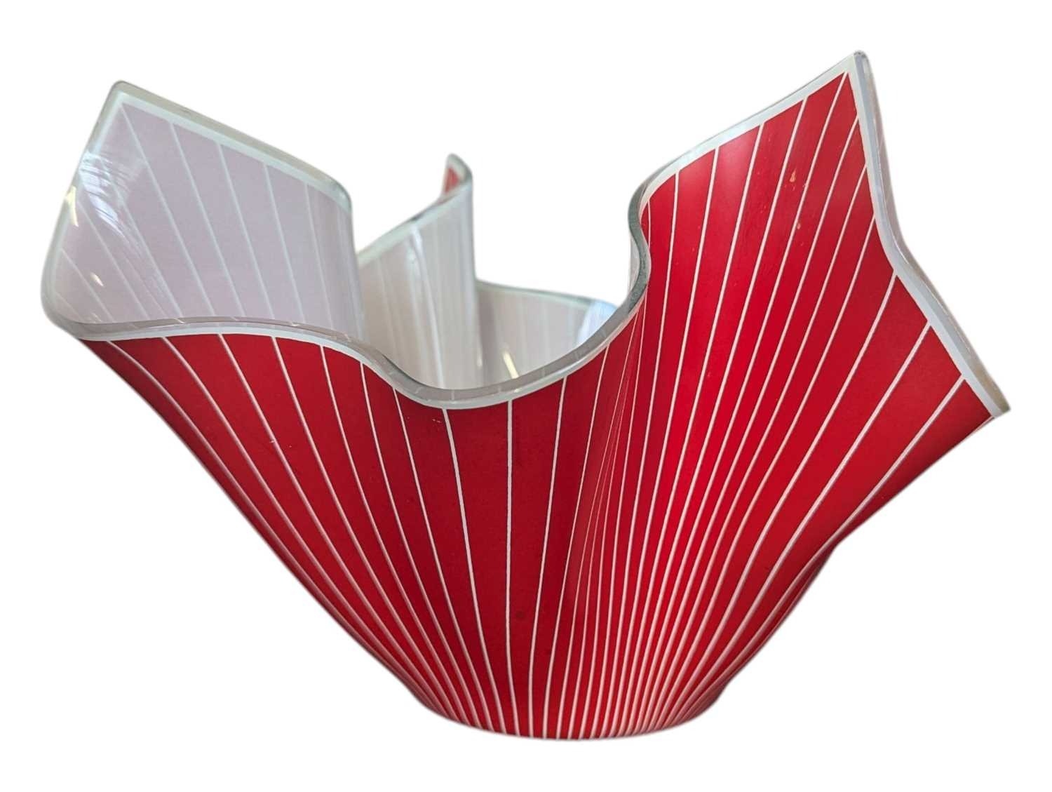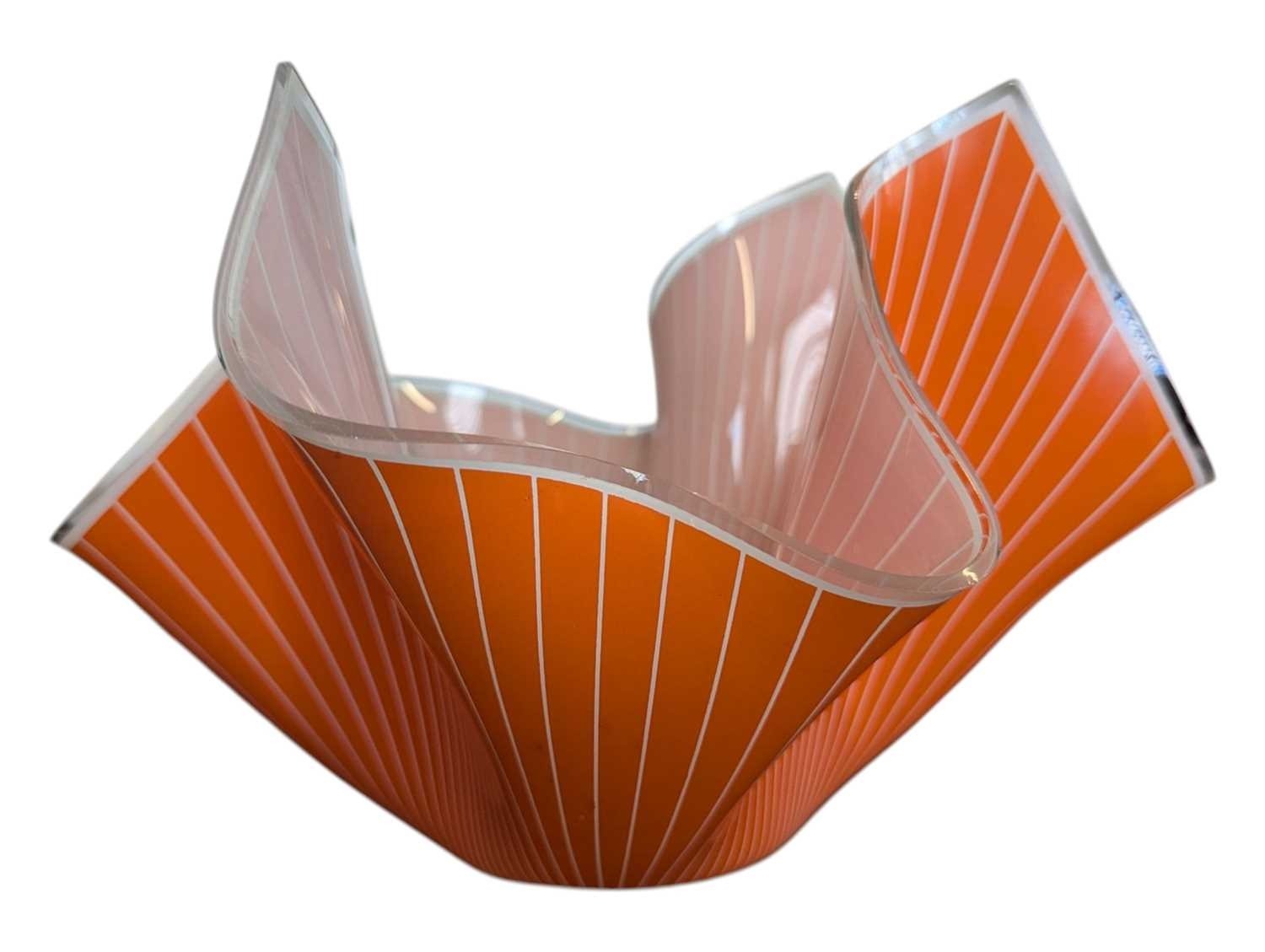 Chance Brothers Glass -Three vintage mid 20th century Chance Brothers art glass handkerchief bowls / vases. The collection features, red and clear orange glass examples. Striped pattern with white borders. Measures approx. 17cm height