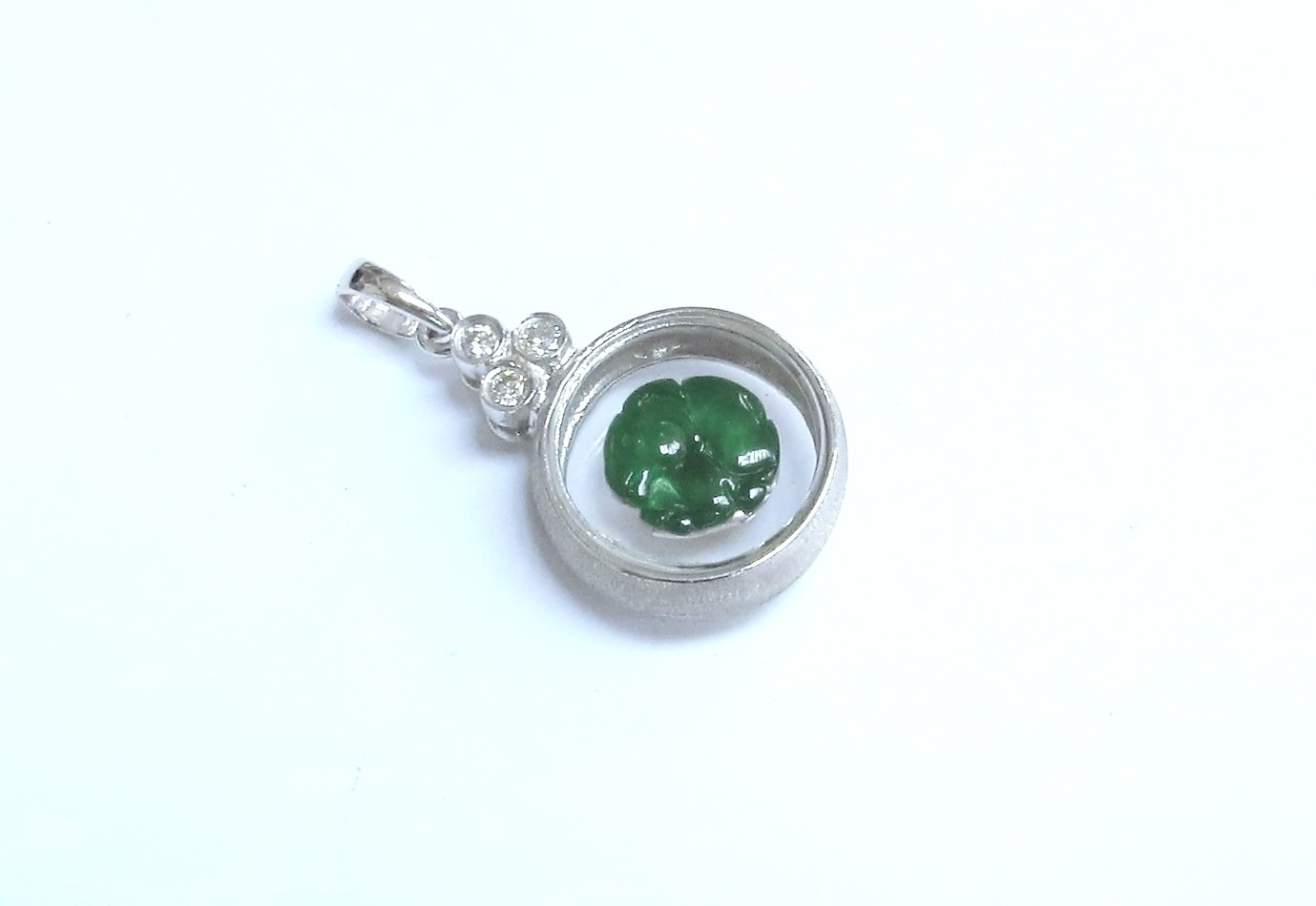 A white gold pendant with glass cased carved jade goat to centre in set with three diamonds atop, stamped 18k, 2.5cm drop, 3.9g